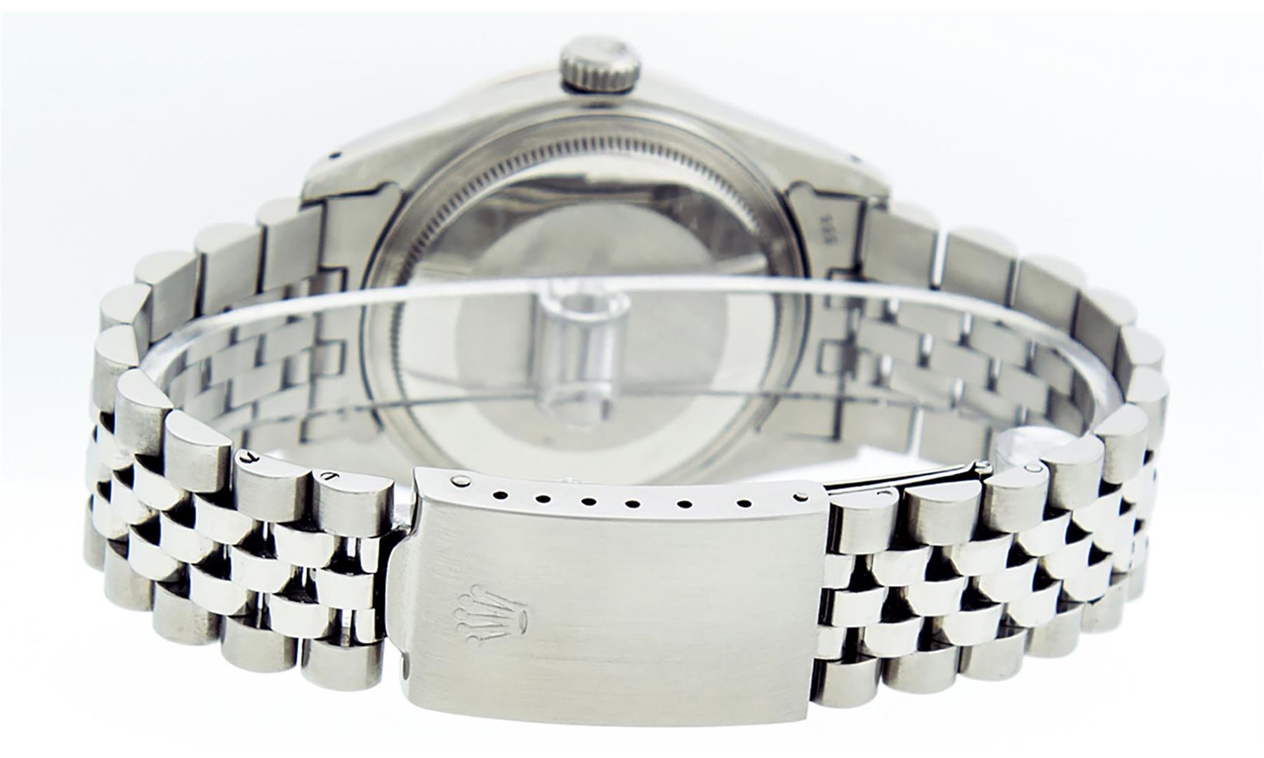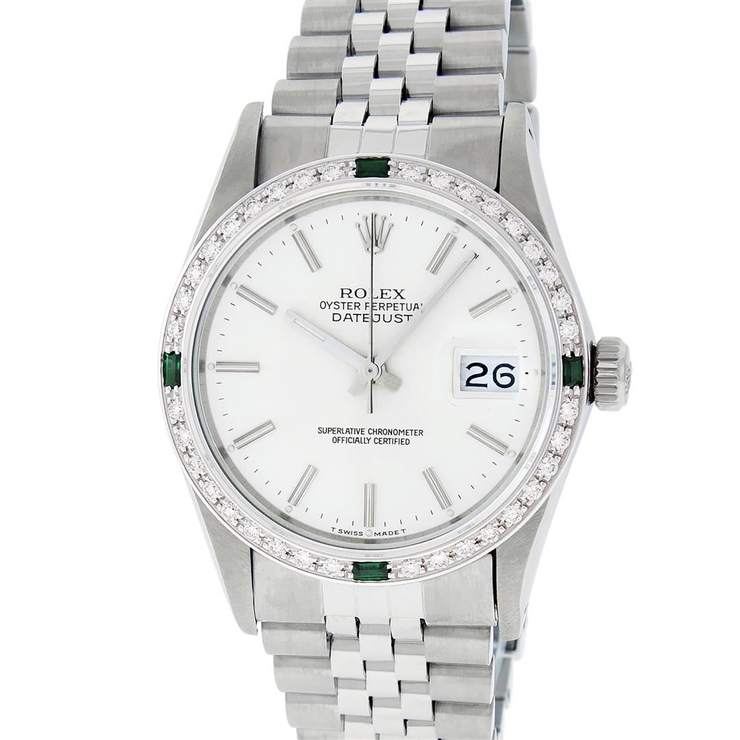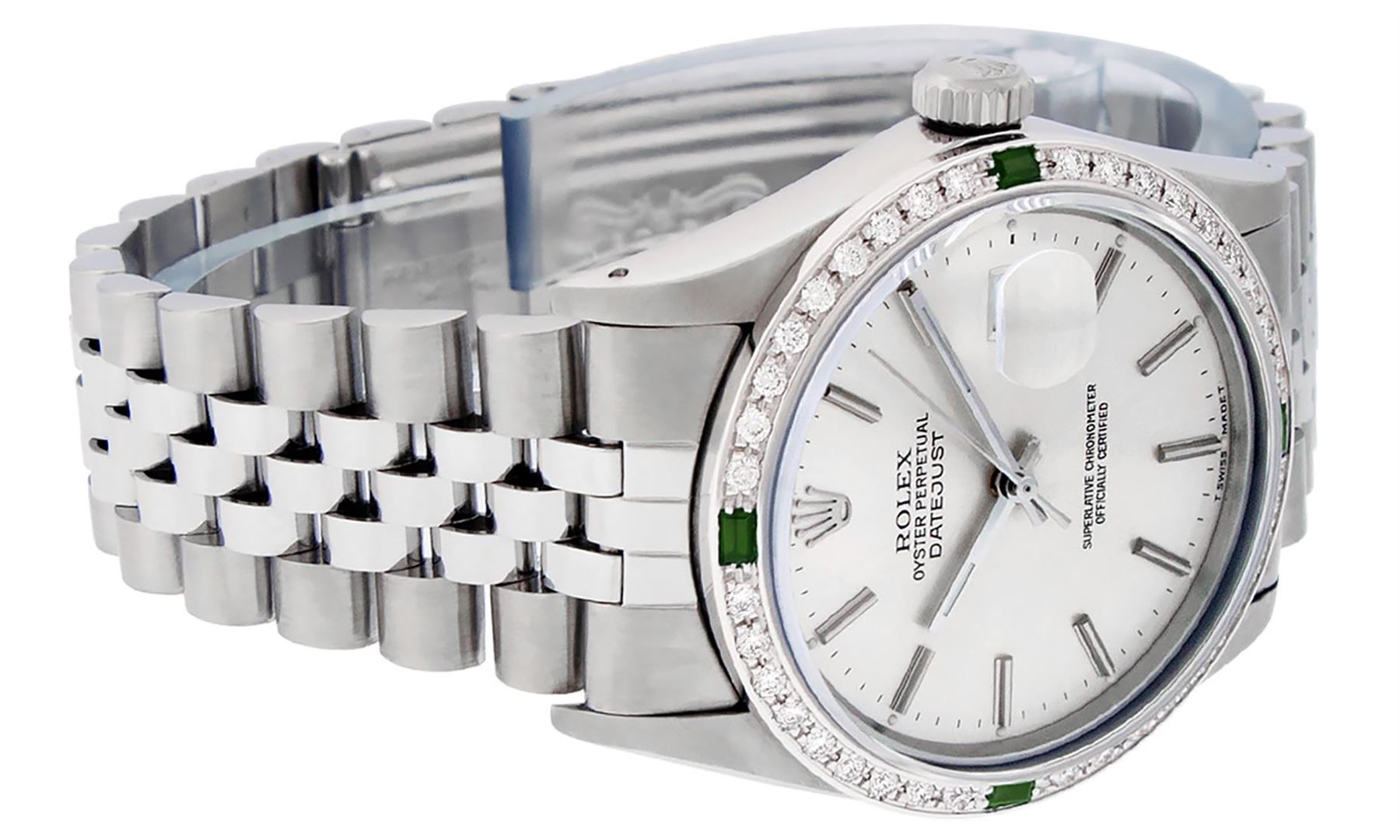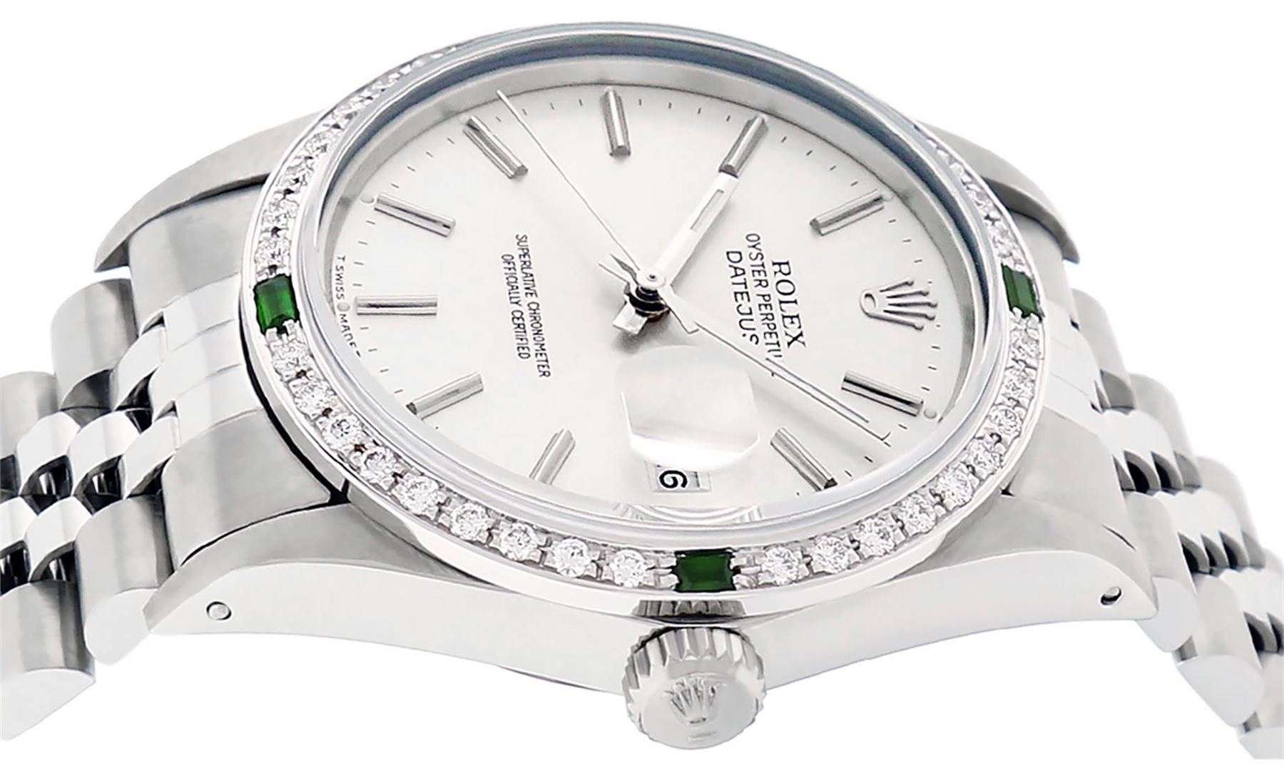 One Mens Pre Owned Stainless Steel Rolex Datejust Polished Bright with Satin Finish, This Watch Has Been Serviced & Electronically Tested, Rolex Stainless Steel Case: 36mm, Rolex Stainless Steel Crown, Custom Bezel: New 18K White Gold Emerald Beadset Diamond Bezel, Diamond + Gem Count: 36 Diamonds + 4 Emeralds, Total Weight 1.00 Carat, Clarity: SI-VS, Color: G to H. Custom Crystal: New Sapphire With Date Window. Custom Hands: New Luminescent Hands. Rolex Movement: Automatic Winding Movement 3035. Rolex Dial: Silver Index With Dash Track & Lumi Dots. Date Window: 3 O'Clock Position Date Display, Quickset, Model: Datejust, Condition: G-6 Extra Fine. Rolex Bracelet: Stainless Steel Jubilee Band. Bracelet: 7.0 Inch Length, Adjustable. Standard Clasp, With Rolex Logo. This Watch Has Been Serviced Time Tested And Is In Excellent Condition It Is Free Of All Scratches And Dents.