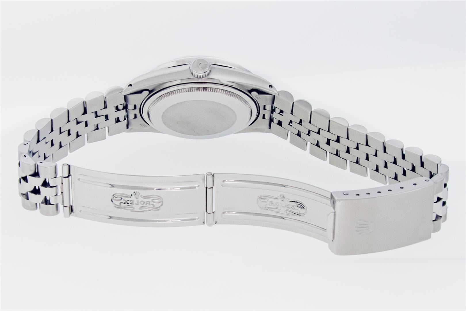 One Mens Pre Owned Rolex Datejust Polished Bright with Satin Finish, This Watch Has Been Serviced & Electronically Tested, Rolex Stainless Steel Case: 36mm, Rolex Stainless Steel Crown, Custom Bezel: New 18K White Gold Bead-set Diamond Bezel, Diamond Count: 44 Diamonds, Clarity: SI-VS, Color: G to H. Custom Crystal: New Sapphire With Date Window. Custom Hands: New Luminescent Hands. Rolex Movement: Automatic Winding Movement. Rolex Dial: Silver Index Dial With Dash Track And Lumi Dot. Date Window: 3 O'Clock Position Date Display, Quickset, Model: Datejust, Condition: G-6 Extra Fine. Rolex Bracelet: Stainless Steel Jubilee Band. Bracelet: 7.0 Inch Length, Adjustable. Standard Clasp, With Rolex Logo. This Watch Has Been Serviced Time Tested And Is In Excellent Condition It Is Free Of All Scratches And Dents.