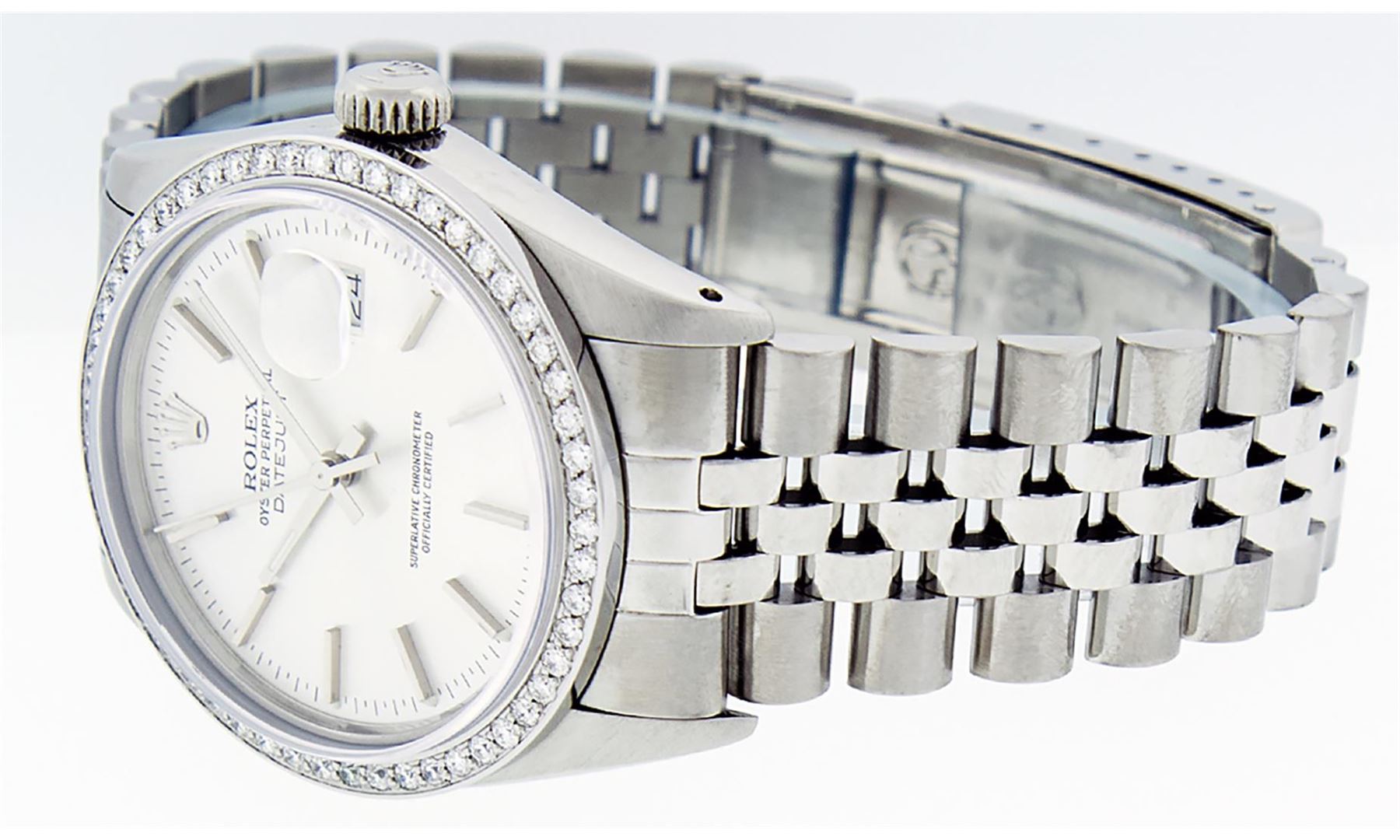 One Mens Pre Owned Rolex Stainless Steel Datejust Polished Bright with Satin Finish, This Watch Has Been Serviced & Electronically Tested, Stainless Steel Case: 36mm, Rolex Stainless Steel Crown, Custom Bezel: New Stainless Steel Beadset Diamond Bezel, Diamond Count: 54 Diamonds, Total Weight 1.00 Carat, Clarity: SI-VS, Color: G to H. Custom Crystal: New Sapphire With Magnified Date Window. Custom Hands: New Luminescent Hands. Rolex Movement: Automatic Winding Movement 3035. Rolex Dial: Silver Index Dial With Lumi Dots & Dash Track. Date Window: 3 O'Clock Position Date Display, Quickset, Model: Datejust. Condition: G-6 Extra Fine. Rolex Bracelet: Stainless Steel Jubilee Band. Bright Polish & Satin Finish. 7.0 Inch Length, Adjustable. Standard Clasp, With Rolex Logo. This Watch Has Been Serviced Time Tested And Is In Excellent Condition It Is Free Of All Scratches And Dents.