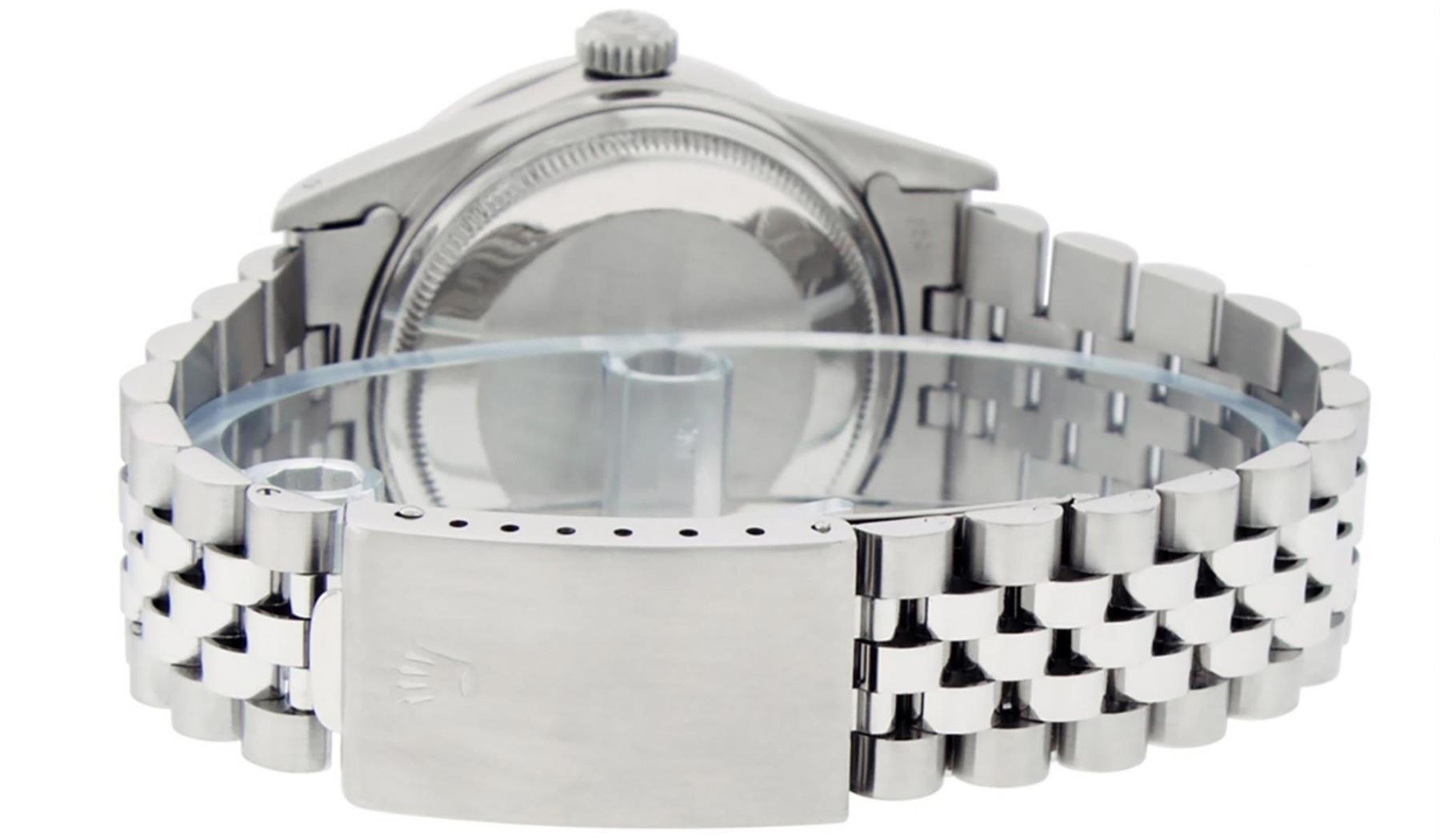 One Mens Stainless Steel Rolex Datejust Polished Bright with Satin Finish, This Watch Has Been Serviced & Electronically Tested, Stainless Steel Case: 36mm, Stainless Steel Crown, Custom Bezel: New 18K White Gold Sapphire Beadset Diamond Bezel, Diamond + Gem Count: 36 Diamonds + 4 Sapphires, Total Weight 1.00 Carat, Clarity: SI-VS, Color: G to H. Custom Crystal: New Synthetic Sapphire Cyclops Lens. Custom Hands: New Luminescent Hands. Movement: Automatic Winding Movement Caliber 3035. Dial: Silver Index With Dash Track & Lumi Dots. Date Window: 3 O'Clock Position Date Display, Quickset, Model: Datejust, Condition: G-6 Extra Fine. Bracelet: Stainless Steel Jubilee. Bracelet: 7.0 Inch Length, Adjustable. Standard Clasp, With Rolex Logo. This Watch Has Been Serviced Time Tested And Is In Excellent Condition It Is Free Of All Scratches And Dents.