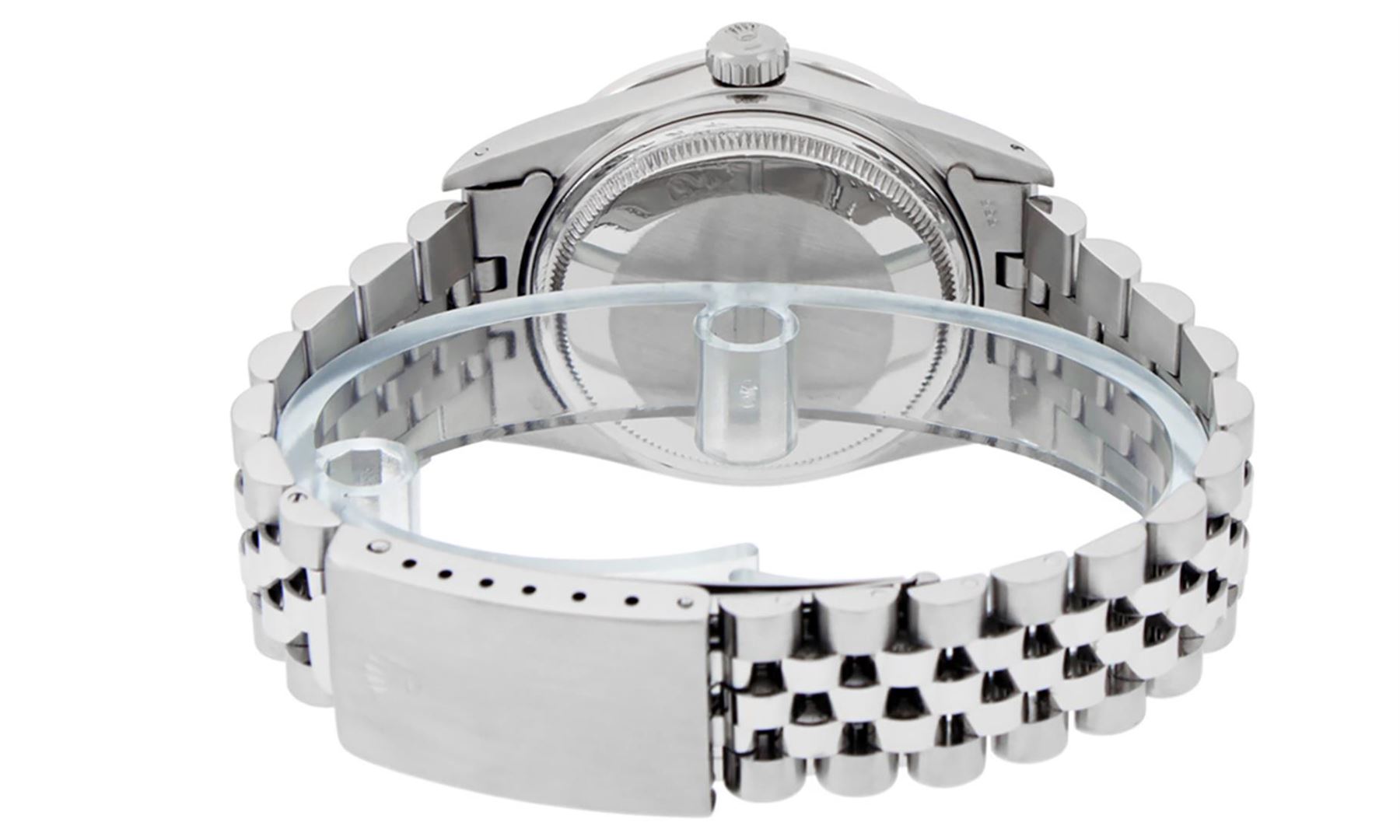 One Mens Pre Owned Stainless Steel Rolex Datejust Polished Bright with Satin Finish, This Watch Has Been Serviced & Electronically Tested, Stainless Steel Case: 36mm, Rolex Stainless Steel Crown, Custom Bezel: New 18K White Gold Sapphire Beadset Diamond Bezel, Diamond + Gem Count: 36 Diamonds + 4 Sapphires, Clarity: SI-VS, Color: G to H. Custom Crystal: New Sapphire With Date Window. Custom Hands: New Luminescent Hands. Rolex Movement: Automatic Winding Movement 3035. Rolex Dial: Silver Index With Dash Track & Lumi Dots. Date Window: 3 O'Clock Position Date Display, Quickset, Model: Datejust, Condition: G-6 Extra Fine. Rolex Bracelet: Stainless Steel Jubilee Band. Bracelet: 7.0 Inch Length, Adjustable. Standard Clasp, With Rolex Logo. This Watch Has Been Serviced Time Tested And Is In Excellent Condition It Is Free Of All Scratches And Dents.