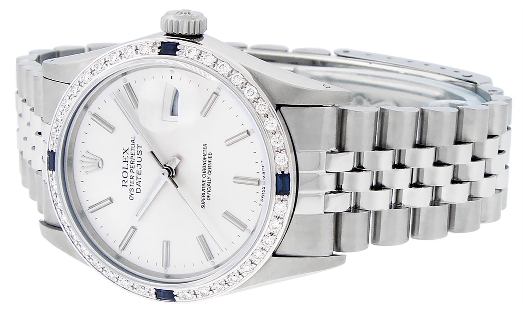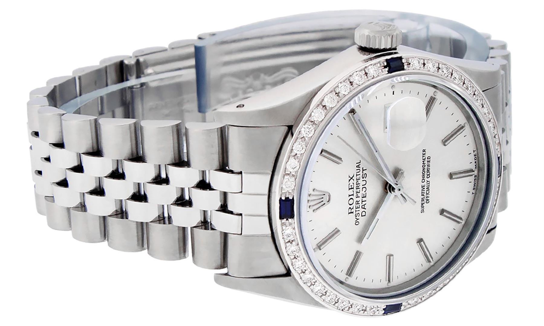 One Mens Pre Owned Stainless Steel Rolex Datejust Polished Bright with Satin Finish, This Watch Has Been Serviced & Electronically Tested, Stainless Steel Case: 36mm, Rolex Stainless Steel Crown, Custom Bezel: New 18K White Gold Sapphire Beadset Diamond Bezel, Diamond + Gem Count: 36 Diamonds + 4 Sapphires, Clarity: SI-VS, Color: G to H. Custom Crystal: New Sapphire With Date Window. Custom Hands: New Luminescent Hands. Rolex Movement: Automatic Winding Movement 3035. Rolex Dial: Silver Index With Dash Track & Lumi Dots. Date Window: 3 O'Clock Position Date Display, Quickset, Model: Datejust, Condition: G-6 Extra Fine. Rolex Bracelet: Stainless Steel Jubilee Band. Bracelet: 7.0 Inch Length, Adjustable. Standard Clasp, With Rolex Logo. This Watch Has Been Serviced Time Tested And Is In Excellent Condition It Is Free Of All Scratches And Dents.