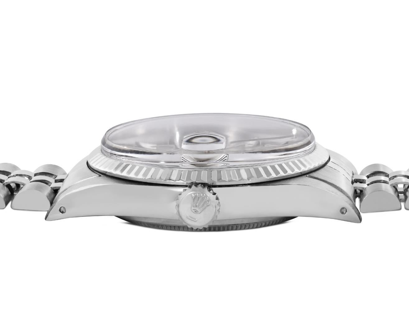One Mens Pre Owned Rolex Stainless Steel Datejust Polished Bright with Satin Finish, Serviced And Electronically Tested, Rolex Stainless Steel Case: 36mm, Rolex Stainless Steel Crown, Rolex Bezel: 18K White Gold Fluted Bezel. Custom Crystal: New Acrylic Crystal With Magnifying Date Window. Rolex Movement: Automatic Winding Movement Caliber 3035. Rolex Dial: Silver Index With Dash Track and Lumi Dots. Hands: White Lumi Hands. Date Window: 3 O'Clock Position Date Display, Quickset, Model: Quickset Datejust. Condition: G-6 Extra Fine. Rolex Bracelet: Stainless Steel Jubilee Band. Bright Polish & Satin Finish. 7.0 Inch Length, Adjustable. Standard Clasp, With Rolex Logo. This Watch Has Been Serviced Time Tested And Is In Excellent Condition It Is Free Of All Scratches And Dents.