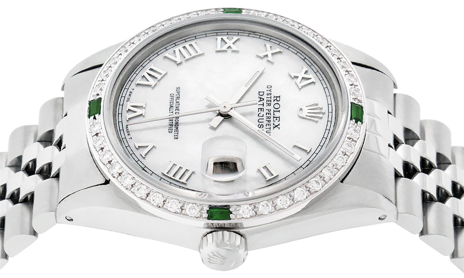 One Mens Stainless Steel Rolex Datejust Polished Bright with Satin Finish, This Watch Has Been Serviced & Electronically Tested, Stainless Steel Case: 36mm, Stainless Steel Crown, Custom Bezel: New 18K White Gold Emerald Beadset Diamond Bezel, Diamond + Gem Count: 36 Diamonds + 4 Emeralds, Total Weight 1.00 Carat, Clarity: SI-VS, Color: G to H. Custom Crystal: New Scratch Resistant Synthetic Sapphire Cyclops Lens. Custom Hands: New Luminescent Hands. Movement: Automatic Winding Movement Caliber 3035. Custom Dial: Mother Of Pearl With Roman Track. Date Window: 3 O'Clock Position Date Display, Quickset, Model: Datejust, Condition: G-6 Extra Fine. Bracelet: Stainless Steel Jubilee. Bracelet: 7.0 Inch Length, Adjustable. Standard Clasp, With Rolex Logo. This Watch Has Been Serviced Time Tested And Is In Excellent Condition It Is Free Of All Scratches And Dents.