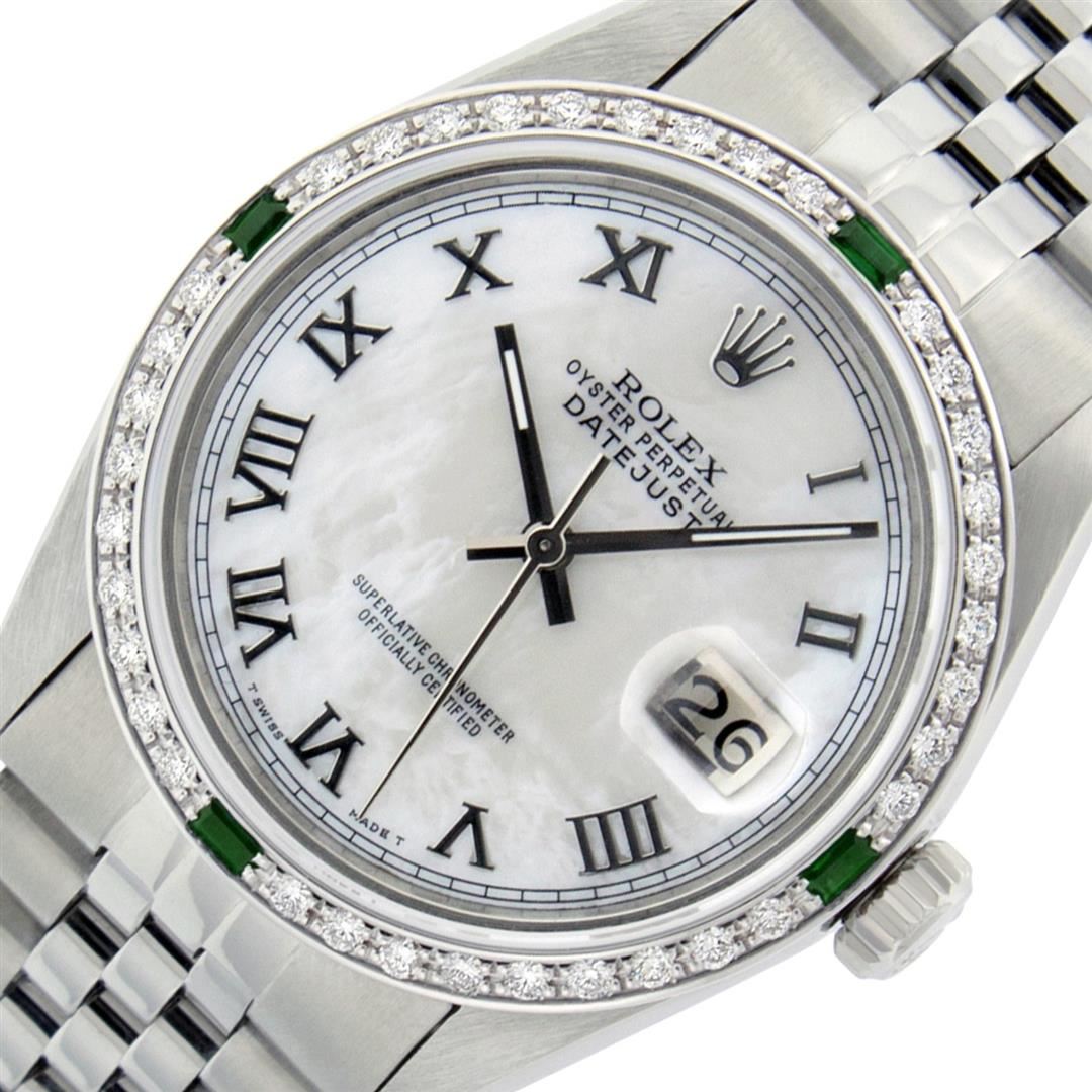 One Mens Stainless Steel Rolex Datejust Polished Bright with Satin Finish, This Watch Has Been Serviced & Electronically Tested, Stainless Steel Case: 36mm, Stainless Steel Crown, Custom Bezel: New 18K White Gold Emerald Beadset Diamond Bezel, Diamond + Gem Count: 36 Diamonds + 4 Emeralds, Total Weight 1.00 Carat, Clarity: SI-VS, Color: G to H. Custom Crystal: New Scratch Resistant Synthetic Sapphire Cyclops Lens. Custom Hands: New Luminescent Hands. Movement: Automatic Winding Movement. Custom Dial: Mother Of Pearl With Roman Track. Date Window: 3 O'Clock Position Date Display, Quickset, Model: Datejust, Condition: G-6 Extra Fine. Bracelet: Stainless Steel Jubilee. Bracelet: 7.0 Inch Length, Adjustable. Standard Clasp, With Rolex Logo. This Watch Has Been Serviced Time Tested And Is In Excellent Condition It Is Free Of All Scratches And Dents.