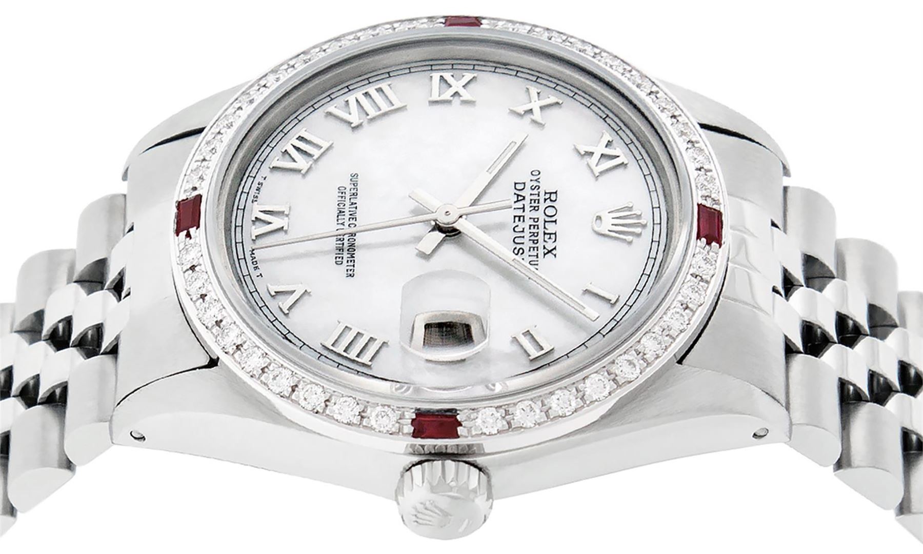 One Mens Stainless Steel Rolex Datejust Polished Bright with Satin Finish, This Watch Has Been Serviced & Electronically Tested, Stainless Steel Case: 36mm, Stainless Steel Crown, Custom Bezel: New 18K White Gold Ruby Beadset Diamond Bezel, Diamond + Gem Count: 36 Diamonds + 4 Rubies, Total Weight 1.00 Carat, Clarity: SI-VS, Color: G to H. Custom Crystal: New Scratch Resistant Synthetic Sapphire Cyclops Lens. Custom Hands: New Luminescent Hands. Movement: Automatic Winding Movement. Dial: Mother Of Pearl With Roman Track. Date Window: 3 O'Clock Position Date Display, Quickset, Model: Datejust, Condition: G-6 Extra Fine. Bracelet: Stainless Steel Jubilee. Bracelet: 7.0 Inch Length, Adjustable. Standard Clasp, With Rolex Logo. This Watch Has Been Serviced Time Tested And Is In Excellent Condition It Is Free Of All Scratches And Dents.