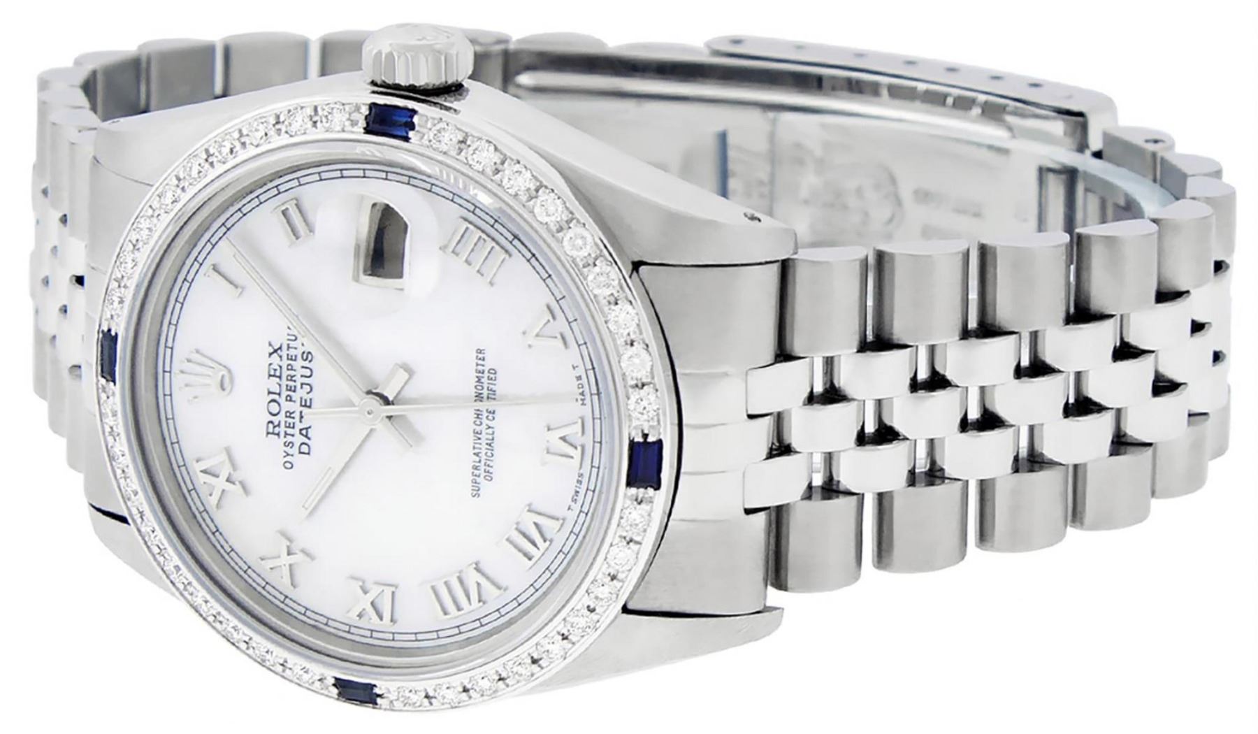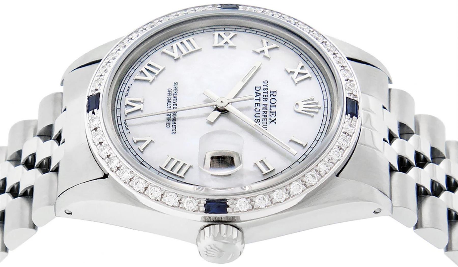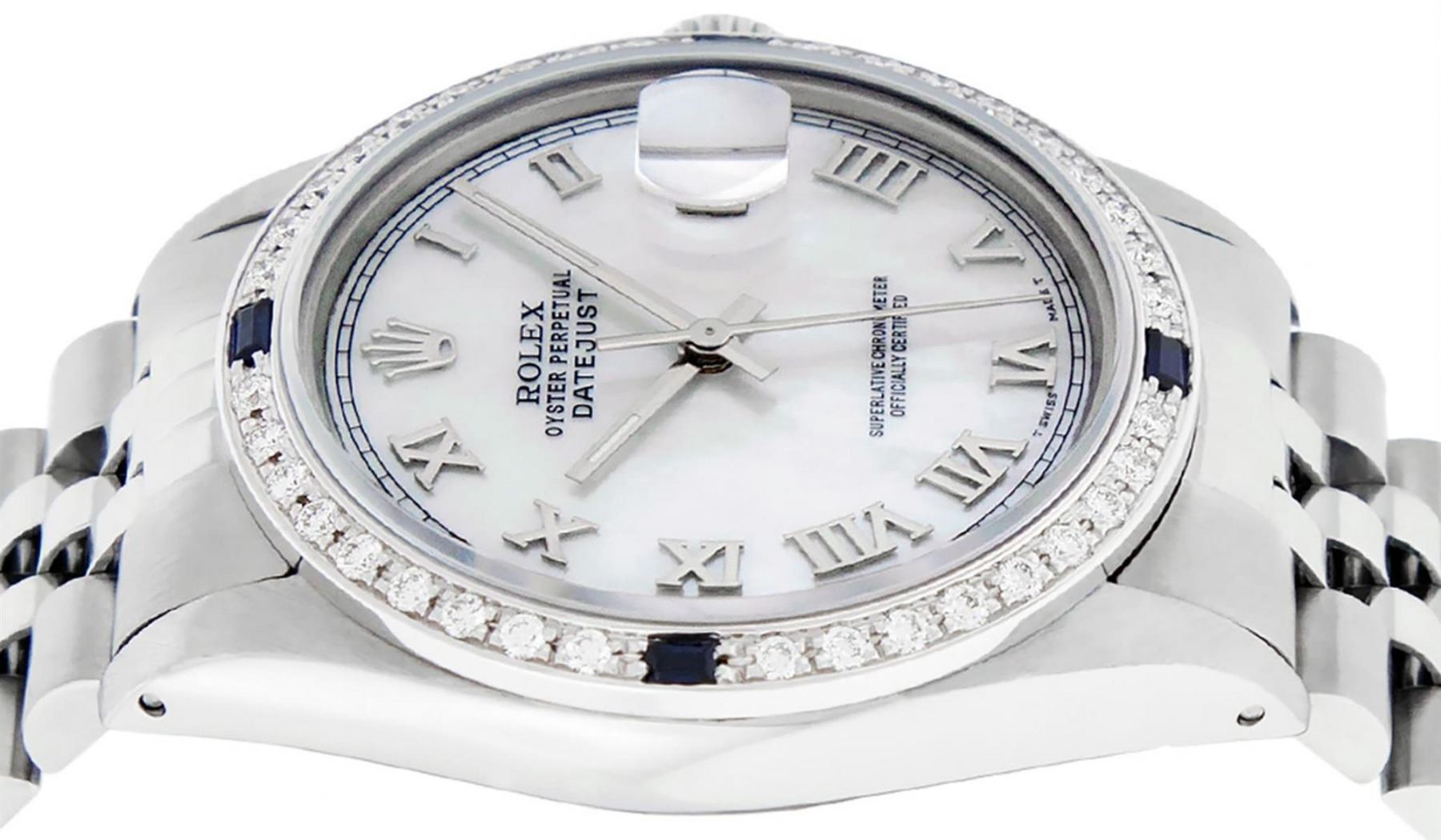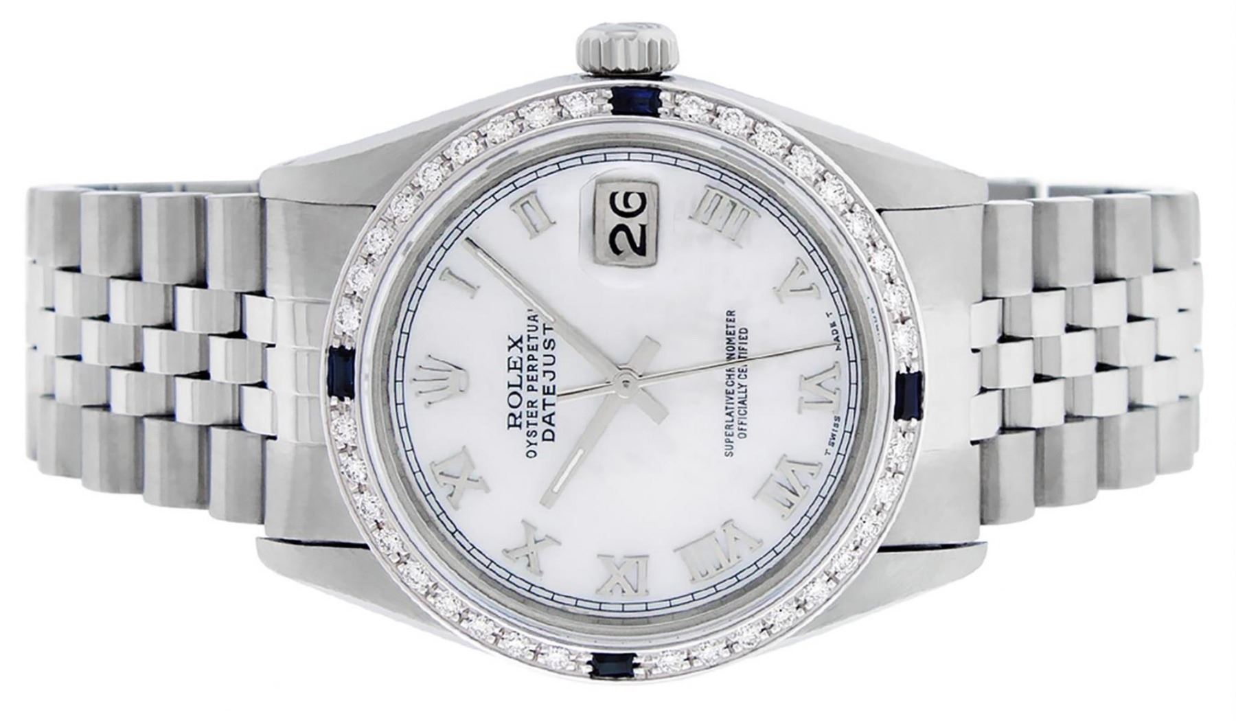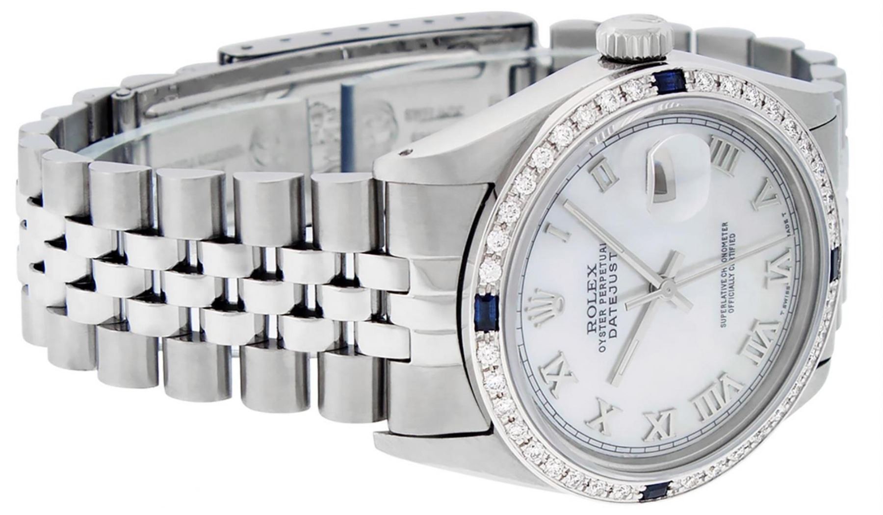 One Mens Stainless Steel Rolex Datejust Polished Bright with Satin Finish, This Watch Has Been Serviced & Electronically Tested, Stainless Steel Case: 36mm, Stainless Steel Crown, Custom Bezel: New 18K White Gold Sapphire Beadset Diamond Bezel, Diamond + Gem Count: 36 Diamonds + 4 Sapphires, Total Weight 1.00 Carat, Clarity: SI-VS, Color: G to H. Custom Crystal: New Synthetic Sapphire Cyclops Lens. Custom Hands: New Luminescent Hands. Movement: Automatic Winding Movement Caliber 3035. Custom Dial: Mother Of Pearl With Roman Track. Date Window: 3 O'Clock Position Date Display, Quickset, Model: Datejust, Condition: G-6 Extra Fine. Bracelet: Stainless Steel Jubilee. Bracelet: 7.0 Inch Length, Adjustable. Standard Clasp, With Rolex Logo. This Watch Has Been Serviced Time Tested And Is In Excellent Condition It Is Free Of All Scratches And Dents.