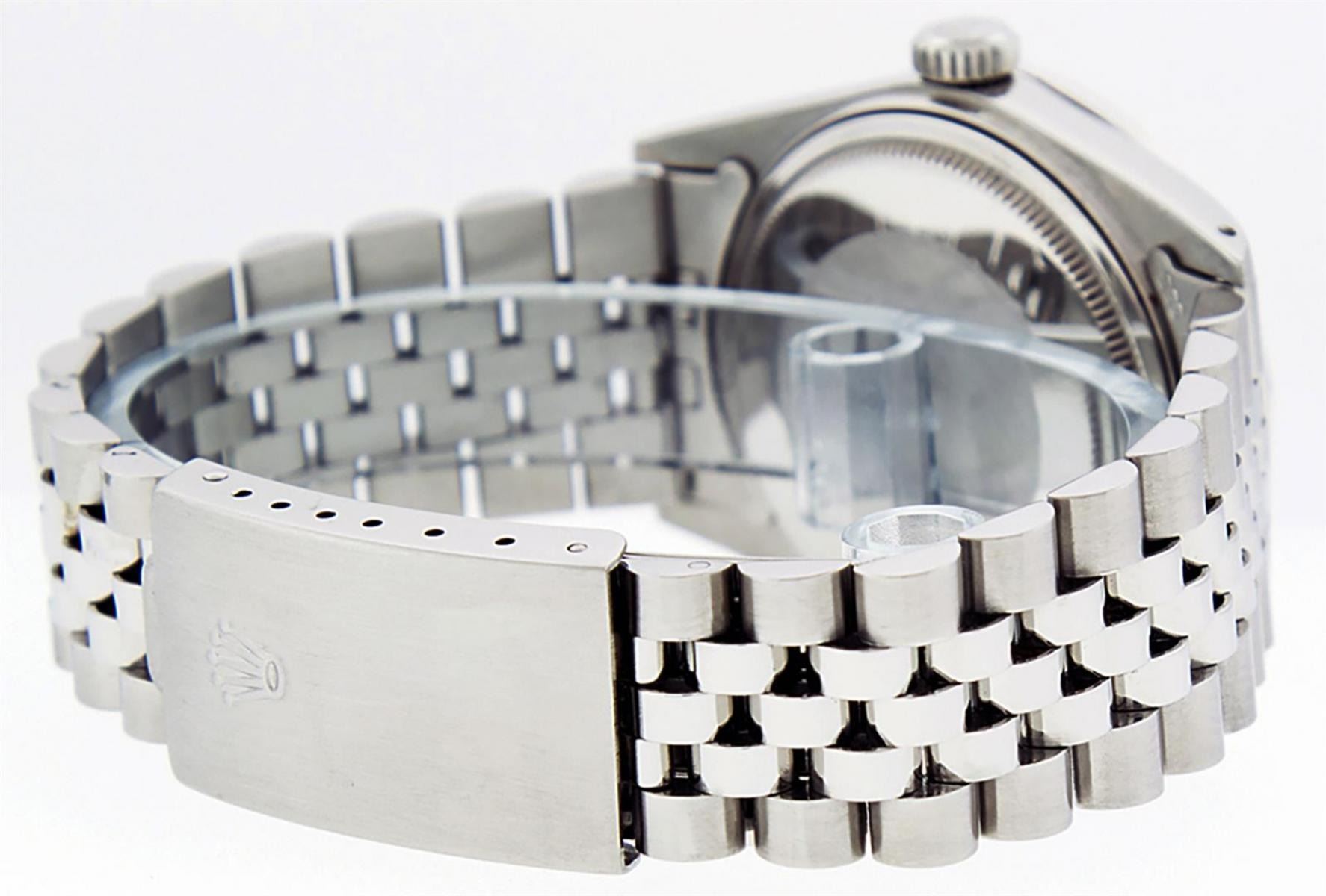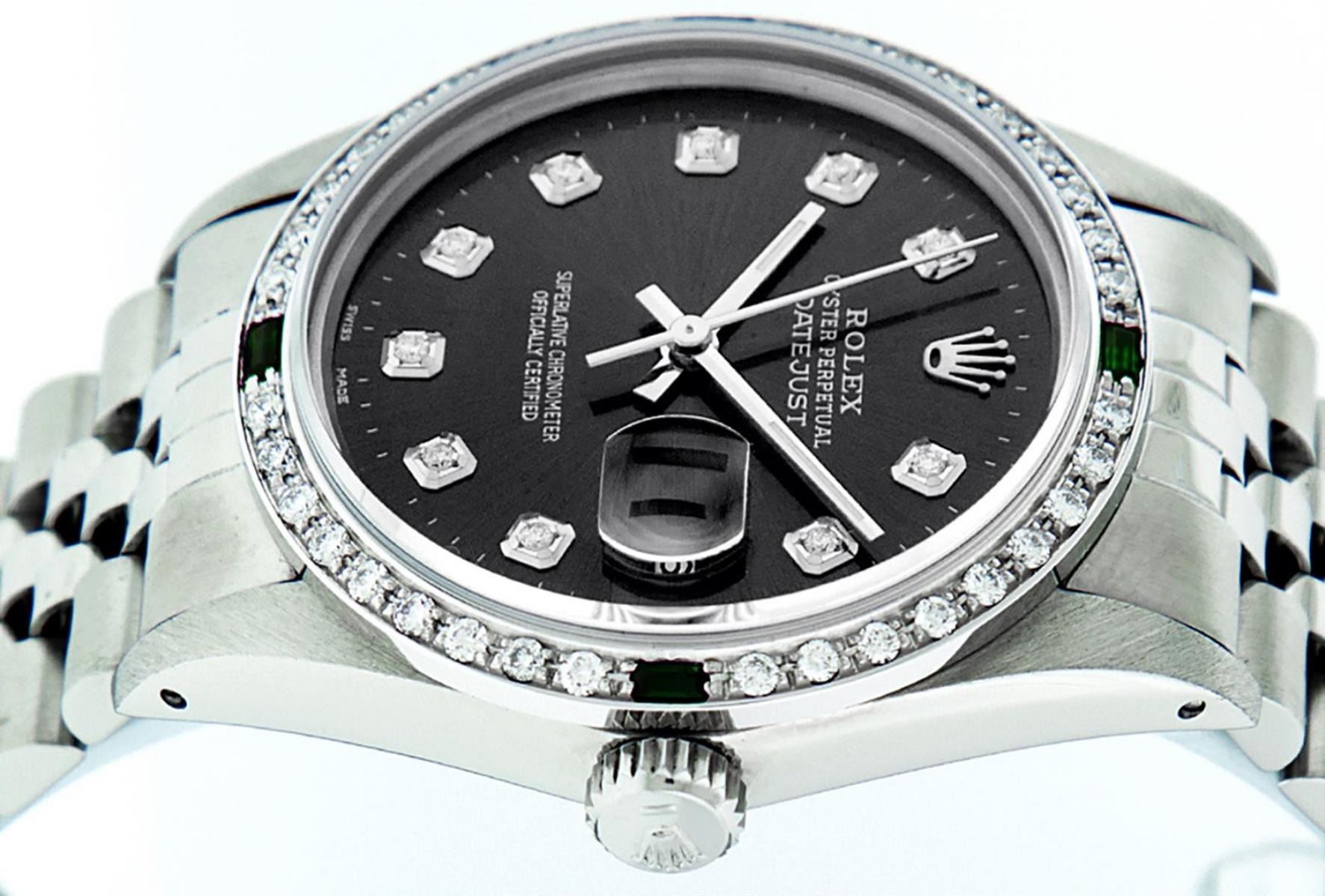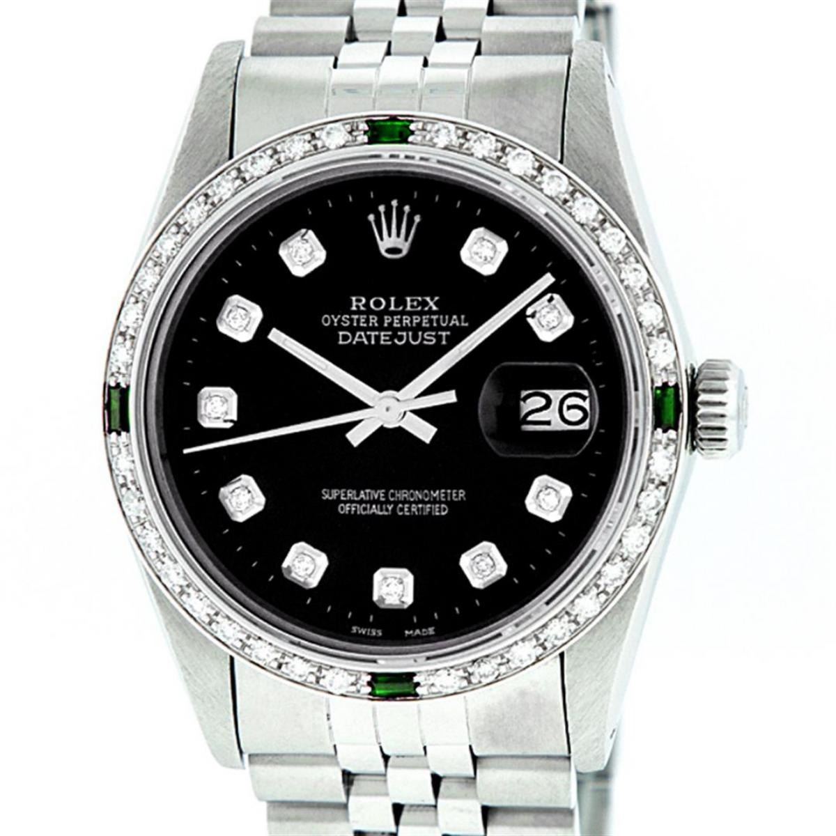 One Mens Stainless Steel Rolex Datejust Polished, Serviced & Electronically Tested, Stainless Steel Case: 36mm, Stainless Steel Crown, Custom Bezel: New 18K White Gold Emerald Beadset Diamond Bezel, Diamond + Gem Count: 36 Diamonds + 4 Emeralds, Total Weight 1.00 Carat, Clarity: SI-VS, Color: G to H. Custom Crystal: New Scratch Resistant Synthetic Sapphire Cyclops Lens. Custom Hands: New Luminescent Hands. Movement: Automatic Winding Movement Caliber 3035. Custom Dial: Green Diamond Dial With Dash Track, 10 Diamonds in Dial, G To H In Color, Clarity: SI-VS. Date Window: 3 O'Clock Position Date Display, Quickset, Model: Datejust. Condition: G-6 Extra Fine. Bracelet: Stainless Steel Jubilee. Bright Polish & Satin Finish. 7.0 Inch Length, Adjustable. Standard Clasp, With Rolex Logo. This Watch Has Been Serviced Time Tested And Is In Excellent Condition It Is Free Of All Scratches And Dents.