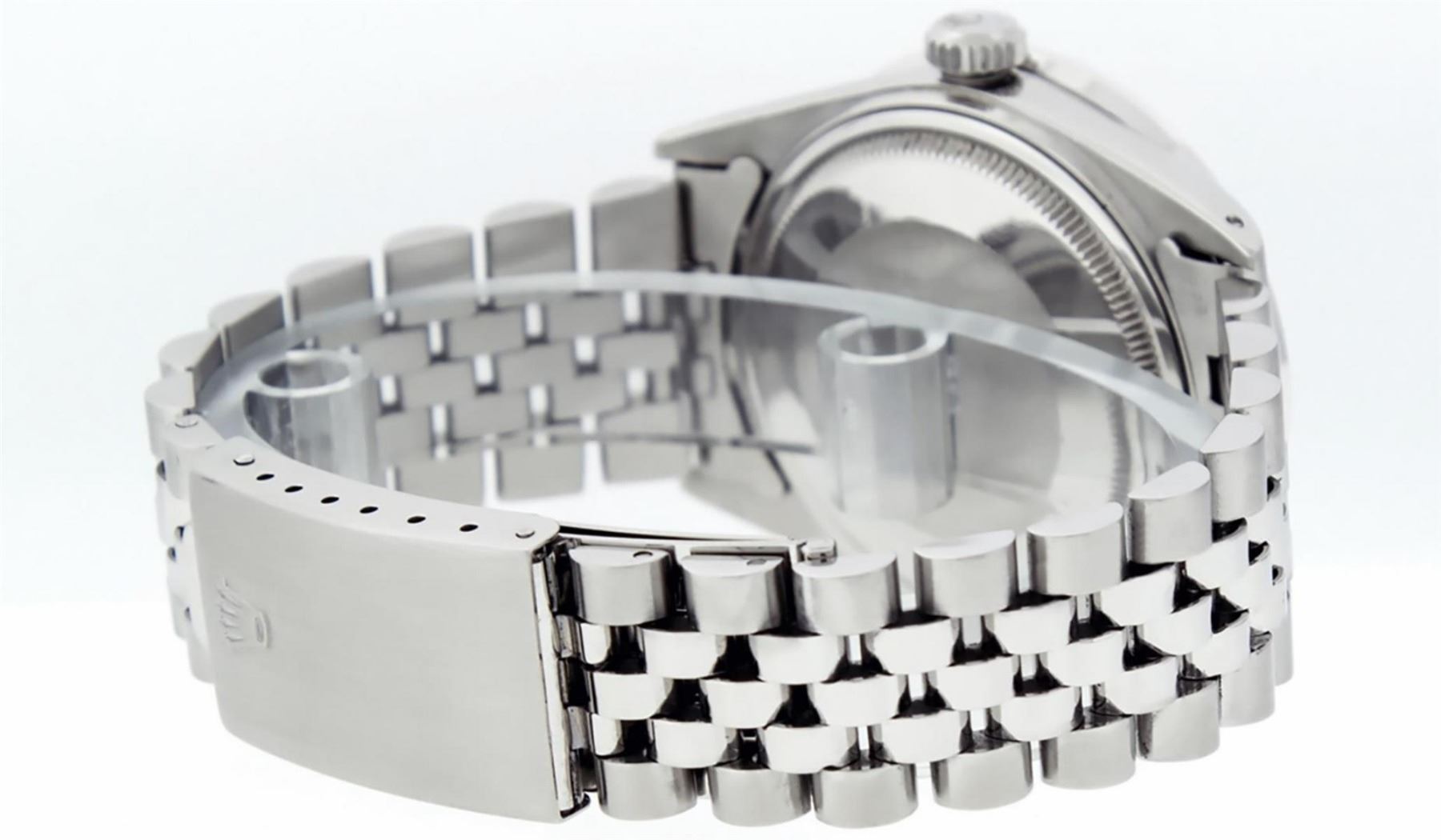One Mens Stainless Steel Rolex Datejust Polished, Serviced & Electronically Tested, Stainless Steel Case: 36mm, Stainless Steel Crown, Custom Bezel: New 18K White Gold Beadset Diamond Bezel, Diamond Count: 46 Diamonds In Bezel, Total Weight 1.40 Carat, Clarity: SI-VS, Color: G to H. Custom Crystal: New Scratch Resistant Synthetic Sapphire Cyclops Lens. Custom Hands: New Luminescent Hands. Movement: Automatic Winding Movement Caliber 3035. Custom Dial: Green Vignette Diamond Dial, Diamond Count: 10 Diamonds in Dial, G To H In Color, Clarity: VS2. Date Window: 3 O'Clock Position Date Display, Quickset, Model: Datejust. Condition: G-6 Extra Fine. Bracelet: Stainless Steel Jubilee Band. Bright Polish & Satin Finish. 7.0 Inch Length, Adjustable. Standard Clasp, With Rolex Logo. This Watch Has Been Serviced Time Tested And Is In Excellent Condition It Is Free Of All Scratches And Dents.
