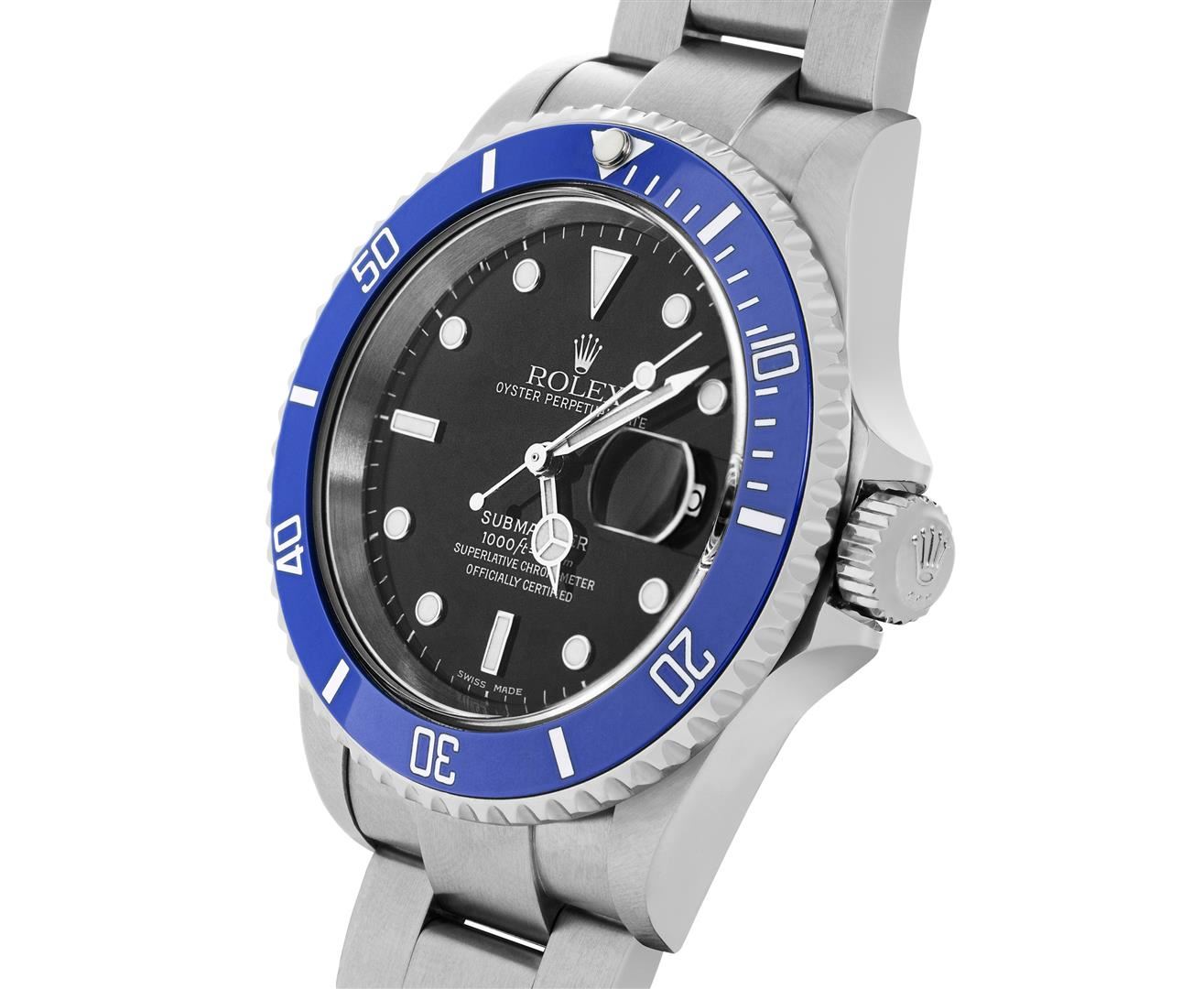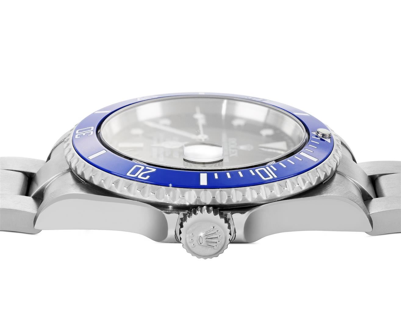 One Mens Pre Owned Rolex Stainless Steel Submariner With Date Polished, Serviced & Electronically Tested, Rolex Stainless Steel Case: 40mm, Rolex Stainless Steel Crown, Rolex Bezel: Stainless Steel Rotatable Bezel. Custom Bezel Insert: New Custom Blue Ceramic Insert. Crystal: Sapphire With Magnified Date Window. Rolex Movement: Automatic Winding Movement Caliber 3135. Rolex Dial: Black Submariner Dial with Luminous Index Hour Markers And Dash Track. Date Window: 3 O'Clock Position Date Display, Model: Date No Holes Submariner, Quickset, Condition: G-6 Extra Fine. Rolex Bracelet: Stainless Steel Oyster Band. Bright Polish & Satin Finish. 7.0 Inch Length, Adjustable. Fold Clasp, With Rolex Logo. This Watch Comes With A Rolex Box.