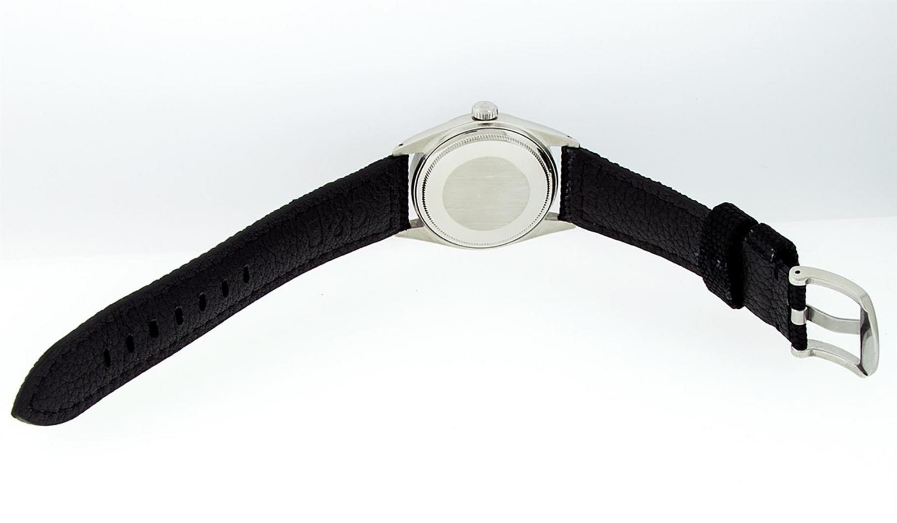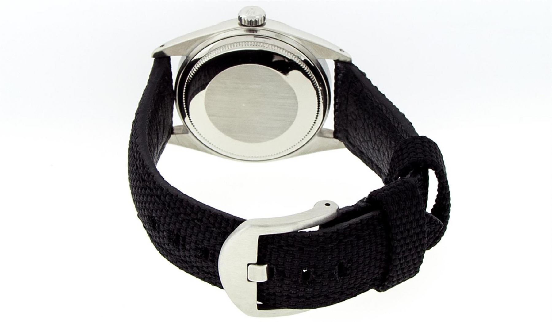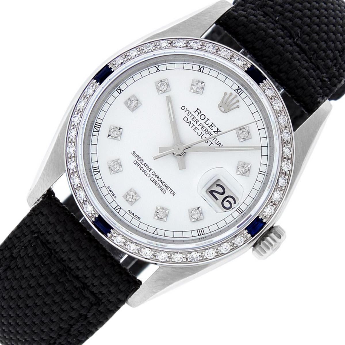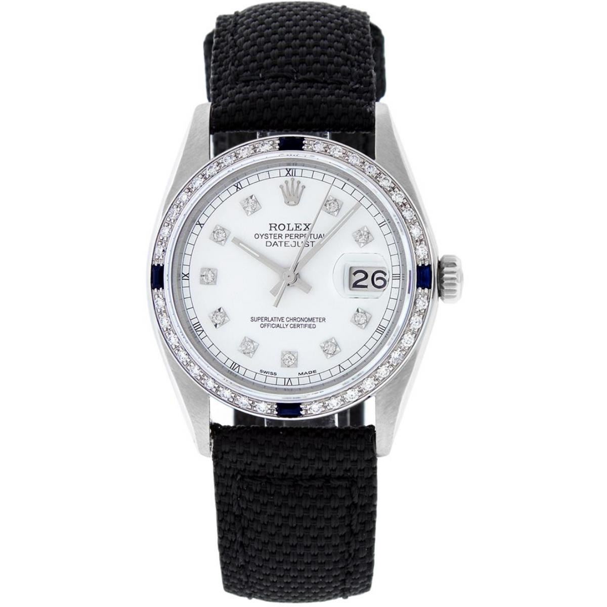 One Mens Stainless Steel Rolex Datejust Polished, Serviced & Electronically Tested, Stainless Steel Case: 36mm, Stainless Steel Crown, Custom Bezel: New 18K White Gold Sapphire Beadset Diamond Bezel, Diamond + Gem Count: 36 Diamonds + 4 Sapphires, Total Weight 1.00 Carat, Clarity: SI-VS, Color: G to H. Custom Crystal: New Scratch Resistant Synthetic Sapphire Cyclops Lens. Custom Hands: New Luminescent Hands. Movement: Automatic Winding Movement 3035. Custom Dial: White Diamond With Square Roman Track, 10 Diamonds In Dial, G To H In Color, Clarity: SI-VS. Date Window: 3 O'Clock Position Date Display, Quickset, Model: Datejust. Condition: G-6 Extra Fine. Band: Black Nylon Strap. 7.5 Inch Length. This Watch Has Been Serviced Time Tested And Is In Excellent Condition It Is Free Of All Scratches And Dents