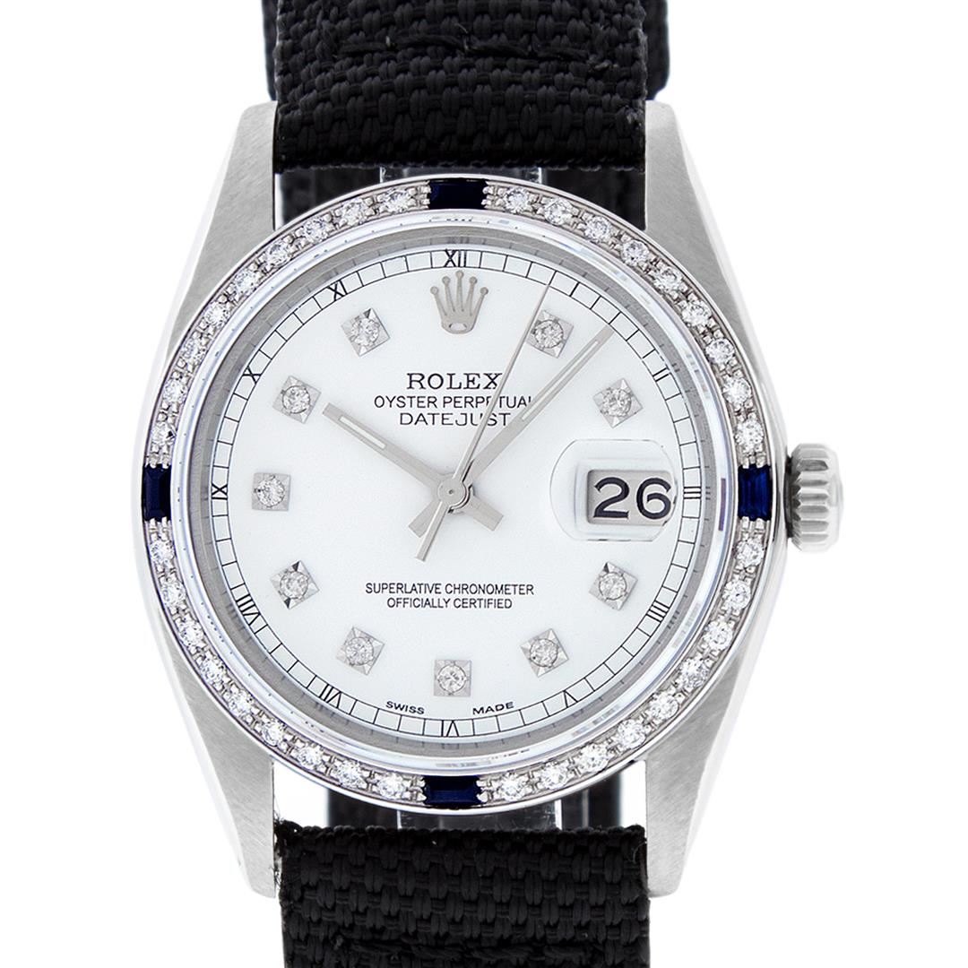 One Mens Stainless Steel Rolex Datejust Polished, Serviced & Electronically Tested, Stainless Steel Case: 36mm, Stainless Steel Crown, Custom Bezel: New 18K White Gold Sapphire Beadset Diamond Bezel, Diamond + Gem Count: 36 Diamonds + 4 Sapphires, Total Weight 1.00 Carat, Clarity: SI-VS, Color: G to H. Custom Crystal: New Scratch Resistant Synthetic Sapphire Cyclops Lens. Custom Hands: New Luminescent Hands. Movement: Automatic Winding Movement 3035. Custom Dial: White Diamond With Square Roman Track, 10 Diamonds In Dial, G To H In Color, Clarity: SI-VS. Date Window: 3 O'Clock Position Date Display, Quickset, Model: Datejust. Condition: G-6 Extra Fine. Band: Black Nylon Strap. 7.5 Inch Length. This Watch Has Been Serviced Time Tested And Is In Excellent Condition It Is Free Of All Scratches And Dents.