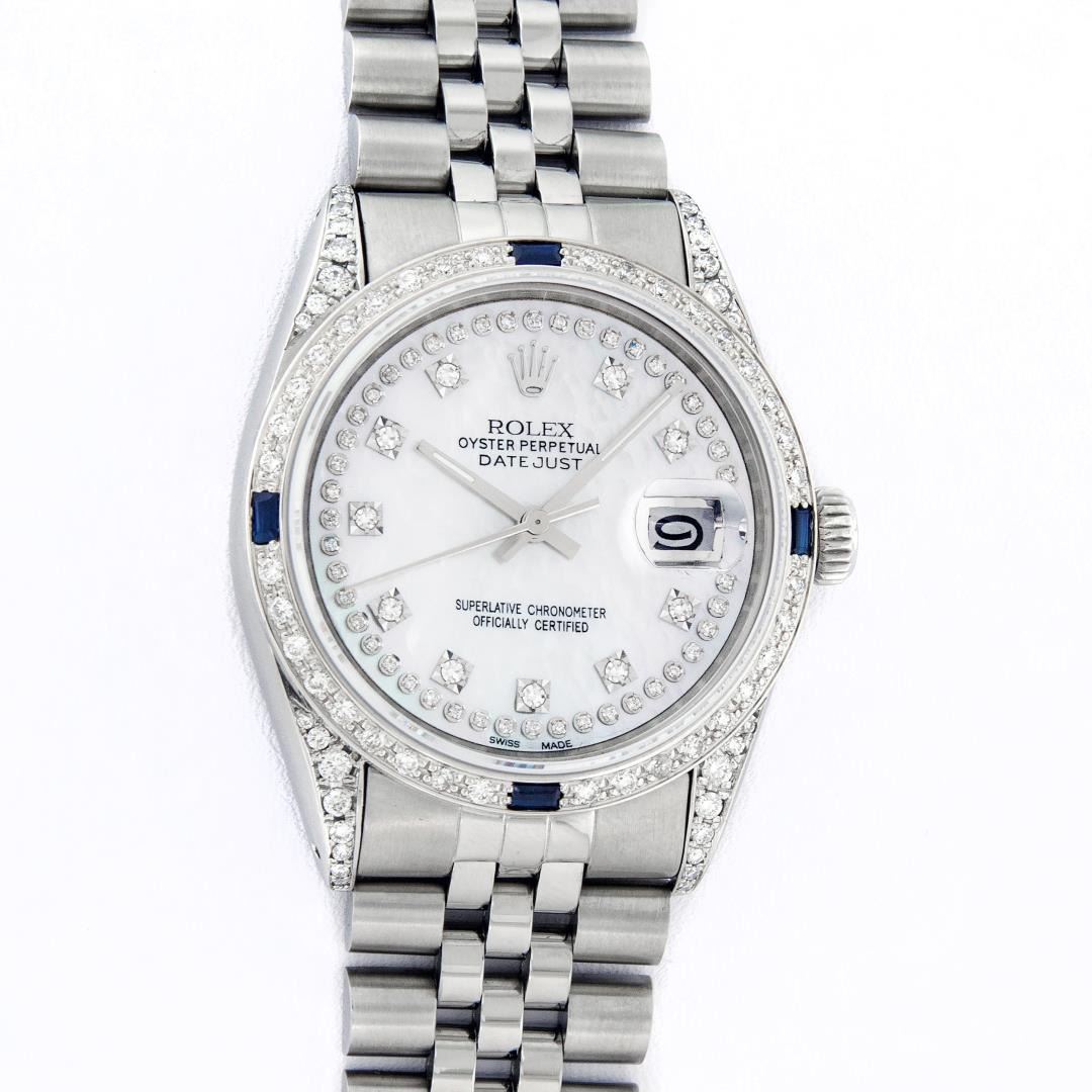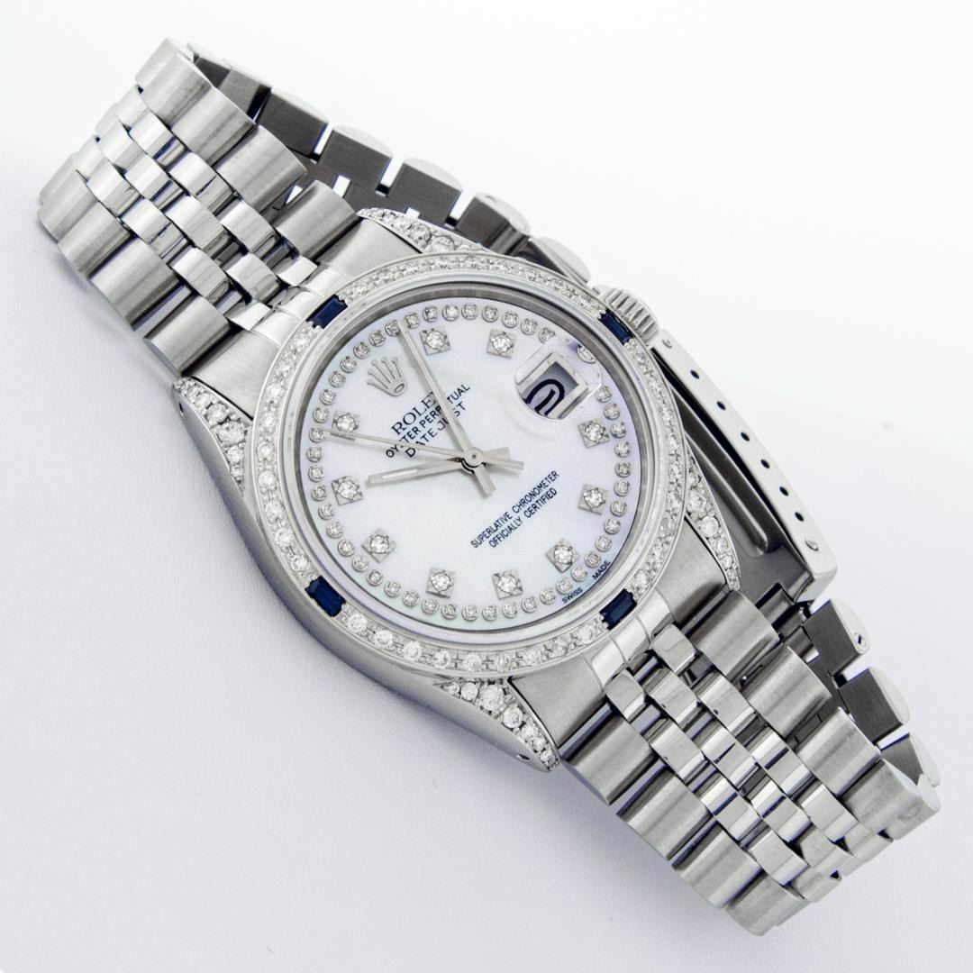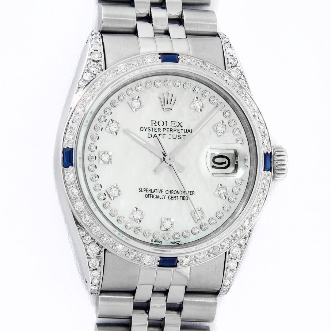 One Mens Pre Owned Stainless Steel Rolex Datejust Polished Bright with Satin Finish, Serviced And Electronically Tested, Rolex Stainless Steel Case: 36mm, Custom Diamond Lugs: 28 Diamonds On Lugs. Rolex Stainless Steel Crown, Custom Bezel: New 18K White Gold Diamond + Sapphire Beadset, Diamond Count: 36 Diamonds + 4 Sapphires. Custom Crystal: New Sapphire With Magnified Date Window. Custom Hands: New Luminescent Hands. Rolex Movement: Automatic Winding Movement 3035. Custom Dial: Custom White Dial With Added Diamonds, Stone Count: 58 Diamonds On Dial. Date Window: 3 O'Clock Position Date Display, Quickset, Model: Datejust Condition: G-6 Extra Fine. Rolex Bracelet: Stainless Steel Jubilee Band. Bright Polish And Satin Finish. 7.0 Inch Length, Adjustable. Standard Clasp, With Rolex Logo. This Watch Has Been Serviced And Polished And Its Free Of All Dents And Scratches.