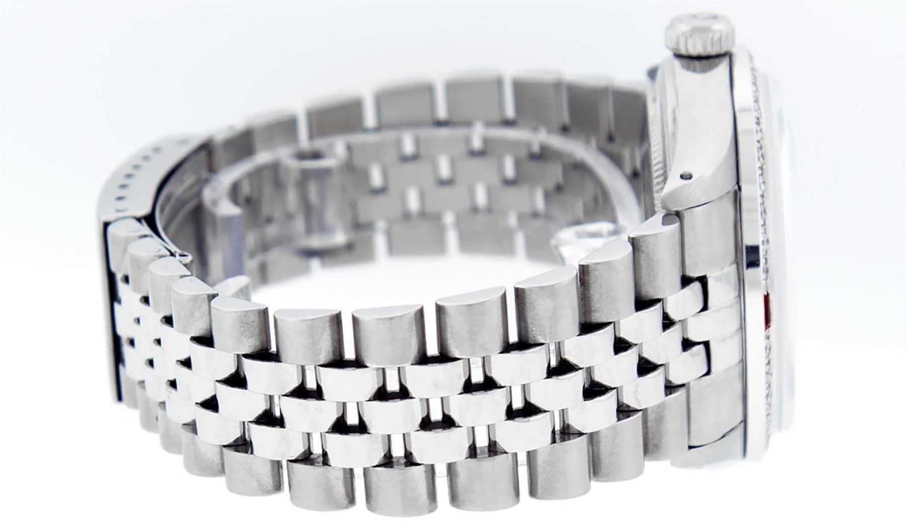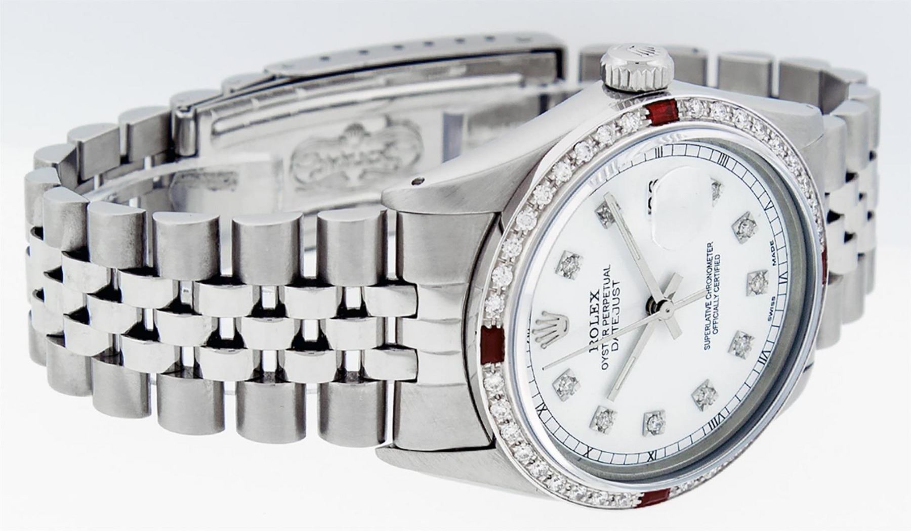 One Mens Stainless Steel Rolex Datejust Polished, Serviced & Electronically Tested, Stainless Steel Case: 36mm, Stainless Steel Crown, Custom Bezel: New 18K White Gold Ruby Beadset Diamond Bezel, Diamond + Gem Count: 36 Diamonds + 4 Rubies, Total Weight 1.00 Carat, Clarity: SI-VS, Color: G to H. Custom Crystal: New Scratch Resistant Synthetic Sapphire Cyclops Lens. Custom Hands: New Luminescent Hands. Movement: Automatic Winding Movement Caliber 3035. Custom Dial: White Diamond Dial With Roman Track, 10 Diamonds in Dial, G To H In Color, Clarity: SI-VS. Date Window: 3 O'Clock Position Date Display, Quickset, Model: Datejust. Condition: G-6 Extra Fine. Bracelet: Stainless Steel Jubilee Band. Bright Polish & Satin Finish. 7.0 Inch Length, Adjustable. Standard Clasp, With Rolex Logo. This Watch Has Been Serviced Time Tested And Is In Excellent Condition It Is Free Of All Scratches And Dents.