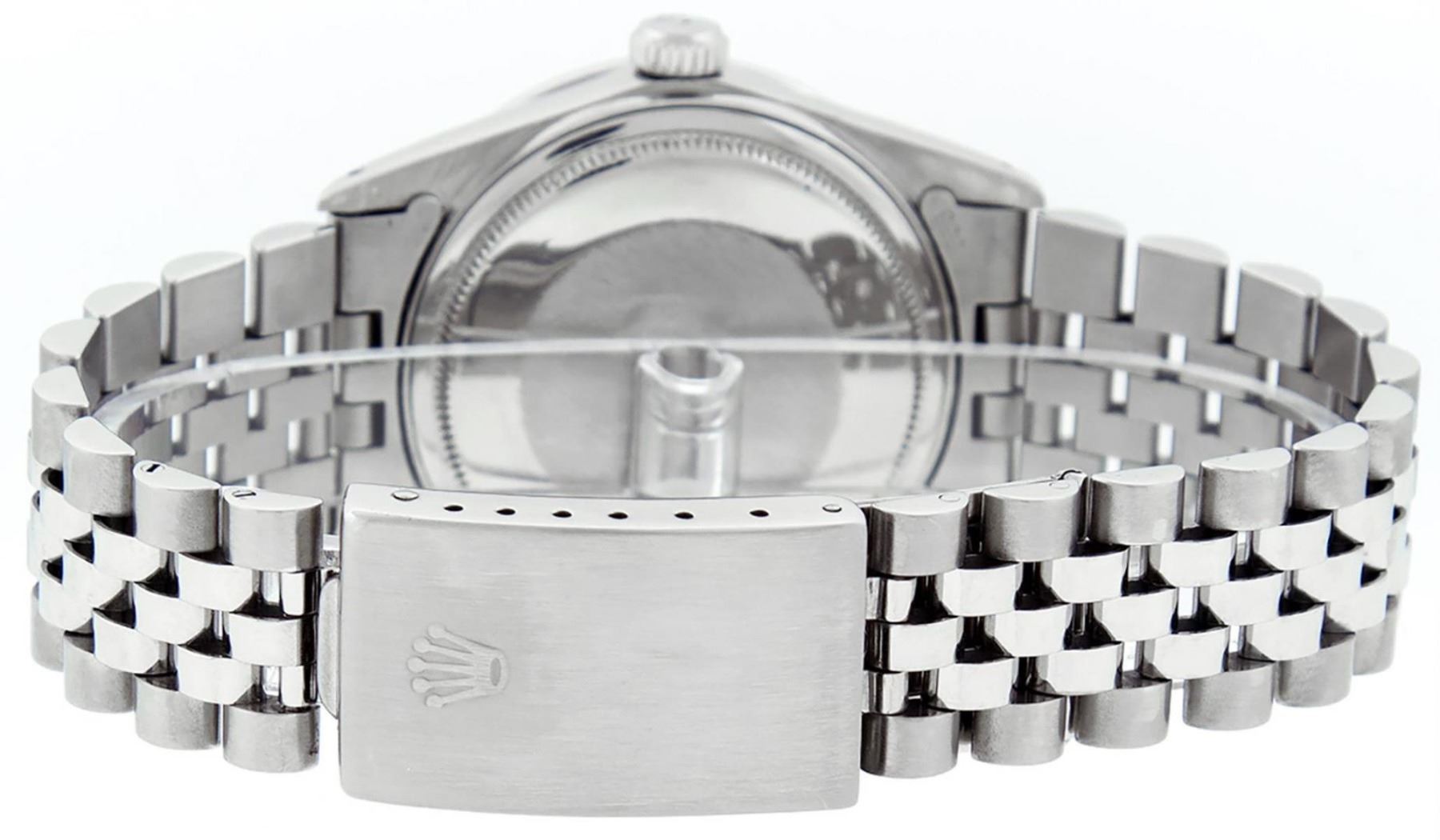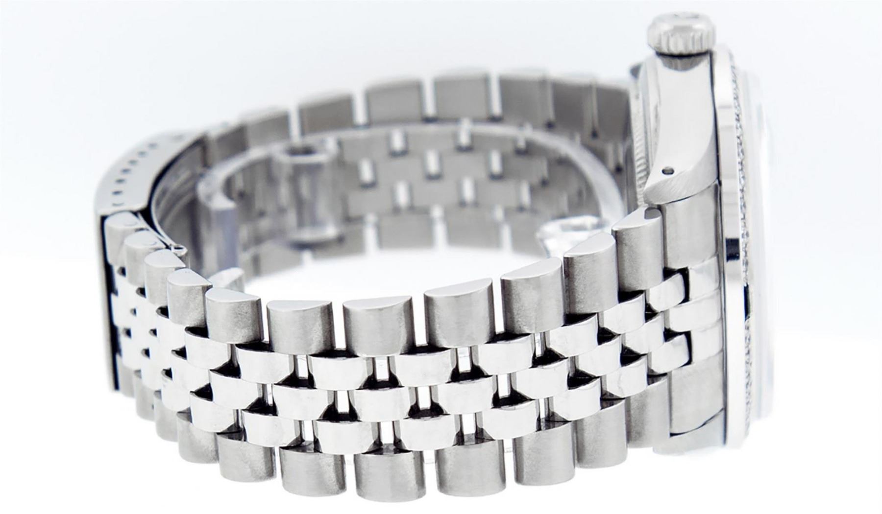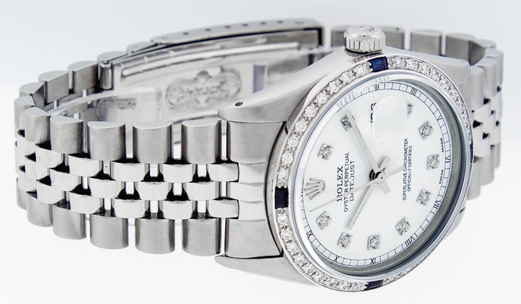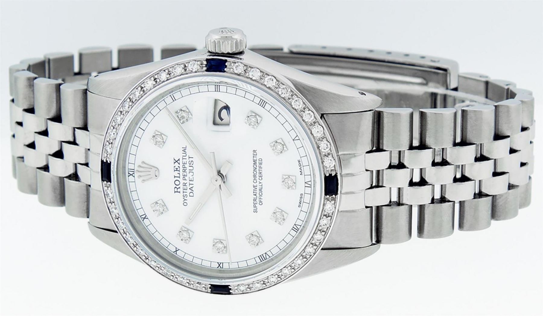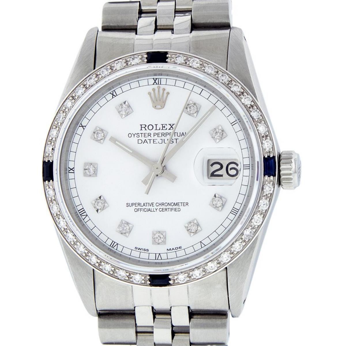 One Mens Stainless Steel Rolex Datejust Polished, Serviced & Electronically Tested, Stainless Steel Case: 36mm, Stainless Steel Crown, Custom Bezel: New 18K White Gold Sapphire Beadset Diamond Bezel, Diamond + Gem Count: 36 Diamonds + 4 Sapphires, Total Weight 1.00 Carat, Clarity: SI-VS, Color: G to H. Custom Crystal: New Scratch Resistant Synthetic Sapphire Cyclops Lens. Custom Hands: New Luminescent Hands. Movement: Automatic Winding Movement Caliber 3035. Custom Dial: White Diamond Dial With Roman Track, 10 Diamonds in Dial, G To H In Color, Clarity: SI-VS. Date Window: 3 O'Clock Position Date Display, Quickset, Model: Datejust. Condition: G-6 Extra Fine. Bracelet: Stainless Steel Jubilee Band. Bright Polish & Satin Finish. 7.0 Inch Length, Adjustable. Standard Clasp, With Rolex Logo. This Watch Has Been Serviced Time Tested And Is In Excellent Condition It Is Free Of All Scratches And Dents.