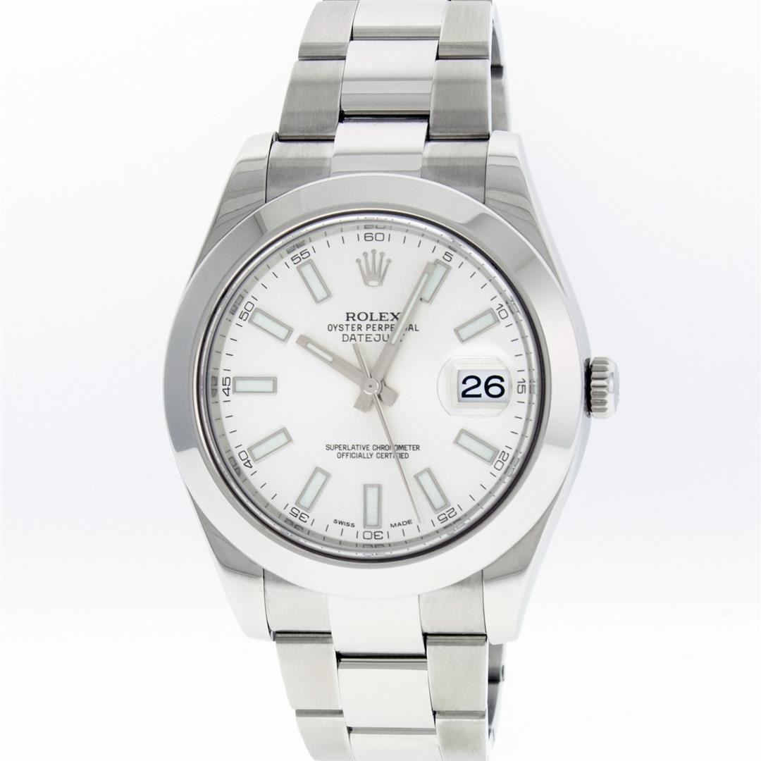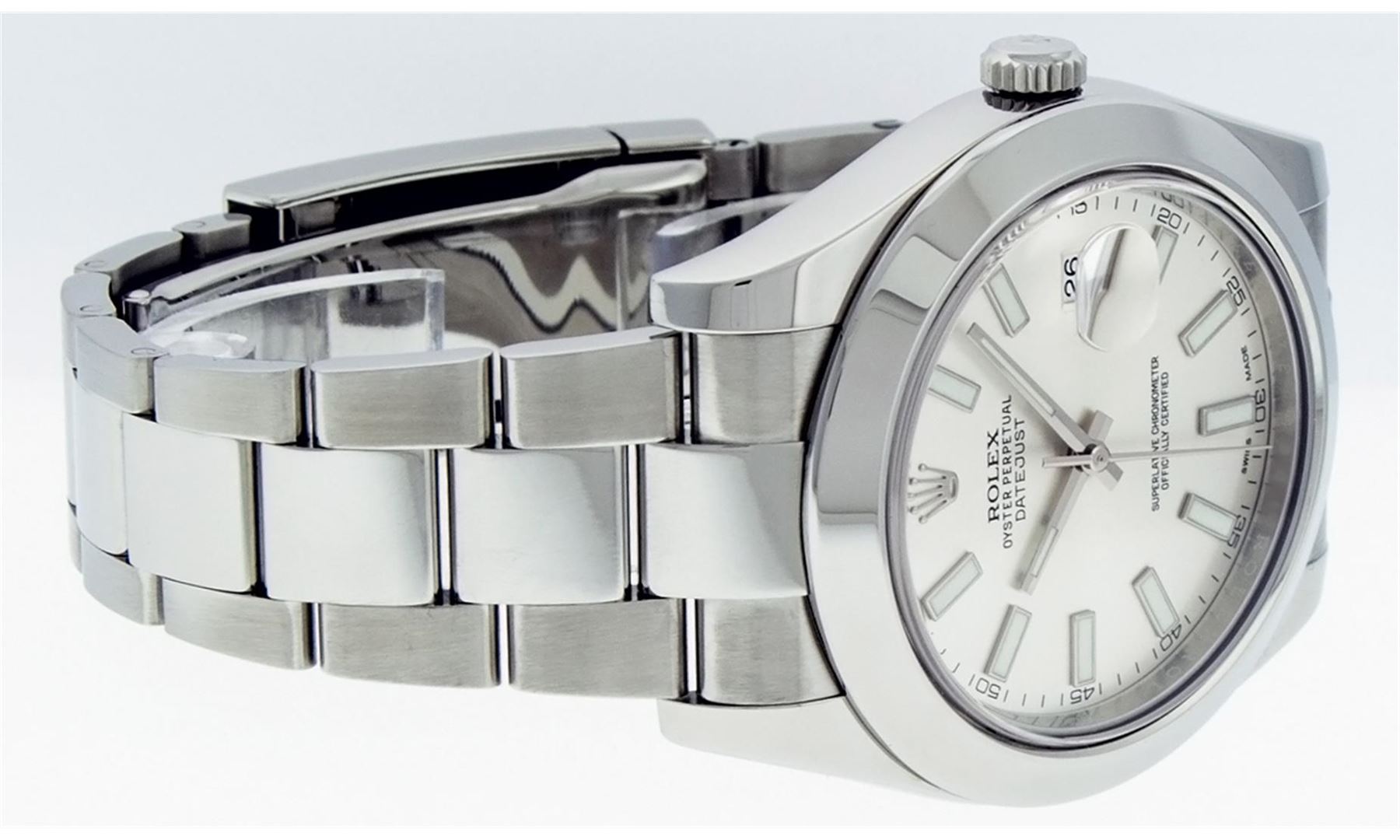 One Mens Rolex Datejust 2 41MM Polished, Serviced & Electronically Tested, Rolex Stainless Steel Case: 41mm, Stainless Steel Crown, Rolex Bezel: Stainless Steel Smooth Bezel, Crystal: Sapphire With Magnified Date Window. Hands: Luminescent Hands. Rolex Movement: Automatic Winding Movement 3136. Rolex Dial: White Index With Dash Track. Date Window: 3 O'Clock Position Date Display, Quickset, Model: Datejust 2. Condition: G-6 Extra Fine. Rolex Bracelet: Stainless Steel Oyster Band. Bright Polish & Satin Finish. 7.0 Inch Length, Adjustable. Standard Clasp, With Rolex Logo. This Pre Owned Watch Has Been Serviced Time Tested And Is In Excellent Condition It Is Free Of All Scratches And Dents.