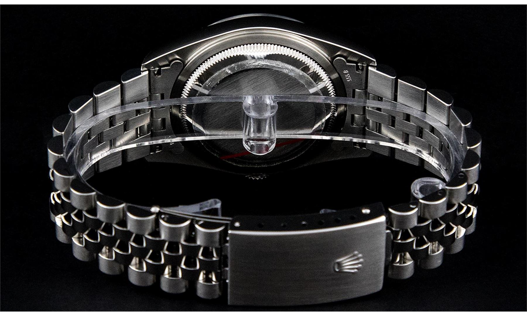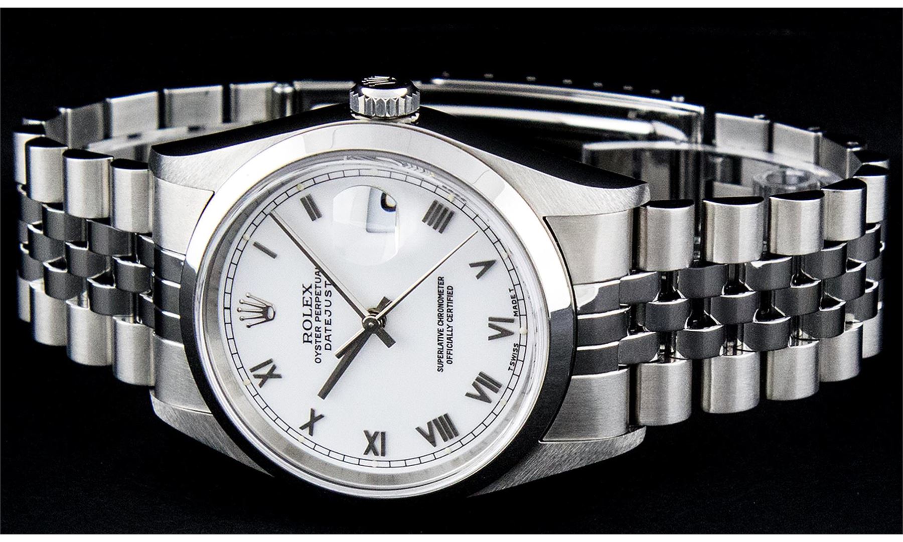 One Mens Rolex Stainless Steel Datejust Polished Bright with Satin Finish, Serviced & Electronically Tested, Rolex Stainless Steel Case: 36mm, Rolex Stainless Steel Crown, Rolex Bezel: Stainless Steel Smooth Bezel. Crystal: Sapphire Cyclops Lens. Rolex Movement: Automatic Winding Movement Caliber 3135. Rolex Dial: White Roman With Square Track and Lumi Dot. Date Window: 3 O'Clock Position Date Display, Quickset, Model: Quickset Datejust. Condition: G-6 Extra Fine. Rolex Bracelet: Stainless Steel Jubilee Band. Bright Polish & Satin Finish. 7.0 Inch Length, Adjustable. Standard Clasp, With Rolex Logo. This Pre Owned Watch Has Been Serviced Time Tested And Is In Excellent Condition It Is Free Of All Scratches And Dents.