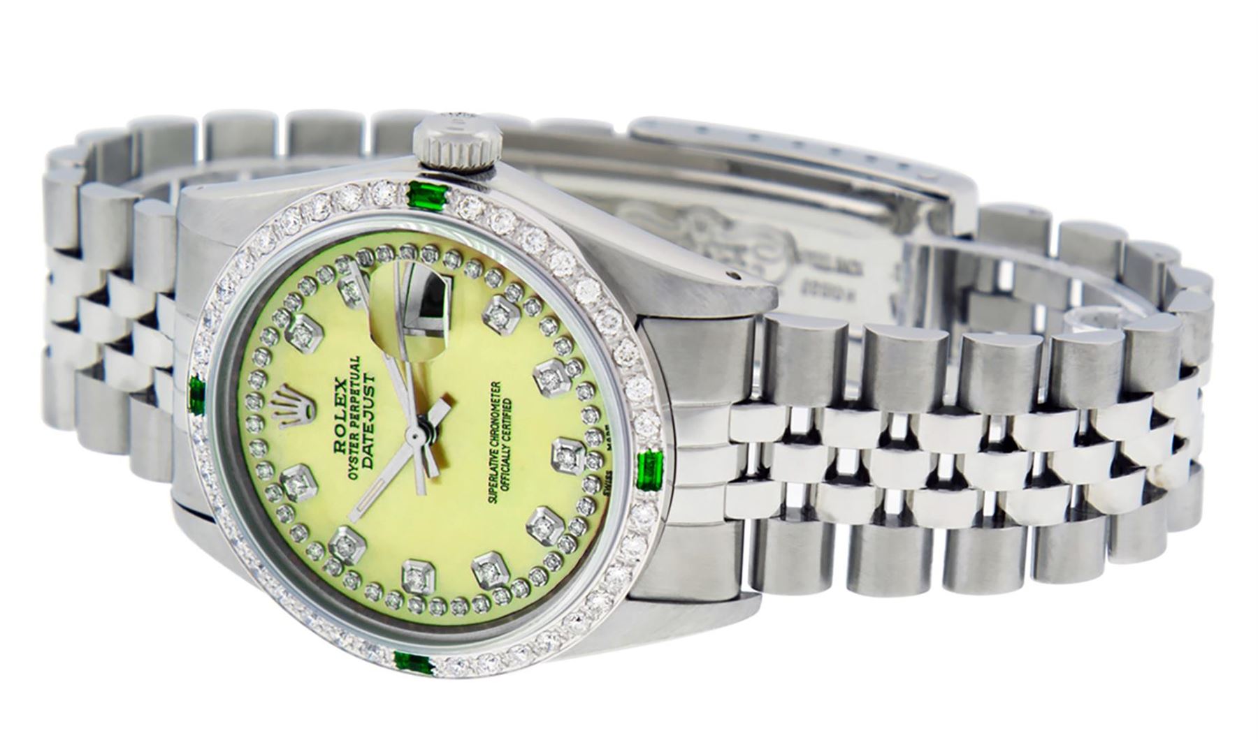 One Mens Rolex Datejust Polished Bright with Satin Finish, Serviced & Electronically Tested, Stainless Steel Case: 36mm, Custom Diamond Lugs: 28 Diamonds In Lugs, Color: G to H, Clarity: SI-VS. Stainless Steel Crown, New Custom Bezel: 18K White Gold Diamond + Emerald Beadset, Diamond Count: 36 Diamonds + 4 Emeralds, Total Weight 1.00 Carat, Clarity: SI-VS, Color: G to H. Custom Crystal: New Scratch Resistant Synthetic Sapphire Cyclops Lens. Custom Hands: New Luminescent Hands. Movement: Automatic Winding Movement Caliber 3035. Custom Dial: Yellow Mother Of Pearl String, Stone Count: 58 Diamonds In Dial, Diamond Color: G To H In Color, Clarity: VS. Date Window: 3 O'Clock Position Date Display, Quickset, Model: Datejust Condition: G-6 Extra Fine. Bracelet: Stainless Steel Jubilee Band. Bright Polish & Satin Finish. 7.0 Inch Length, Adjustable. Standard Clasp, With Rolex Logo. This Watch Has Been Serviced And Polished And Its Free Of All Dents And Scratches.