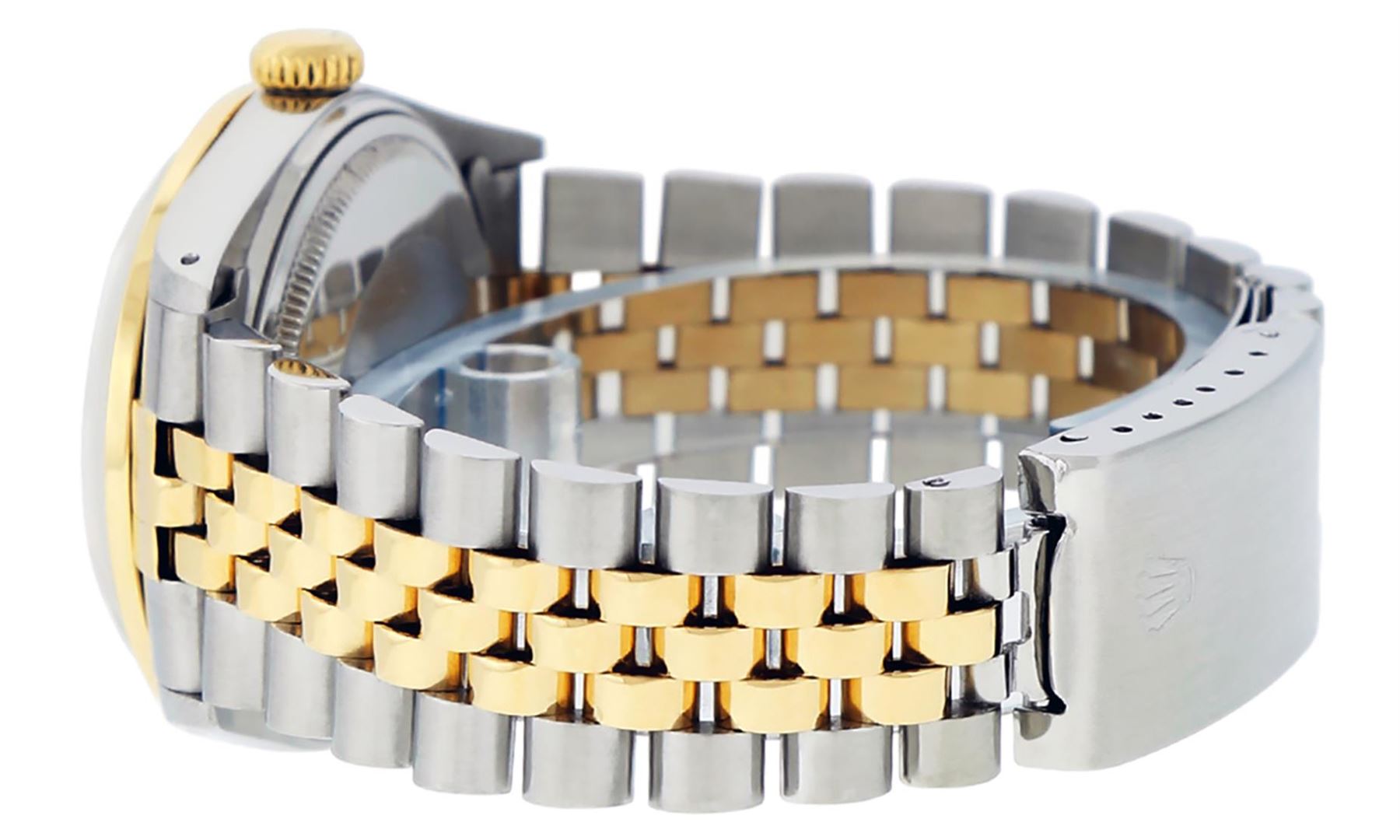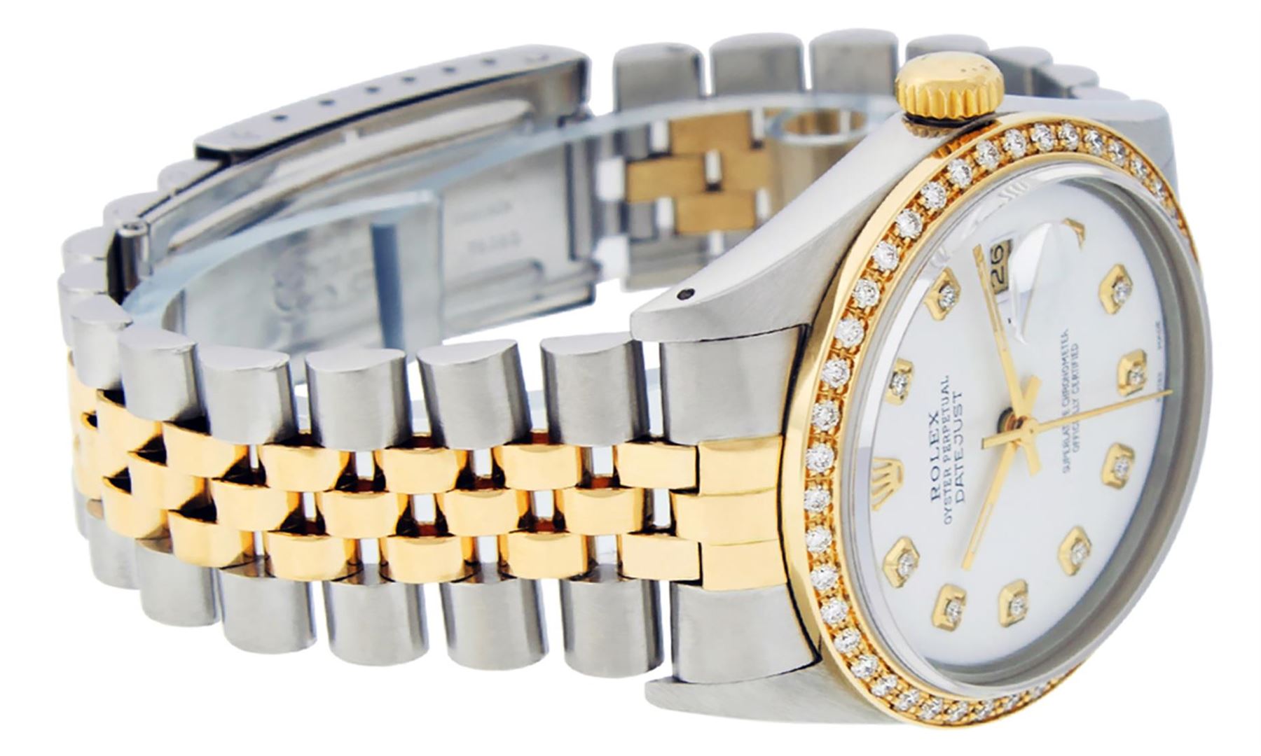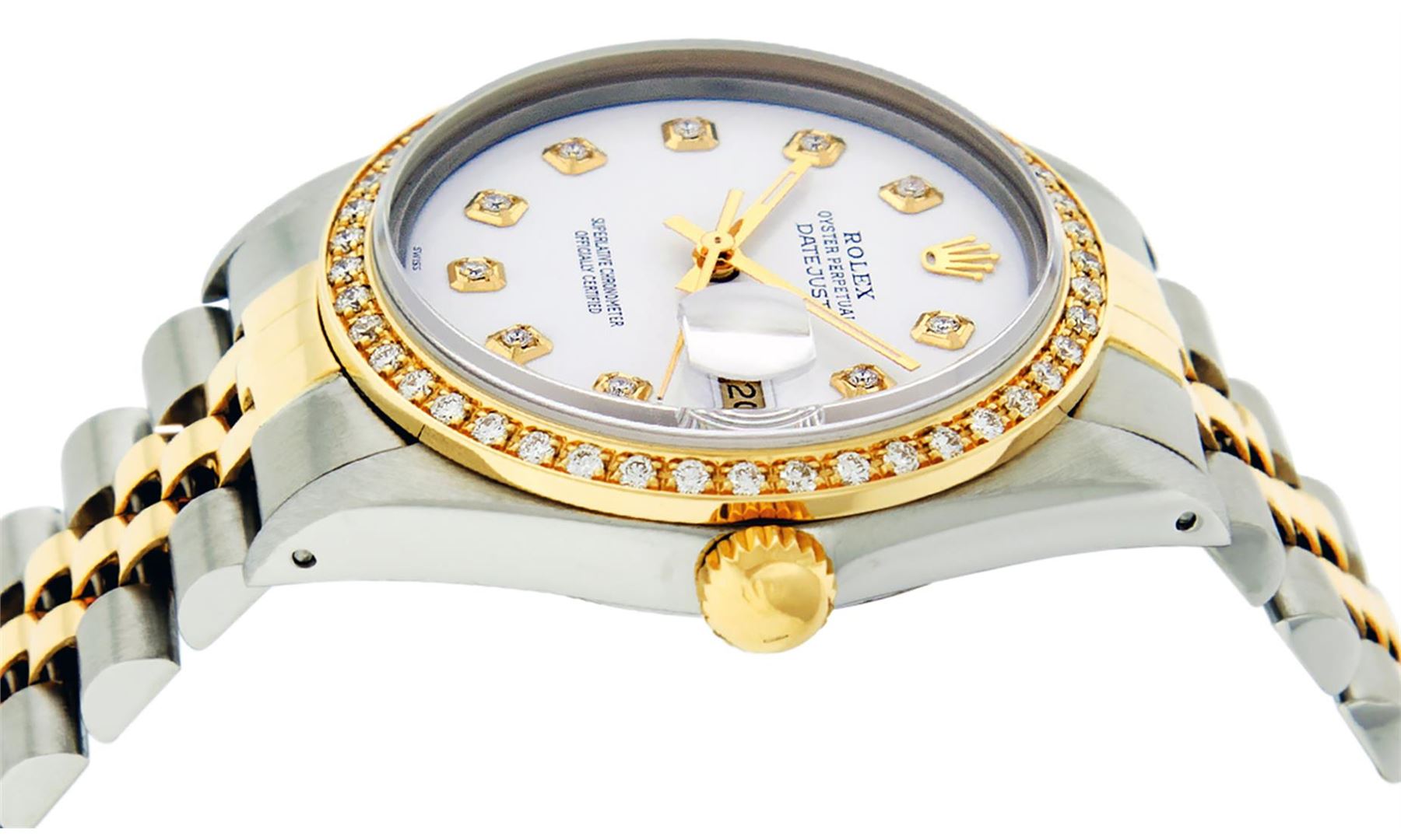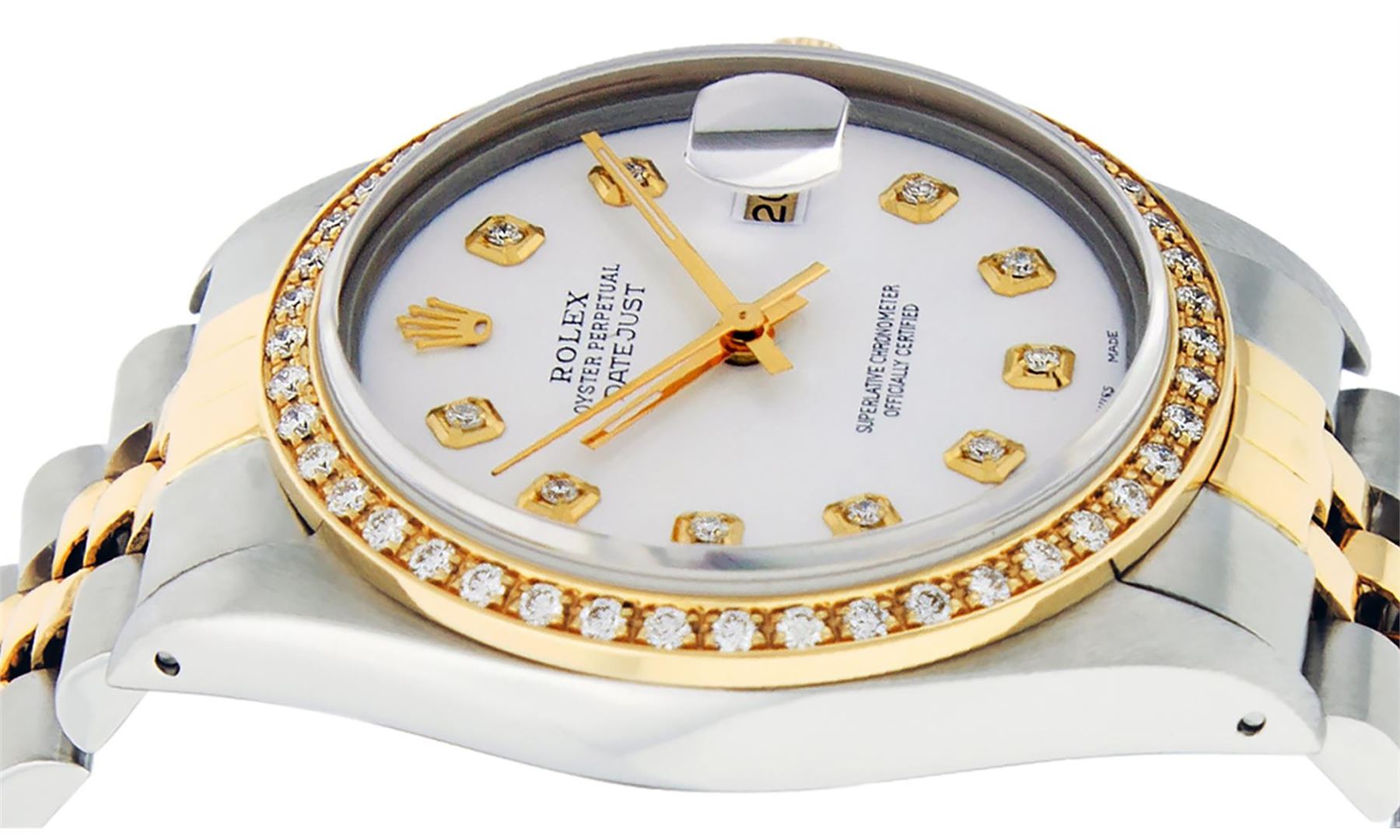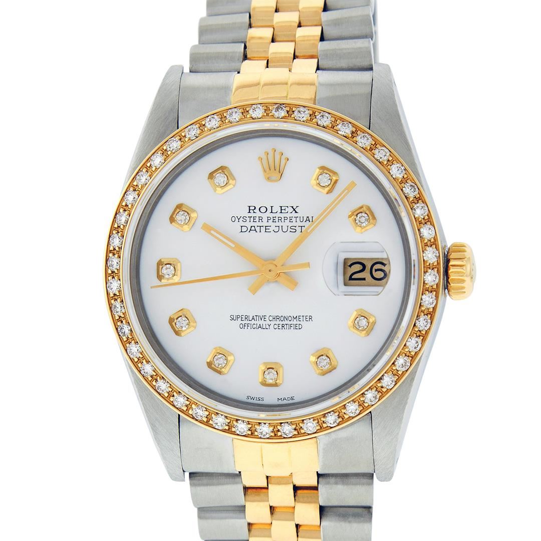 One Mens Pre Owned Rolex Yellow Gold And Steel Two Tone Rolex Datejust Polished, Serviced & Electronically Tested, Rolex Case: Yellow Gold & Stainless Steel Case: 36mm, Rolex Yellow Gold Crown, Custom Bezel: New 18K Yellow Gold Beadset Diamond Bezel, Diamond Count: 44 Diamonds. Custom Crystal: New Sapphire With Magnified Lens. Rolex Movement: Automatic Winding Movement 3035. Custom Dial: Custom White Diamond Dial With Added Diamonds, Diamond Count: 10 Diamonds On Dial. Date Window: 3 O'Clock Position Date Display, Quickset, Model: Datejust, Condition: G-6 Extra Fine. Rolex Bracelet: Two Tone Yellow Gold And Stainless Steel Jubilee Band. Bright Polish. 7.0 Inch Length, Adjustable. Standard Clasp, With Rolex Logo. This Watch Has Been Serviced Time Tested And Is In Excellent Condition It Is Free Of All Scratches And Dents.