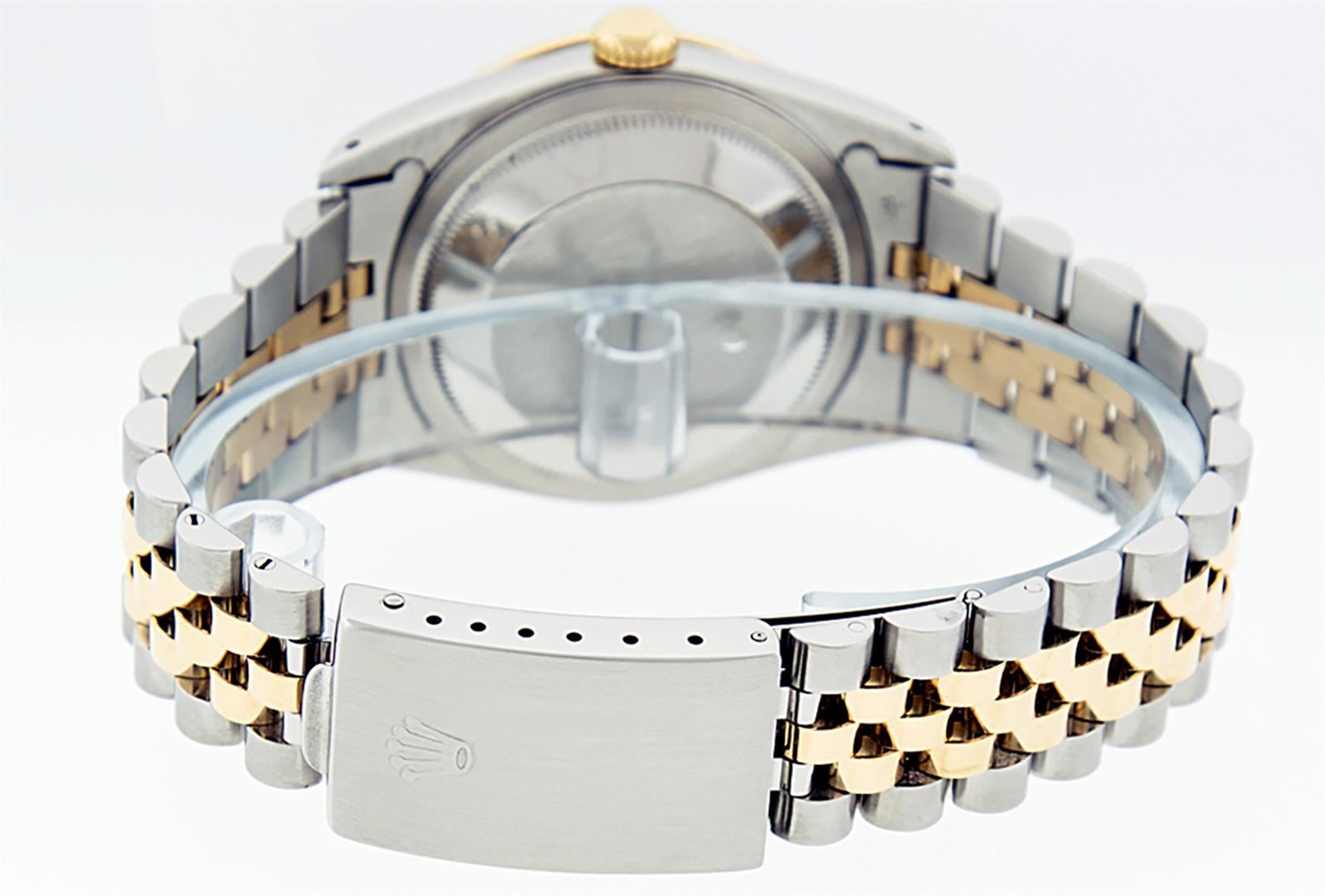 One Mens Pre Owned Rolex Two Tone Yellow Gold And Stainless Steel Rolex Datejust Polished, Serviced & Electronically Tested, Rolex Yellow Gold & Stainless Steel Case: 36mm, Rolex Yellow Gold Crown, Custom Bezel: New 18K Yellow Gold Beadset + Sapphire Diamond Bezel, Stone Count: 36 Diamonds + 4 Sapphires On The Bezel. Custom Crystal: New Sapphire With Date Window. Custom Hands: New Luminescent Hands. Rolex Movement: Automatic Winding Movement 3035. Custom Dial: Custom Black Dial With Added Diamonds. Diamond Count: 10 Diamonds On Dial. Date Window: 3 O'Clock Position Date Display, Quickset, Model: Datejust. Condition: G-6 Extra Fine. Rolex Bracelet: Two Tone Yellow Gold And Stainless Steel Jubilee Band. Bright Polish. 7.0 Inch Length, Adjustable. Standard Clasp, With Rolex Logo. This Watch Has Been Serviced Time Tested And Is In Excellent Condition It Is Free Of All Scratches And Dents.