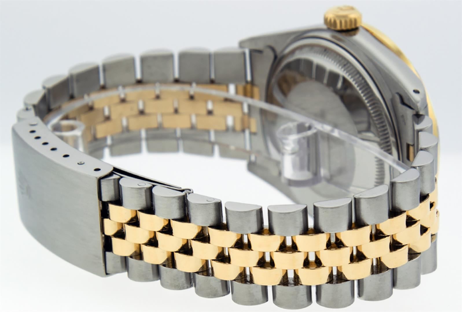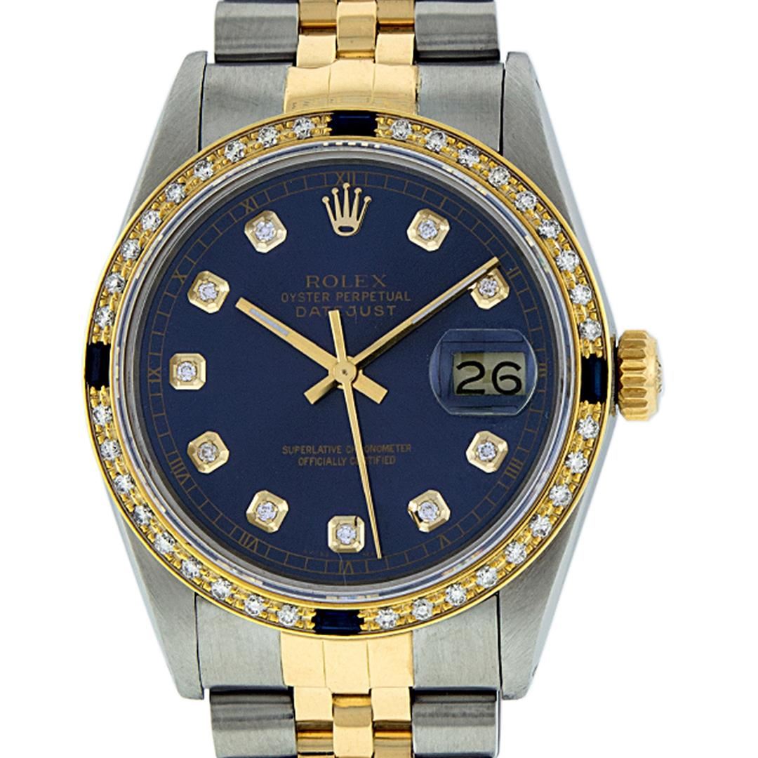 One Mens Pre Owned Rolex Yellow Gold And Stainless Steel Two Tone Rolex Datejust Polished, Serviced & Electronically Tested, Rolex Case: Yellow Gold & Stainless Steel Case: 36mm, Rolex Yellow Gold Crown, Custom Bezel: New 18K Yellow Gold Sapphire Beadset Diamond Bezel, Diamond Count: 36 Diamonds + 4 Sapphires. Custom Crystal: New Sapphire With Magnified Date Window. Custom Hands: New Luminescent Hands. Rolex Movement: Automatic Winding Movement 3035. Custom Dial: Custom Blue Dial With Added Diamond Hour Markers. Diamond Count: 10 Diamonds. Date Window: 3 O'Clock Position Date Display, Quickset, Model: Datejust Condition: G-6 Extra Fine. Rolex Bracelet: Two Tone Yellow Gold And Stainless Steel Jubilee Band. Bright Polish. 7.0 Inch Length, Adjustable. Standard Clasp, With Rolex Logo. This Watch Has Been Serviced Time Tested And Is In Excellent Condition It Is Free Of All Scratches And Dents.
