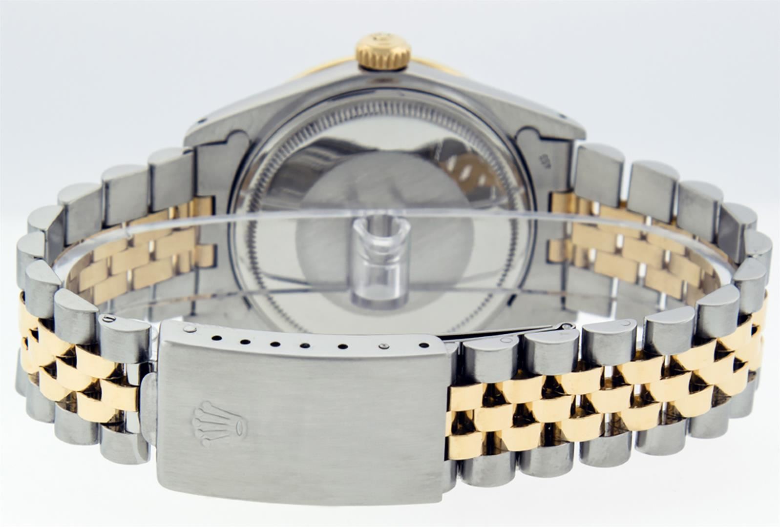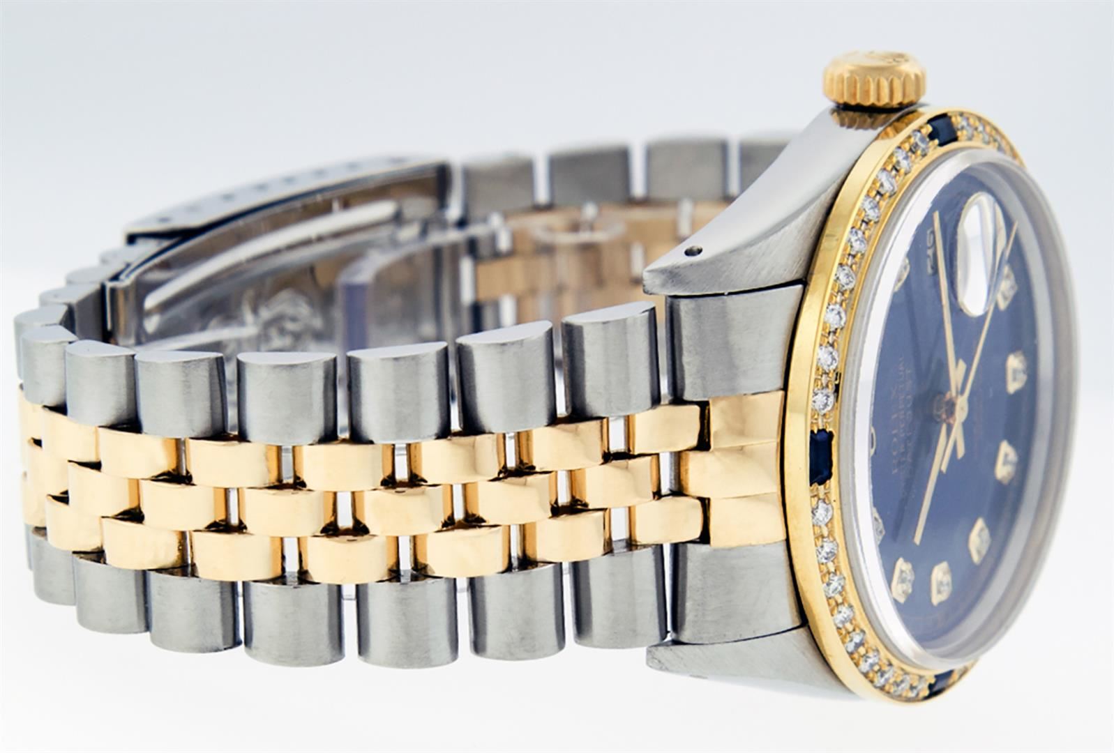 One Mens Pre Owned Rolex Yellow Gold And Stainless Steel Two Tone Rolex Datejust Polished, Serviced & Electronically Tested, Rolex Case: Yellow Gold & Stainless Steel Case: 36mm, Rolex Yellow Gold Crown, Custom Bezel: New 18K Yellow Gold Sapphire Beadset Diamond Bezel, Diamond Count: 36 Diamonds + 4 Sapphires. Custom Crystal: New Sapphire With Magnified Date Window. Custom Hands: New Luminescent Hands. Rolex Movement: Automatic Winding Movement 3035. Custom Dial: Custom Blue Dial With Added Diamond Hour Markers. Diamond Count: 10 Diamonds. Date Window: 3 O'Clock Position Date Display, Quickset, Model: Datejust Condition: G-6 Extra Fine. Rolex Bracelet: Two Tone Yellow Gold And Stainless Steel Jubilee Band. Bright Polish. 7.0 Inch Length, Adjustable. Standard Clasp, With Rolex Logo. This Watch Has Been Serviced Time Tested And Is In Excellent Condition It Is Free Of All Scratches And Dents.