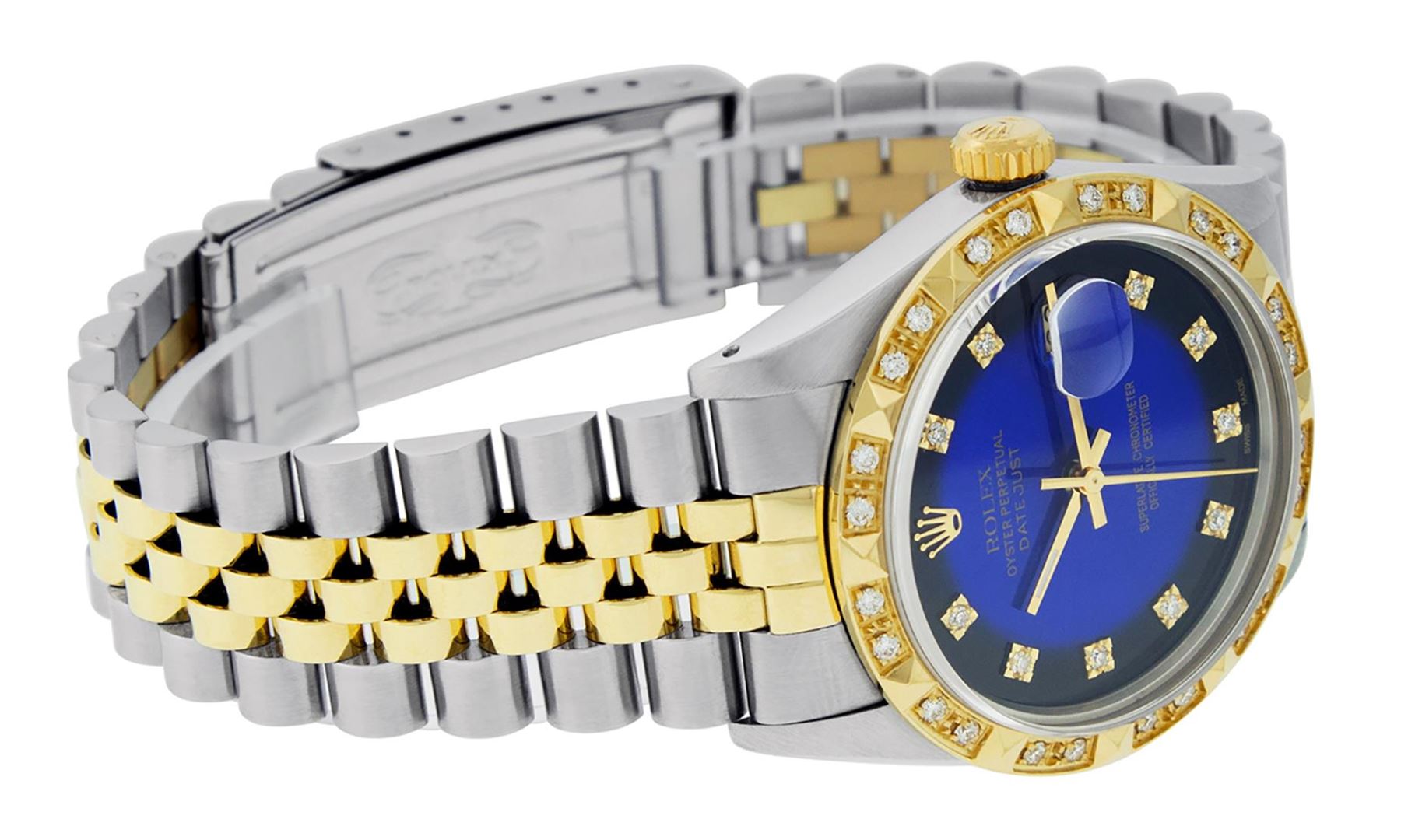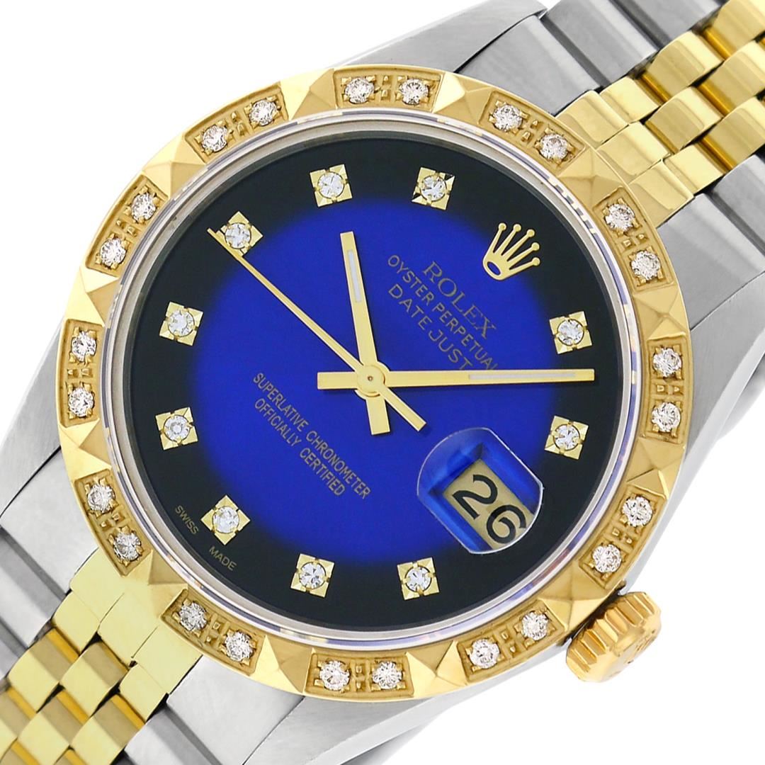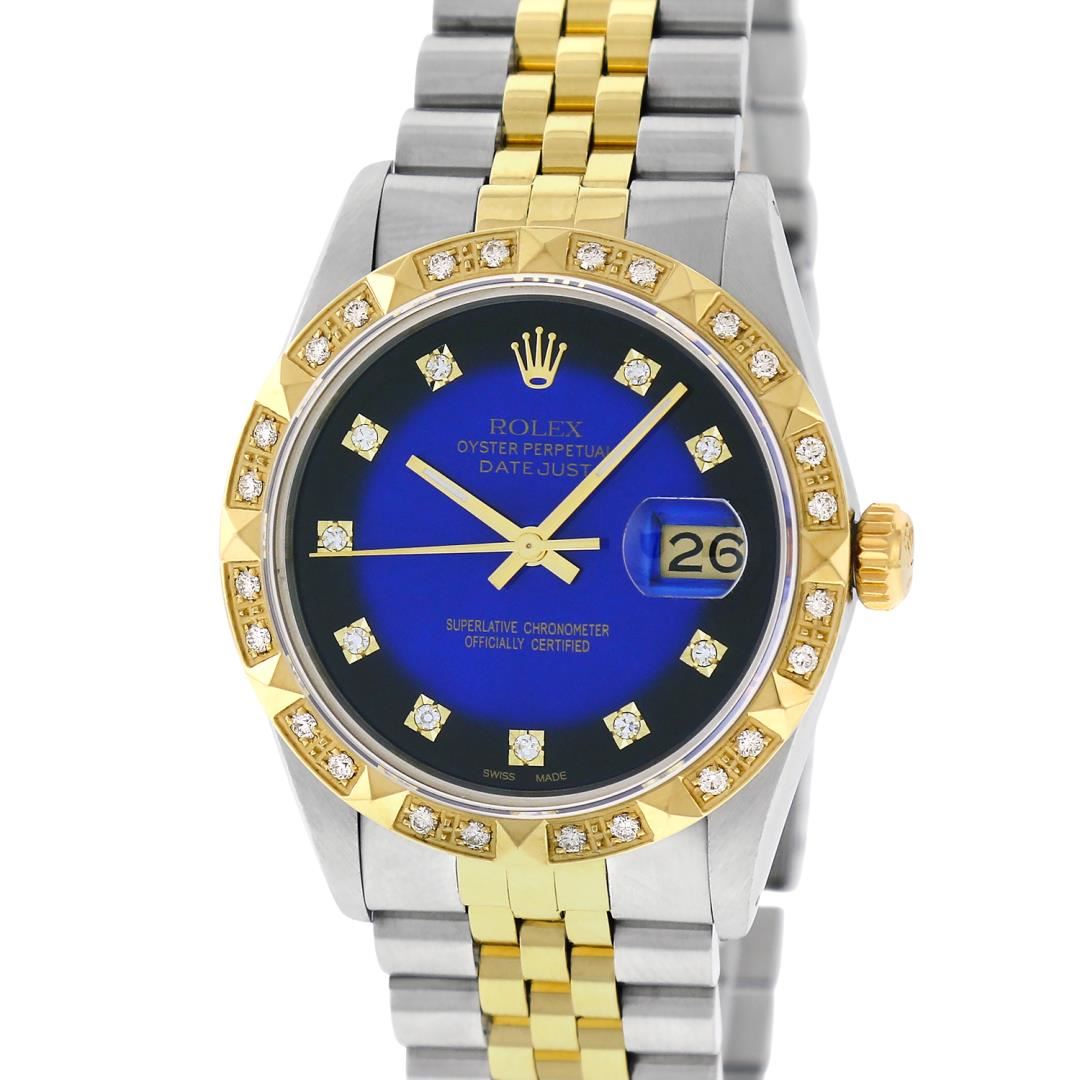 One Mens Pre Owned Two Tone Yellow Gold And Stainless Steel Rolex Datejust Polished Bright with Satin Finish, Serviced And Electronically Tested, Stainless Steel Case: 36mm, Yellow Gold Crown, Custom Bezel: New 18K Yellow Gold Pyramid Diamond Bezel, Diamond Count: 24 Diamonds In Bezel. Custom Crystal: New Sapphire With Date Window. Custom Hands: New Luminescent Hands. Rolex Movement: Automatic Winding Movement 3035. Custom Dial: Custom Blue Vignette Dial With Added Diamonds, Diamond Count: 10 Diamonds On Dial. Date Window: 3 O'Clock Position Date Display, Quickset, Model: Datejust. Condition: G-6 Extra Fine. Rolex Bracelet: Yellow Gold And Stainless Steel Jubilee Band. Bright Polish And Satin Finish. 7.0 Inch Length, Adjustable. Standard Clasp, With Rolex Logo. This Watch Has Been Serviced And Polished It Is Free Of All Scratches And Dents.