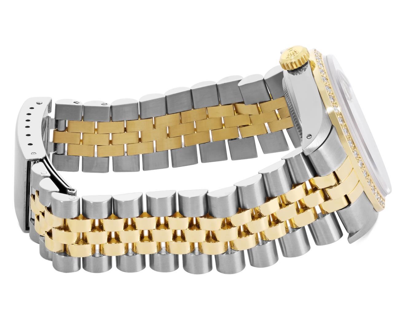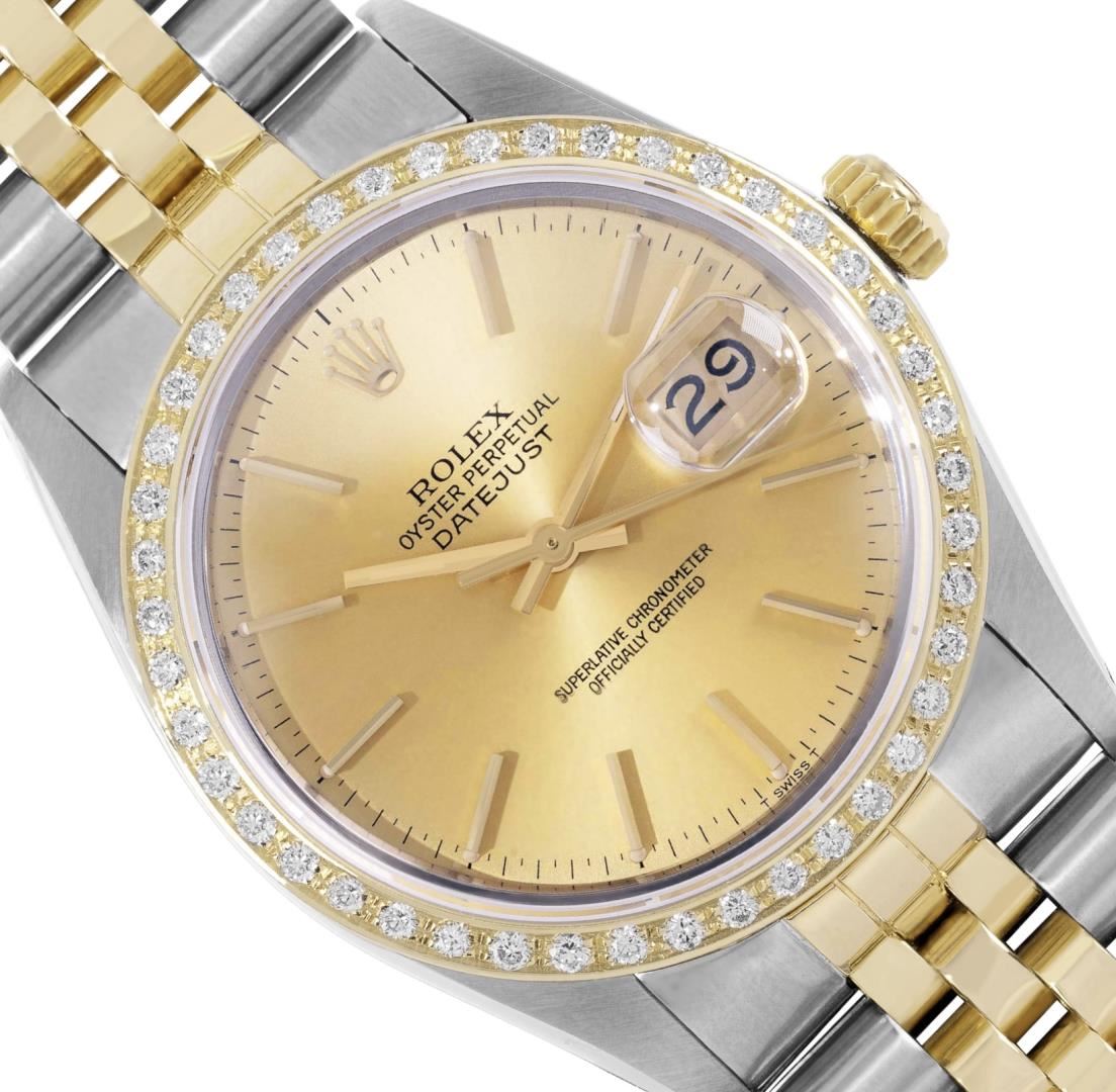 One Mens Pre Owned Yellow Gold Two Tone Rolex Datejust Polished, Serviced And Electronically Tested, Rolex Yellow Gold And Stainless Steel Case: 36mm, Rolex Yellow Gold Crown, Custom Bezel: New 18K Yellow Gold Beadset Diamond Bezel, Diamond Count: 44 Diamonds. Custom Crystal: New Sapphire With Magnified Date Window. Custom Hands: New Luminescent Hands. Rolex Movement: Automatic Winding Movement 3035. Rolex Dial: Champagne Dial With Index Hour Markers and Dash Track With Lumi Dots. Date Window: 3 O'Clock Position Date Display, Quickset, Model: Quickset Datejust. Condition: G-6 Extra Fine. Rolex Bracelet: Two Tone Yellow Gold And Stainless Steel Jubilee Band. Bright Polish. 7.0 Inch Length, Adjustable. Standard Clasp, With Rolex Logo. This Watch Has Been Serviced Time Tested And Is In Excellent Condition It Is Free Of All Scratches And Dents. This Watch Comes With A Rolex Box.