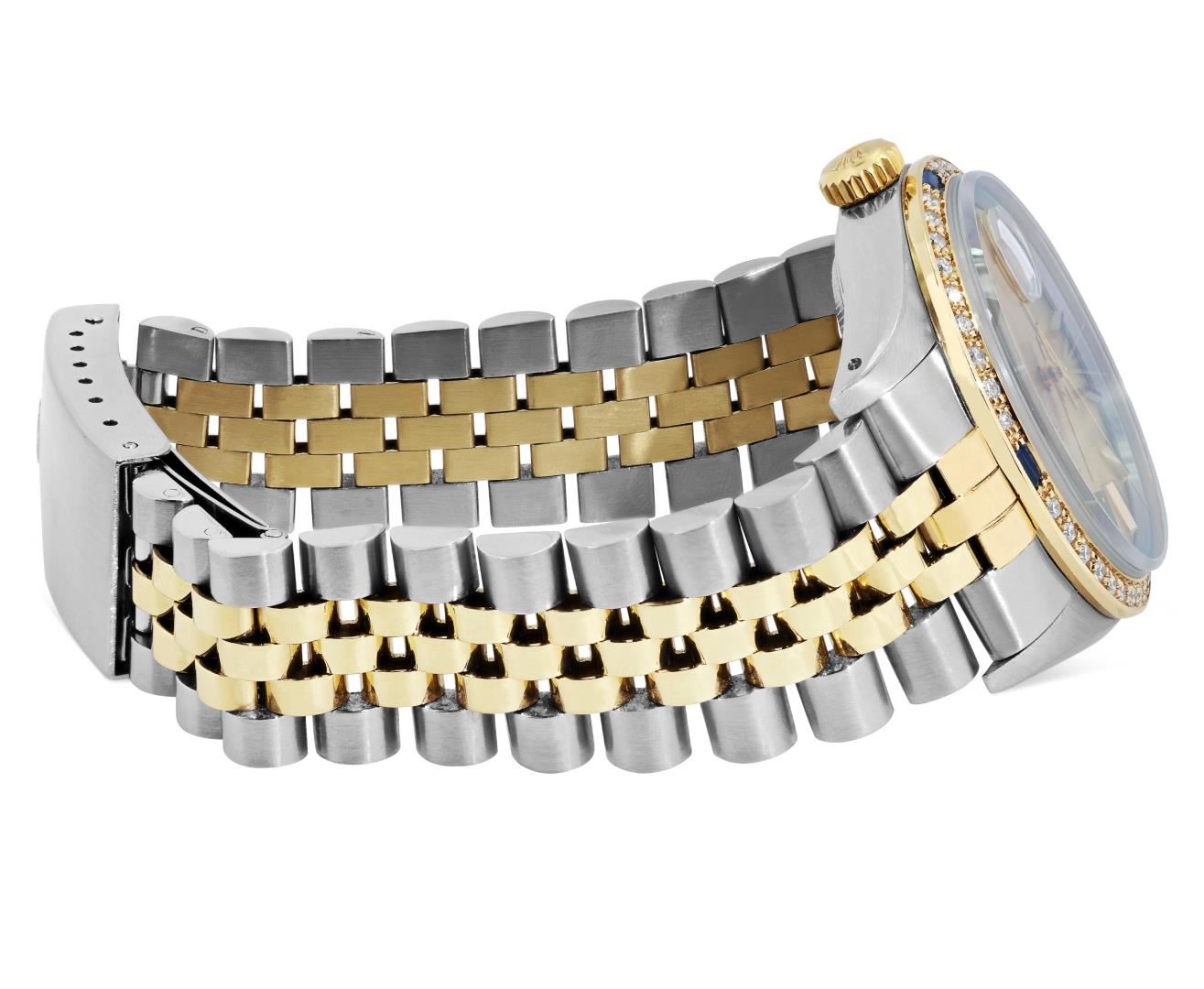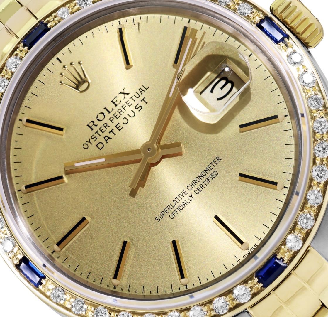 One Mens Pre Owned Two Tone Yellow Gold And Stainless Steel Rolex Datejust Polished, Serviced And Electronically Tested, Yellow Gold And Stainless Steel Case: 36mm, Rolex Yellow Gold Crown, Custom Bezel: New 18K Yellow Gold Sapphire Beadset Diamond Bezel, Diamond Count: 36 Diamonds + 4 Sapphires. Custom Crystal: New Sapphire With Magnified Date Window. Custom Hands: New Hands. Rolex Movement: Automatic Winding Movement 3035. Rolex Factory Dial: Champagne Index With Dash Track And Lumi Dots. Date Window: 3 O'Clock Position Date Display, Quickset, Model: Quickset Datejust. Condition: G-6 Extra Fine. Rolex Bracelet: Two Tone Yellow Gold And Stainless Steel Jubilee Band. Bright Polish. 7.0 Inch Length, Adjustable. Standard Clasp, With Rolex Logo. This Watch Has Been Serviced Time Tested And Is In Excellent Condition It Is Free Of All Scratches And Dents. This Watch Comes With A Rolex Box.
