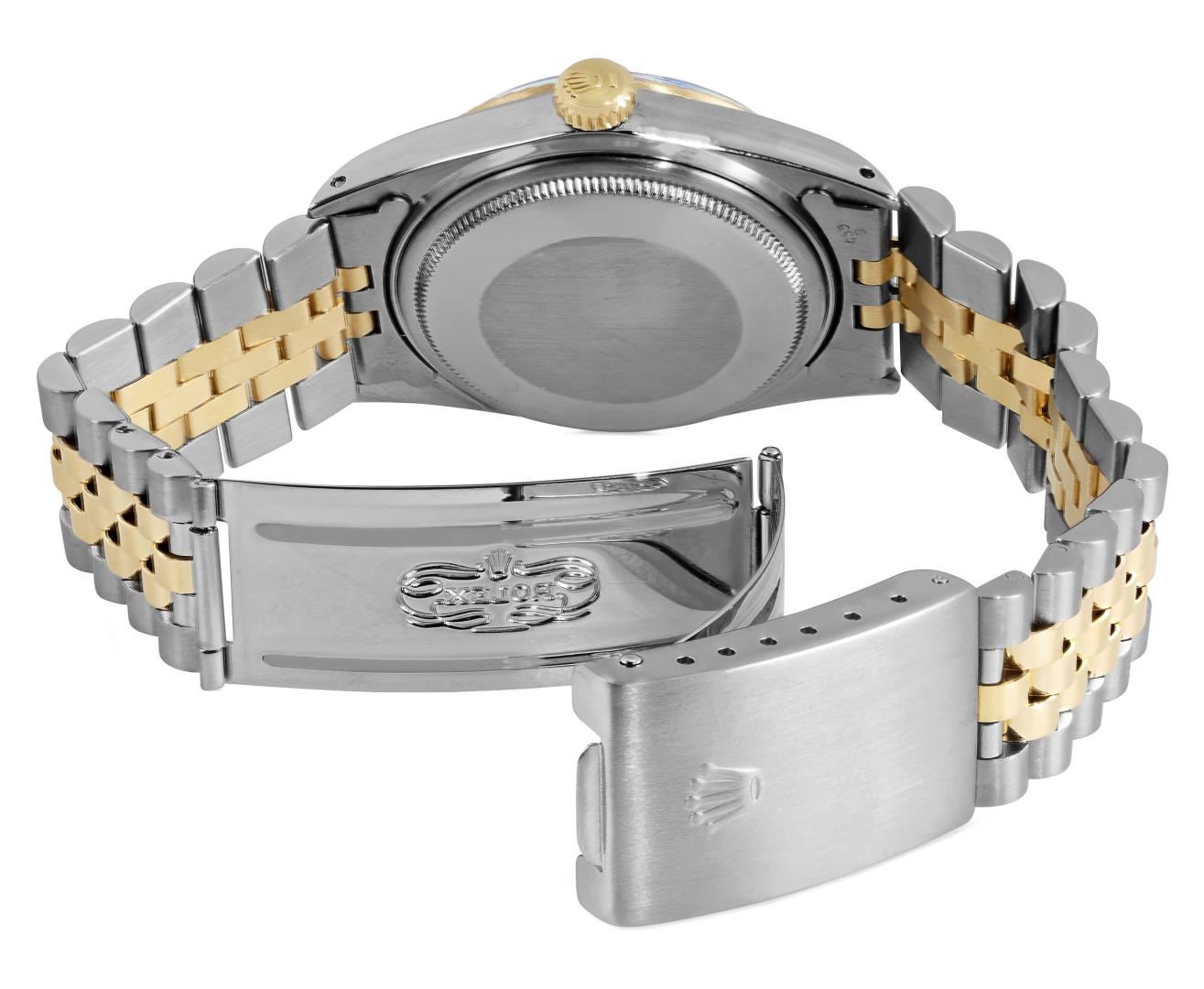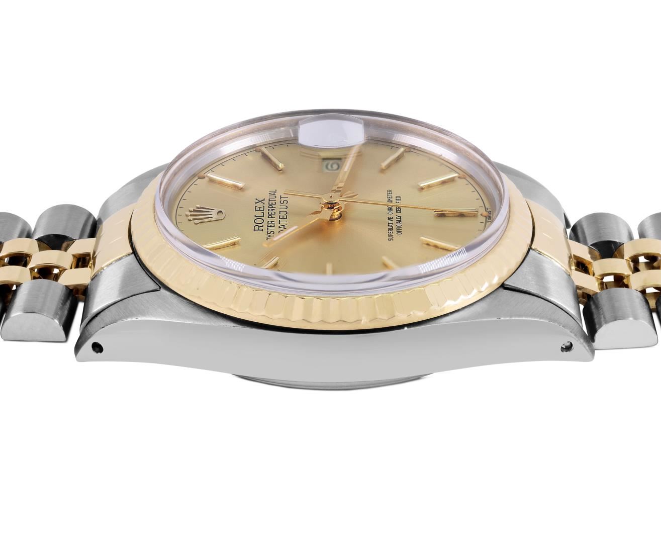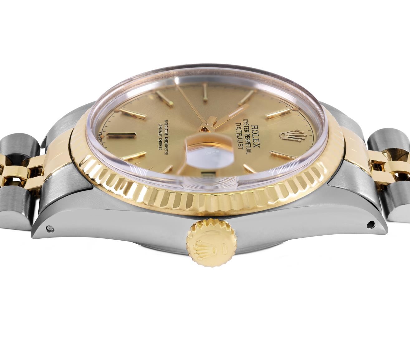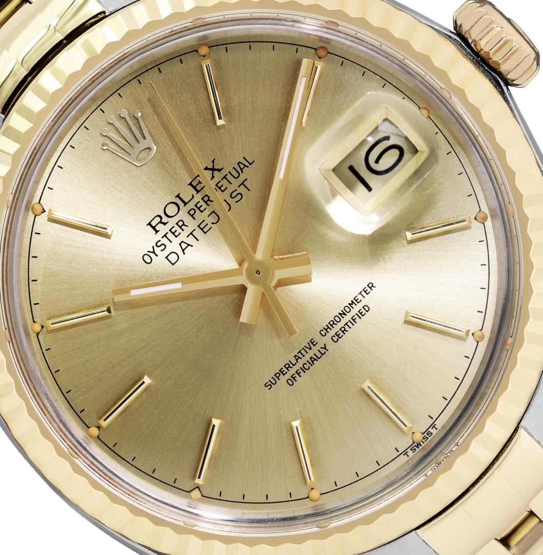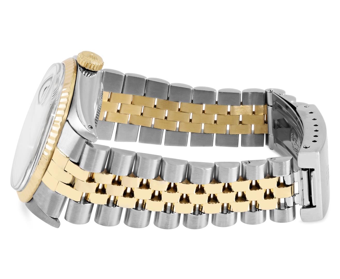 One Mens Pre Owned Yellow Gold Two Tone Rolex Datejust Polished, Serviced And Electronically Tested, Rolex Yellow Gold And Stainless Steel Case: 36mm, Rolex Yellow Gold Crown, Rolex Bezel: Yellow Gold Fluted Bezel. Custom Crystal: New Plastic With Magnified Date Window. Custom Hands: New Luminecent Hands. Rolex Movement: Automatic Winding Movement 3035. Rolex Dial: Champagne Dial With Index Hour Markers and Dash Track With Lumi Dots. Date Window: 3 O'Clock Position Date Display, Quickset, Model: Quickset Datejust. Condition: G-6 Extra Fine. Rolex Bracelet: Two Tone Yellow Gold And Stainless Steel Jubilee Band. Bright Polish. 7.0 Inch Length, Adjustable. Standard Clasp, With Rolex Logo. This Watch Has Been Serviced Time Tested And Is In Excellent Condition It Is Free Of All Scratches And Dents. This Watch Comes With A Rolex Box.