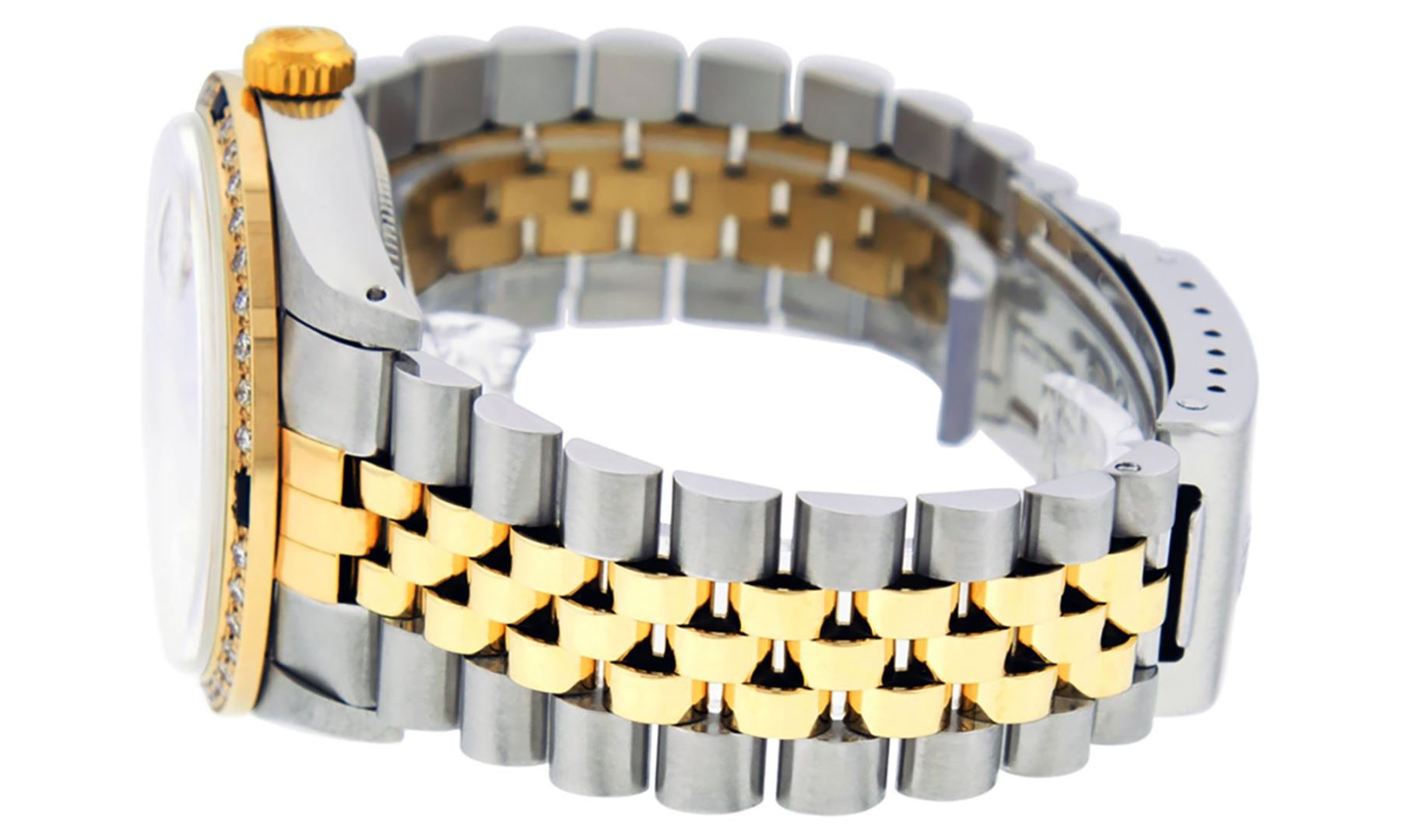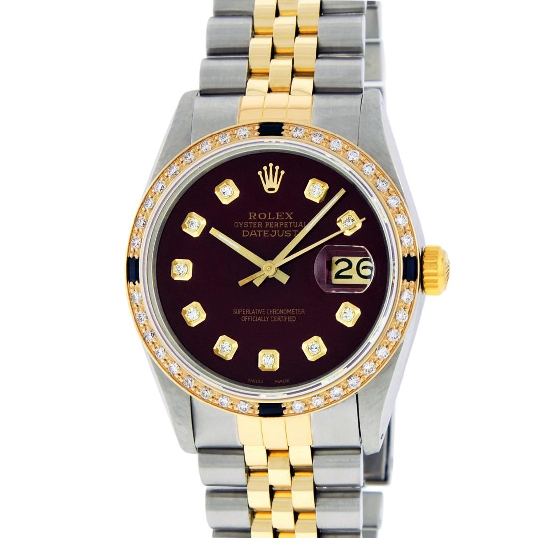 One Mens Pre Owned Two Tone Yellow Gold And Stainless Steel Rolex Datejust Polished, Serviced And Electronically Tested, Rolex Yellow Gold And Stainless Steel Case: 36mm, Rolex Yellow Gold Crown, Custom Bezel: New 18K Yellow Gold Sapphire Beadset Diamond Bezel, Stone Count: 36 Diamonds + 4 Sapphires. Custom Crystal: New Sapphire With Magnified Date Window. Custom Hands: New Luminescent Hands. Rolex Movement: Automatic Winding Movement 3035. Custom Dial: Custom Maroon Dial With Added Diamonds, Diamond Count: 10 Diamonds. Date Window: 3 O'Clock Position Date Display, Quickset, Model: Datejust. Condition: G-6 Extra Fine. Rolex Bracelet: Two Tone Yellow Gold And Stainless Steel Jubilee Band. Bright Polish. 7.0 Inch Length, Adjustable. Standard Clasp, With Rolex Logo. This Watch Has Been Serviced Time Tested And Is In Excellent Condition It Is Free Of All Scratches And Dents.