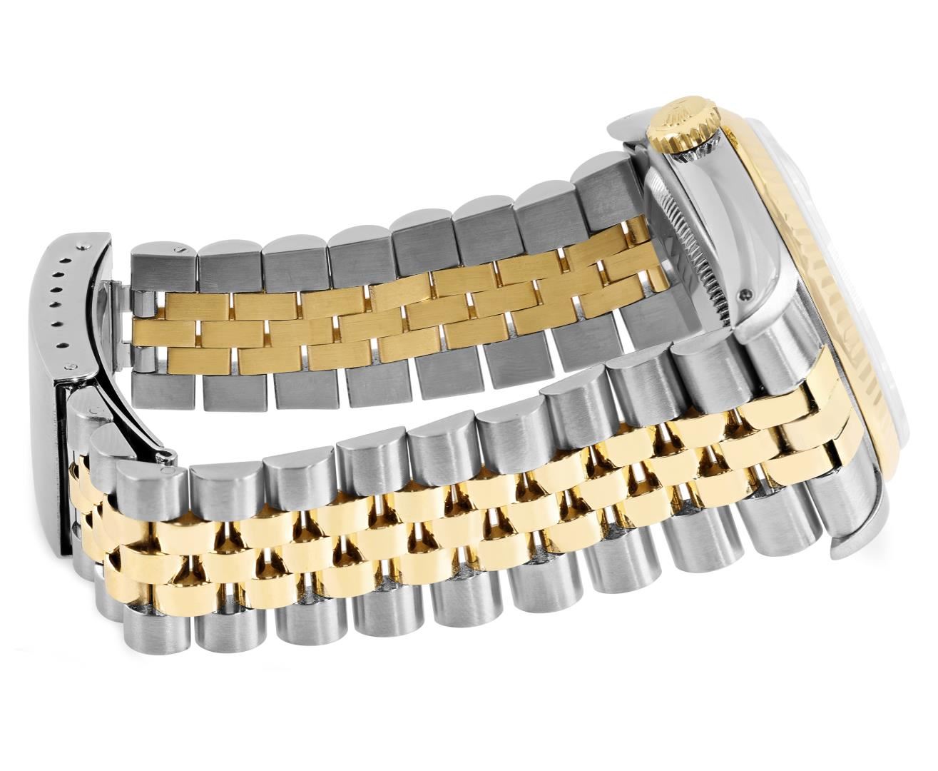 One Mens Pre Owned Yellow Gold Two Tone Rolex Datejust Polished, Serviced And Electronically Tested, Rolex Yellow Gold And Stainless Steel Case: 36mm, Rolex Yellow Gold Crown, Rolex Bezel: 18K Yellow Gold Fluted Bezel. Crystal: Sapphire With Magnified Date Window. Hands: Luminescent Hands. Rolex Movement: Automatic Winding Movement 3135. Rolex Dial: Champagne Dial With Index Hour Markers and Dash Track With Lumi Dots. Date Window: 3 O'Clock Position Date Display, Quickset, Model: Quickset Sapphire Datejust. Condition: G-6 Extra Fine. Rolex Bracelet: Two Tone Yellow Gold And Stainless Steel Jubilee Band. Bright Polish. 7.0 Inch Length, Adjustable. Standard Clasp, With Rolex Logo. This Watch Has Been Serviced Time Tested And Is In Excellent Condition It Is Free Of All Scratches And Dents. This Watch Comes With A Rolex Box.