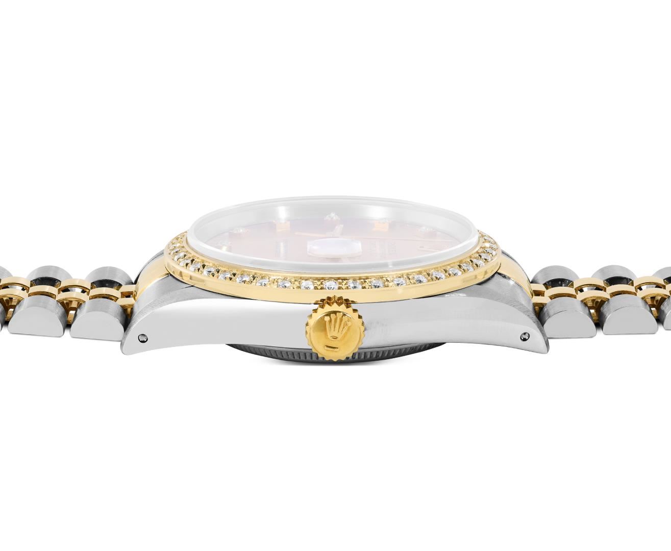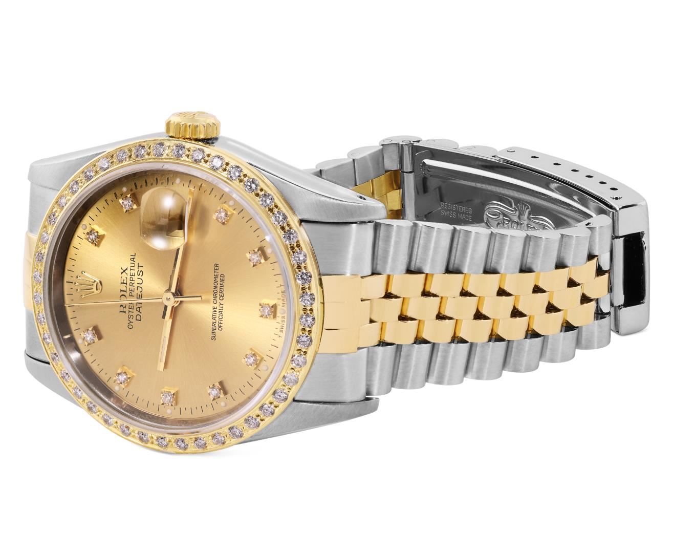 One Mens Pre Owned Two Tone 18K Yellow Gold And Stainless Steel Rolex Datejust Polished, Serviced And Electronically Tested, Rolex Yellow Gold And Stainless Steel Case: 36mm, Rolex Yellow Gold Crown, Custom Bezel: New 18K Yellow Gold Beadset Diamond Bezel, Diamond Count: 44 Diamonds. Custom Crystal: New Sapphire With Magnified Date Window. Custom Hands: New Luminecent Hands. Rolex Movement: Automatic Winding Movement 3135. Rolex Dial: Factory Champagne Dial With Diamond Hour Markers and Dash Track With Lumi Dots, Diamond Count: 10 Diamonds On Dial. Date Window: 3 O'Clock Position Date Display, Quickset, Model: Quickset Datejust. Condition: G-6 Extra Fine. Rolex Bracelet: Two Tone 18K Yellow Gold And Stainless Steel Jubilee Band. Bright Polish. 7.0 Inch Length, Adjustable. Standard Clasp, With Rolex Logo. This Watch Has Been Serviced Time Tested And Is In Excellent Condition It Is Free Of All Scratches And Dents.