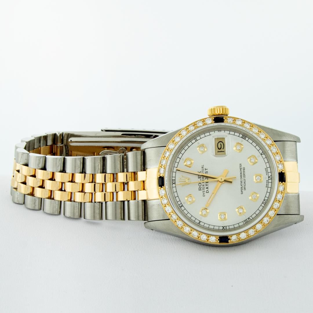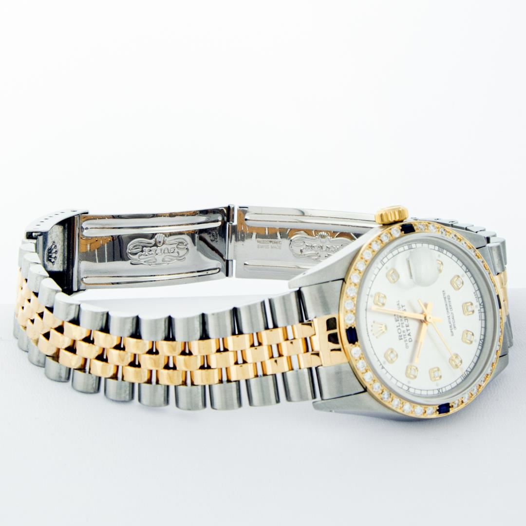 One Mens Pre Owned Two Tone Yellow Gold And Stainless Steel Rolex Datejust Polished, Serviced And Electronically Tested, Rolex Yellow Gold And Stainless Steel Case: 36mm, Yellow Gold Crown, Custom Bezel: New 18K Yellow Gold Sapphire Beadset Diamond Bezel, Diamond Count: 36 Diamonds + 4 Sapphires. Custom Crystal: New Sapphire With Magnified Date. Custom Hands: New Luminescent Hands. Rolex Movement: Automatic Winding Movement 3035. Custom Dial: Custom Silver Dial With Added Diamonds, Diamond Count: 10 Diamonds On Dial. Date Window: 3 O'Clock Position Date Display, Quickset, Model: Datejust. Condition: G-6 Extra Fine. Rolex Bracelet: Two Tone Yellow Gold And Stainless Steel Jubilee Band. Bright Polish. 7.0 Inch Length, Adjustable. Standard Clasp, With Rolex Logo. This Watch Has Been Serviced Time Tested And Is In Excellent Condition It Is Free Of All Scratches And Dents.