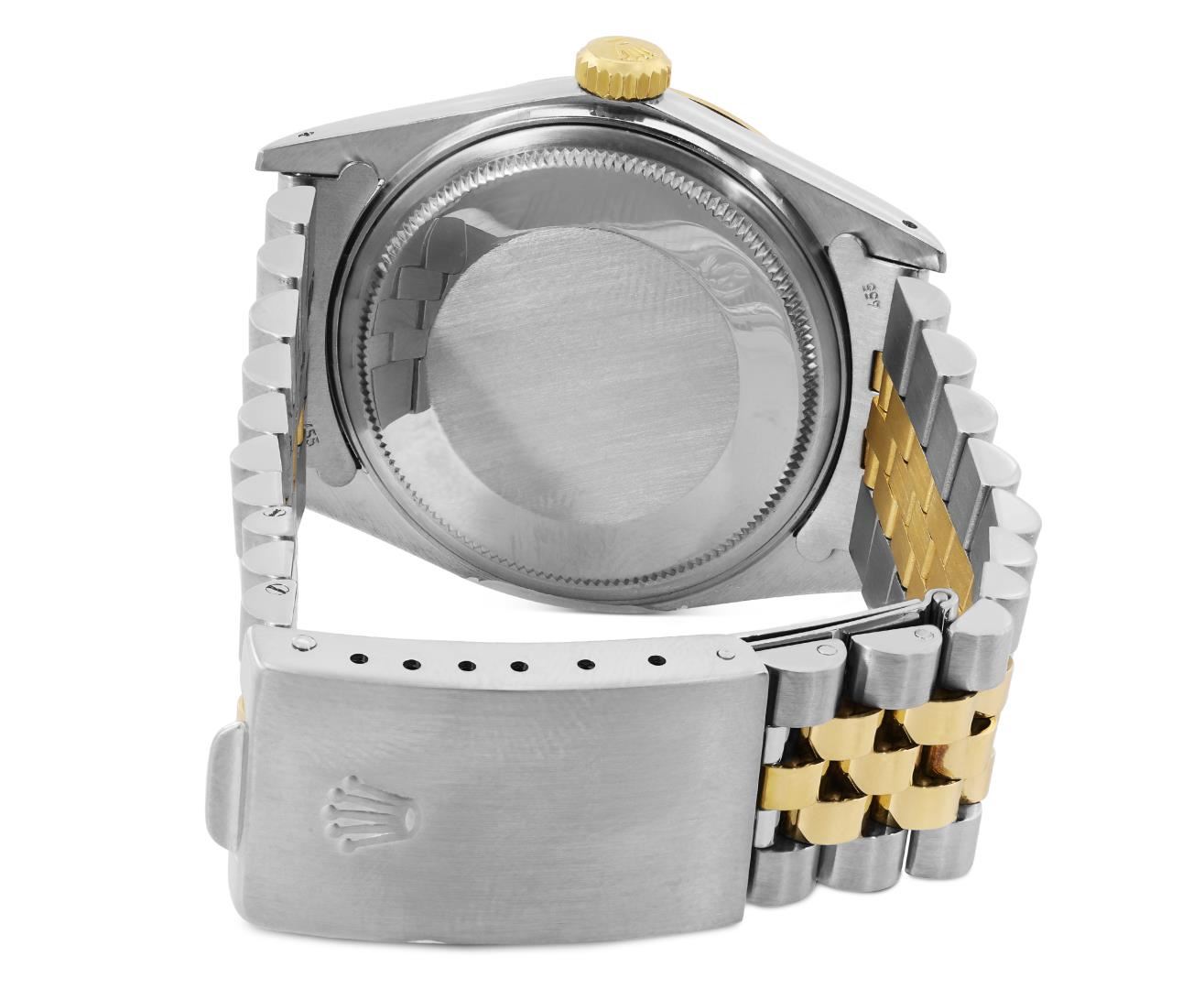One Mens Pre Owned 18K Two Tone Yellow Gold And Stainless Steel Rolex Datejust Polished, Serviced And Electronically Tested, Rolex Yellow Gold And Stainless Steel Case: 36mm, Rolex Yellow Gold Crown, Rolex Bezel: Yellow Gold Fluted Bezel. Custom Crystal: New Plastic With Magnified Date Window. Hands: Luminescent Hands. Rolex Movement: Automatic Winding Movement 3035. Rolex Dial: Champagne Dial With Index Hour Markers and Dash Track With Lumi Dots. Date Window: 3 O'Clock Position Date Display, Quickset, Model: Quickset Datejust. Condition: G-6 Extra Fine. Rolex Bracelet: Two Tone Yellow Gold And Stainless Steel Jubilee Band. Bright Polish. 7.0 Inch Length, Adjustable. Standard Clasp, With Rolex Logo. This Watch Has Been Serviced Time Tested And Is In Excellent Condition It Is Free Of All Scratches And Dents.
