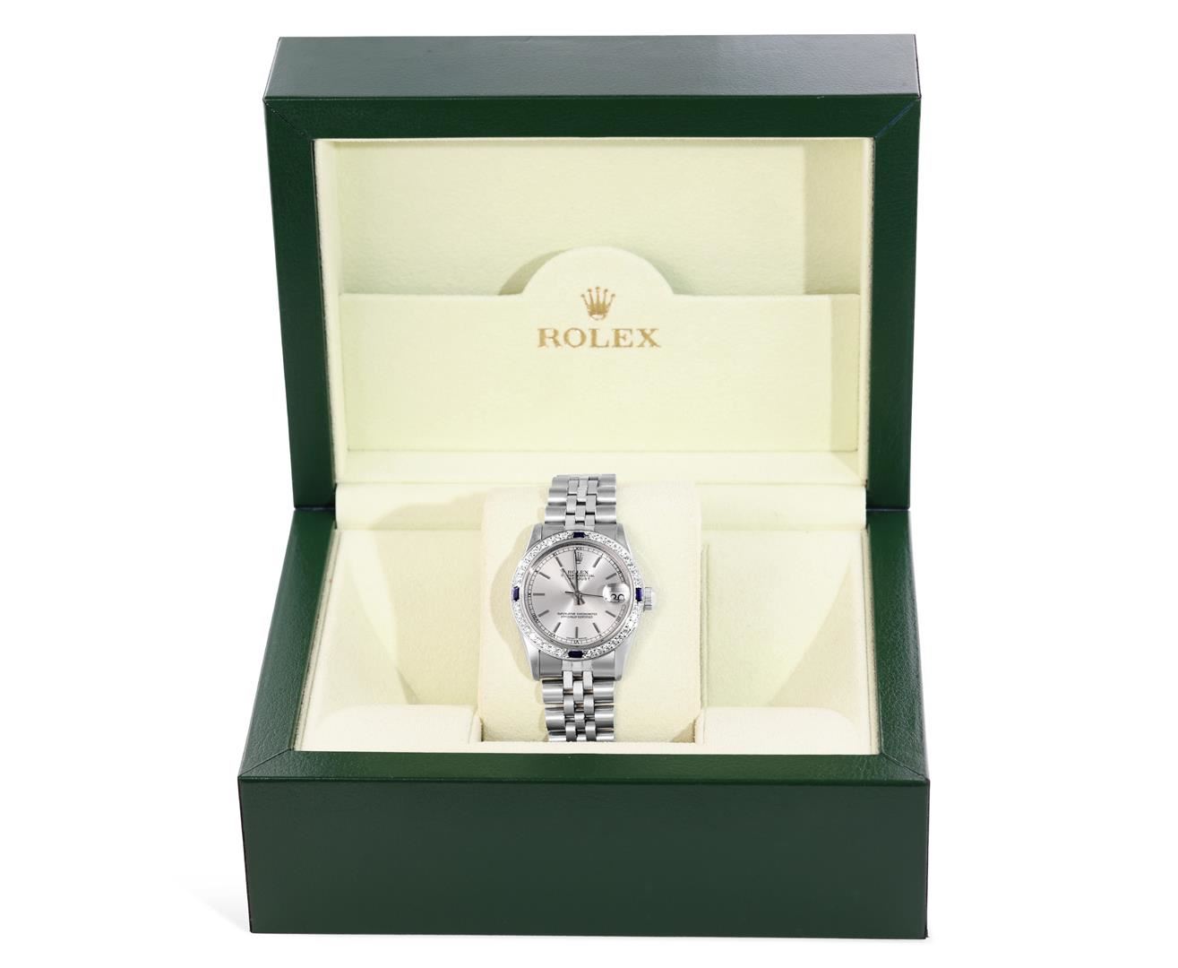 One Rolex Midsize 31MM Quickset Pre Owned Stainless Steel Datejust Wristwatch Polished Bright with Satin Finish, Serviced & Electronically Tested, Stainless Steel Case: 31mm, Stainless Steel Crown, Custom Bezel: New 18K White Gold Sapphire Beadset Diamond
