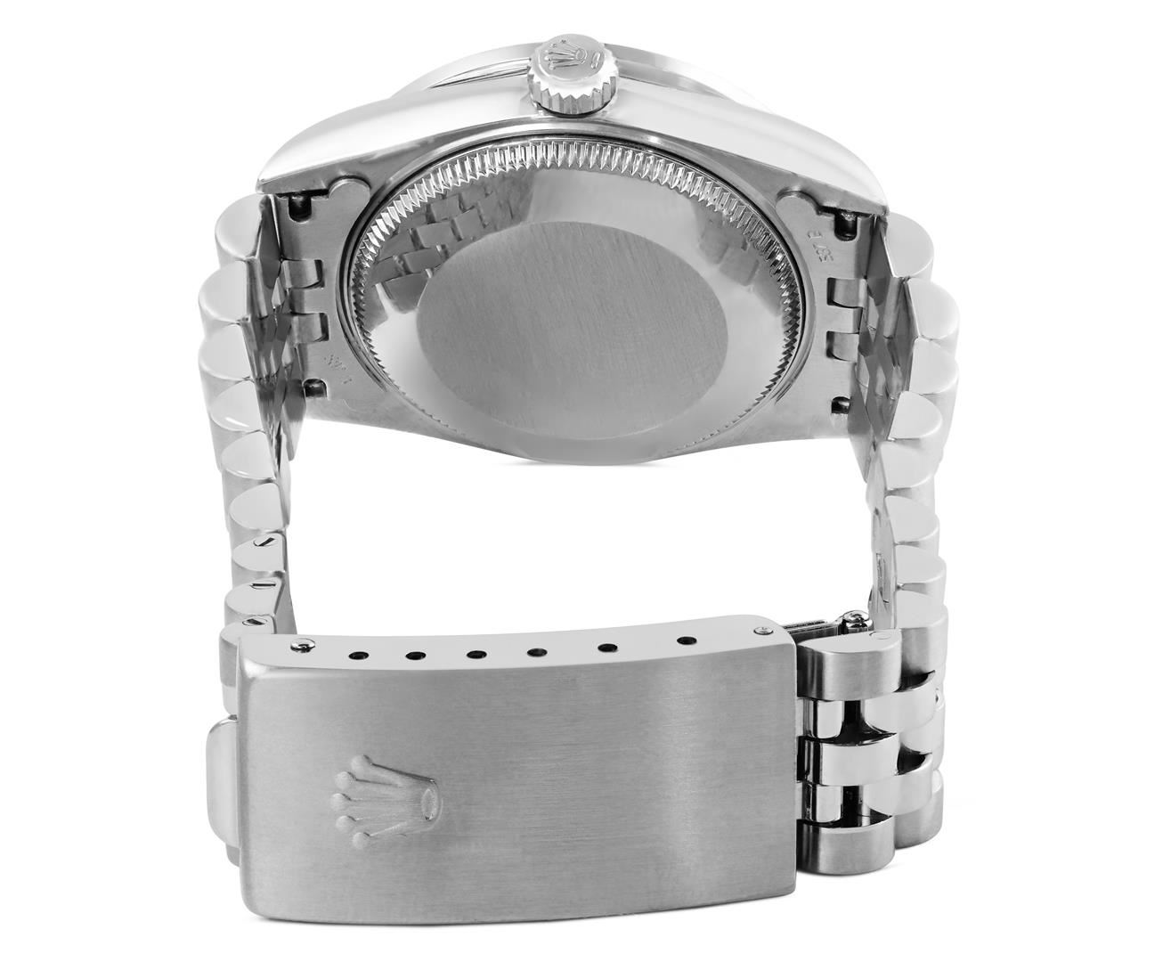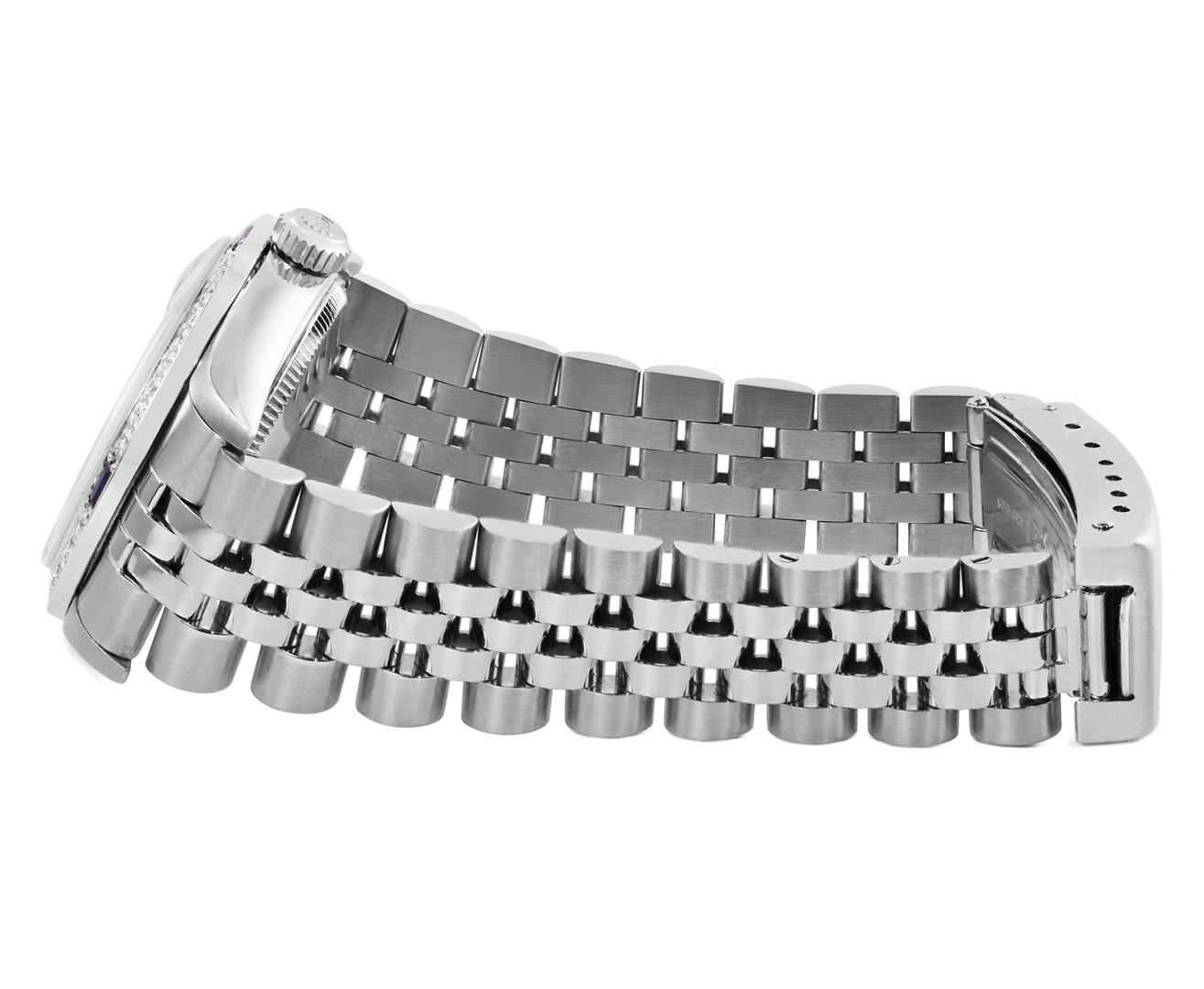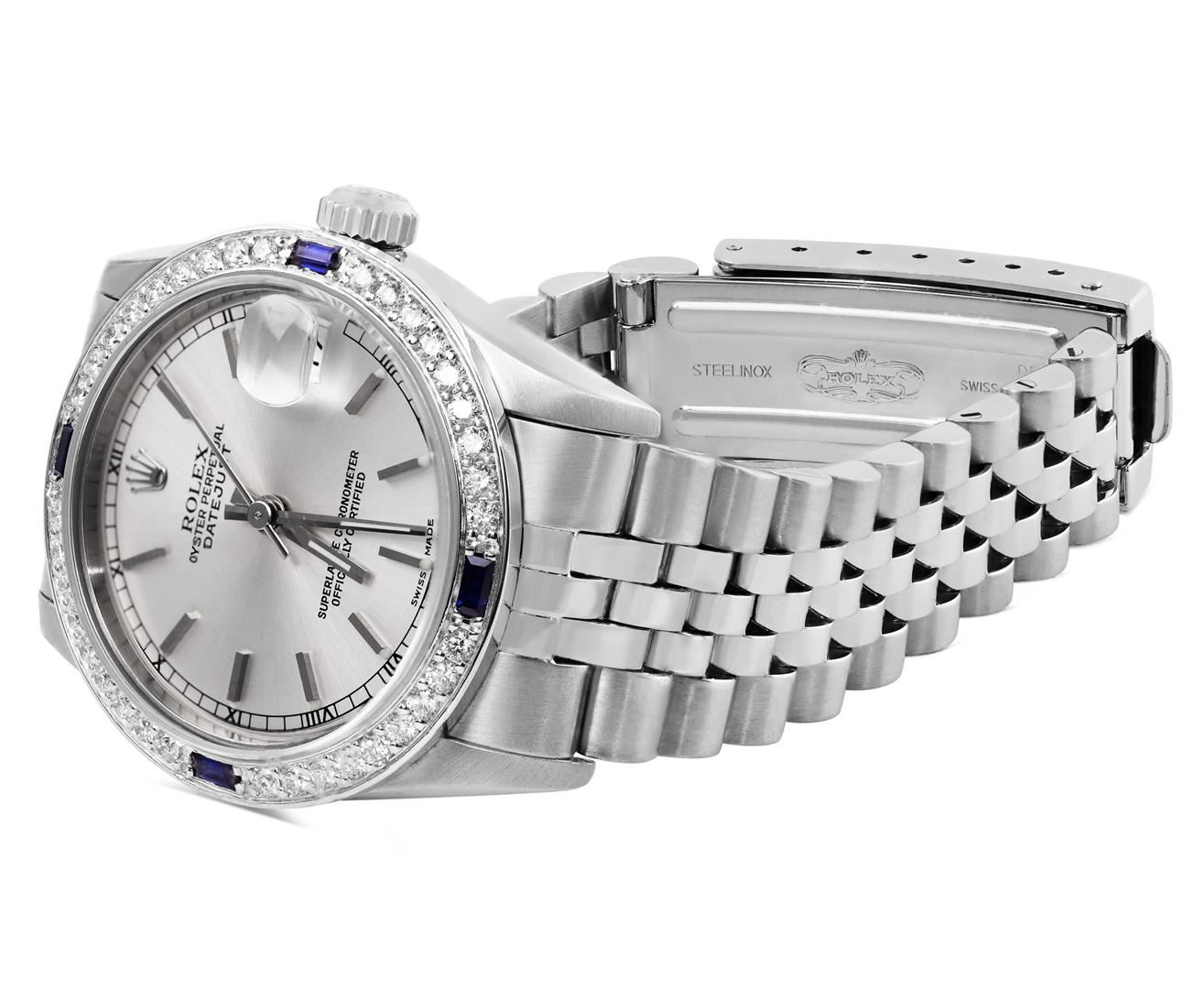 One Rolex Midsize 31MM Quickset Pre Owned Stainless Steel Datejust Wristwatch Polished Bright with Satin Finish, Serviced & Electronically Tested, Stainless Steel Case: 31mm, Stainless Steel Crown, Custom Bezel: New 18K White Gold Sapphire Beadset Diamond Bezel, Diamond + Gem Count: 36 Diamonds + 4 Sapphires, Clarity: SI-VS, Color: G to H. Crystal: Sapphire With Magnified Date Window. Hands: Luminescent Hands. Rolex Movement: Automatic Winding Movement 2235. Rolex Dial: Factory Silver With Index Hour Markers, Lumi Dots, and Roman Track. Date Window: 3 O'Clock Position Date Display, Model: 31MM Quickset Datejust. Condition: G-6 Extra Fine. Rolex Bracelet: Stainless Steel Jubilee Band. Bright Polish & Satin Finish. 6.0 Inch Length, Adjustable. Fold Clasp, With Rolex Logo. This Watch Has Been Serviced Time Tested And Is In Excellent Condition It Is Free Of All Scratches And Dents. This Watch Comes With A Rolex Box.