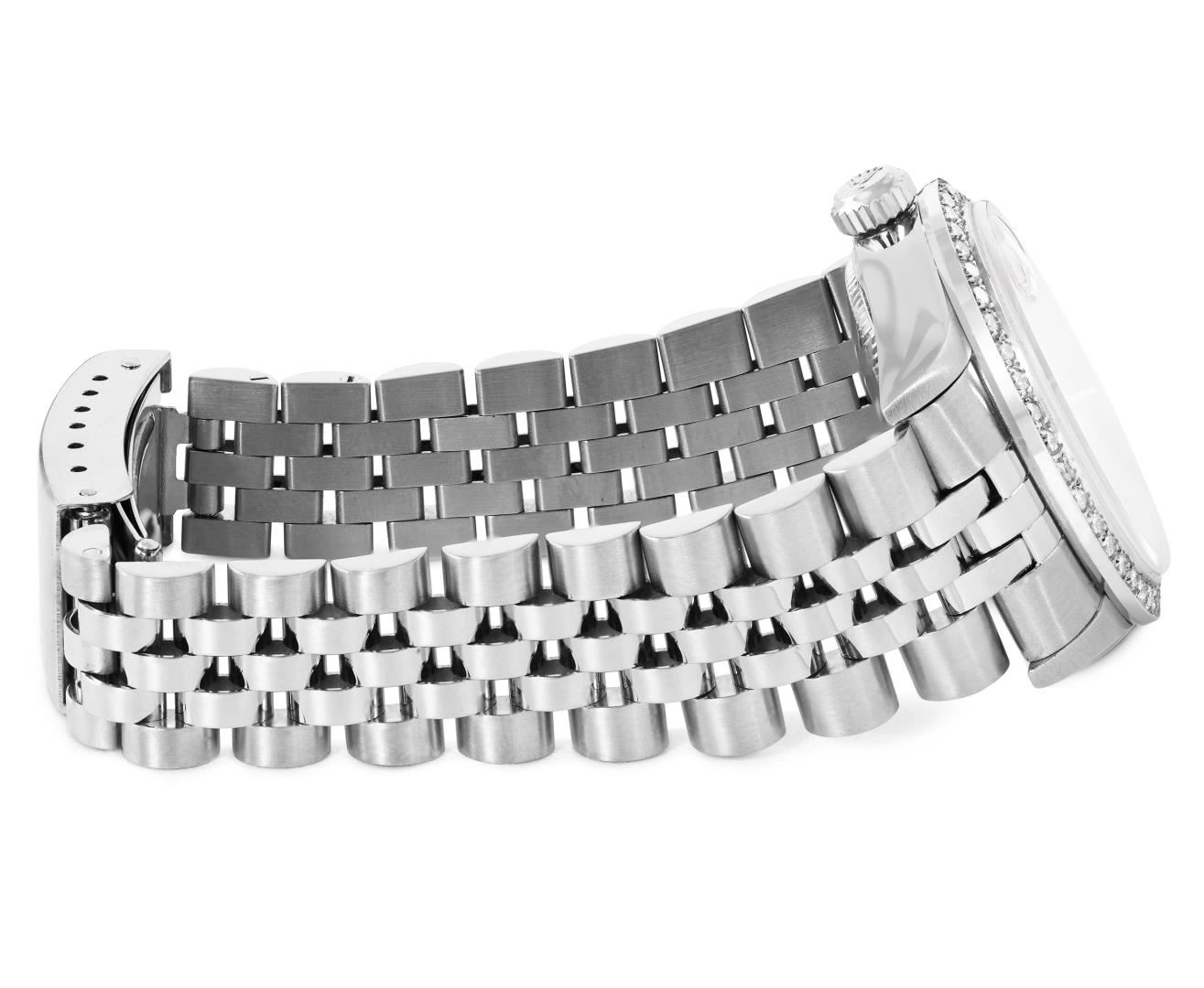 One Rolex Ladies Midsize Pre Owned Stainless Steel 31MM Datejust Wristwatch Polished Bright with Satin Finish, Serviced And Electronically Tested, Stainless Steel Case: 31mm, Stainless Steel Crown, Custom Bezel: New 18K White Gold Beadset Diamond Bezel, Diamond + Gem Count: 40 Diamonds. Custom Crystal: New Sapphire With Magnifying Date Window. Custom Hands: New Hands. Rolex Movement: Automatic Winding Movement 2235. Rolex Dial: Factory Cream Dial With Arabic Hour Markers. Date Window: 3 O'Clock Position Date Display, Model: Quickset Sapphire Datejust. Condition: G-6 Extra Fine. Rolex Bracelet: Stainless Steel Jubilee Band. Bright Polish And Satin Finish. 6.0 Inch Length, Adjustable. Standard Clasp, With Rolex Logo. This Watch Has Been Serviced Time Tested And Is In Excellent Condition It Is Free Of All Scratches And Dents.