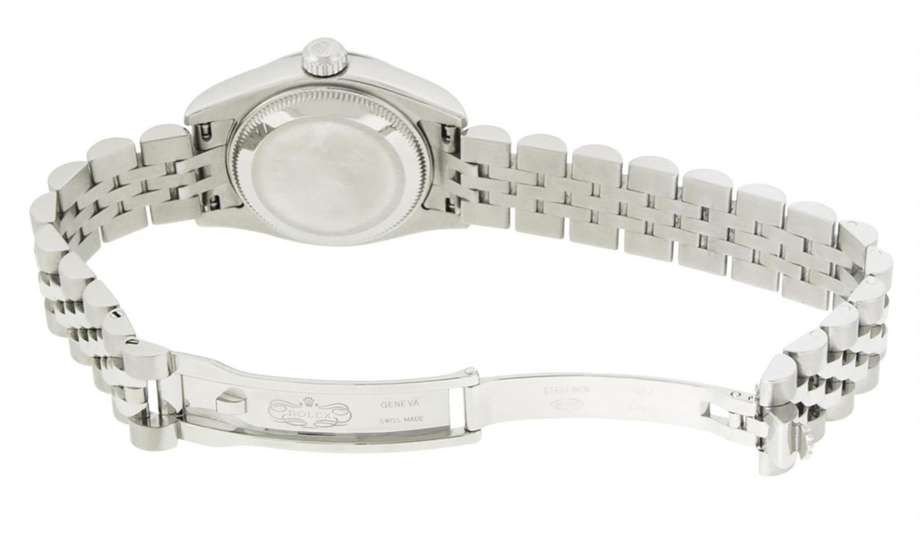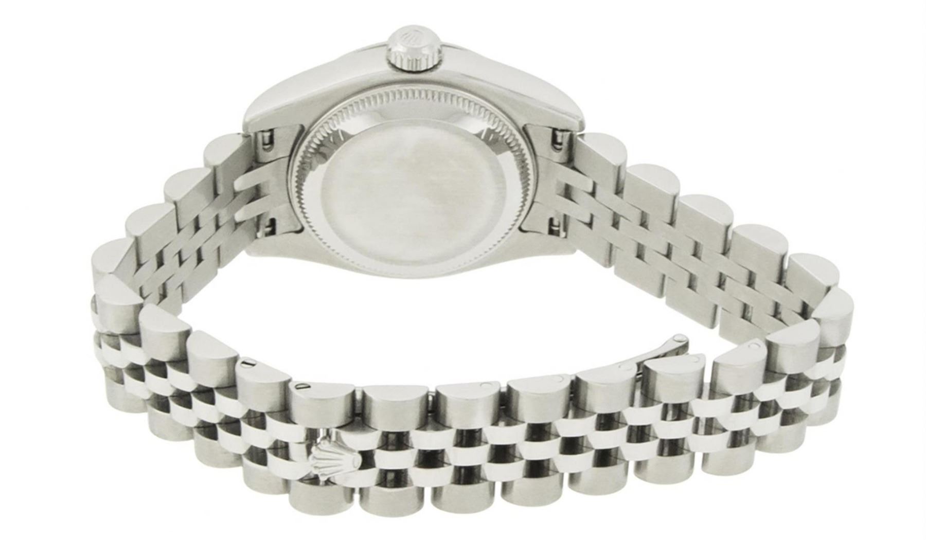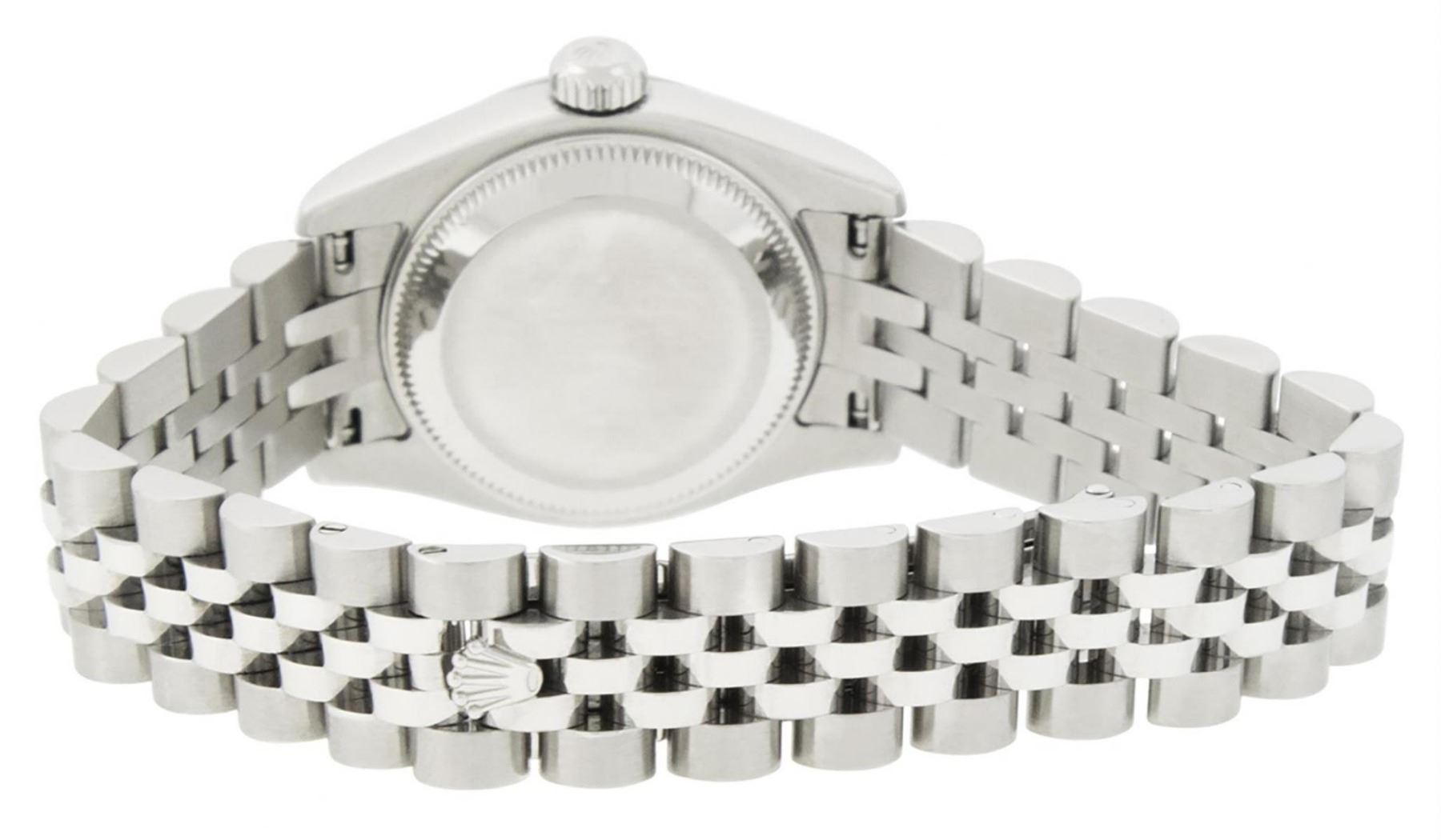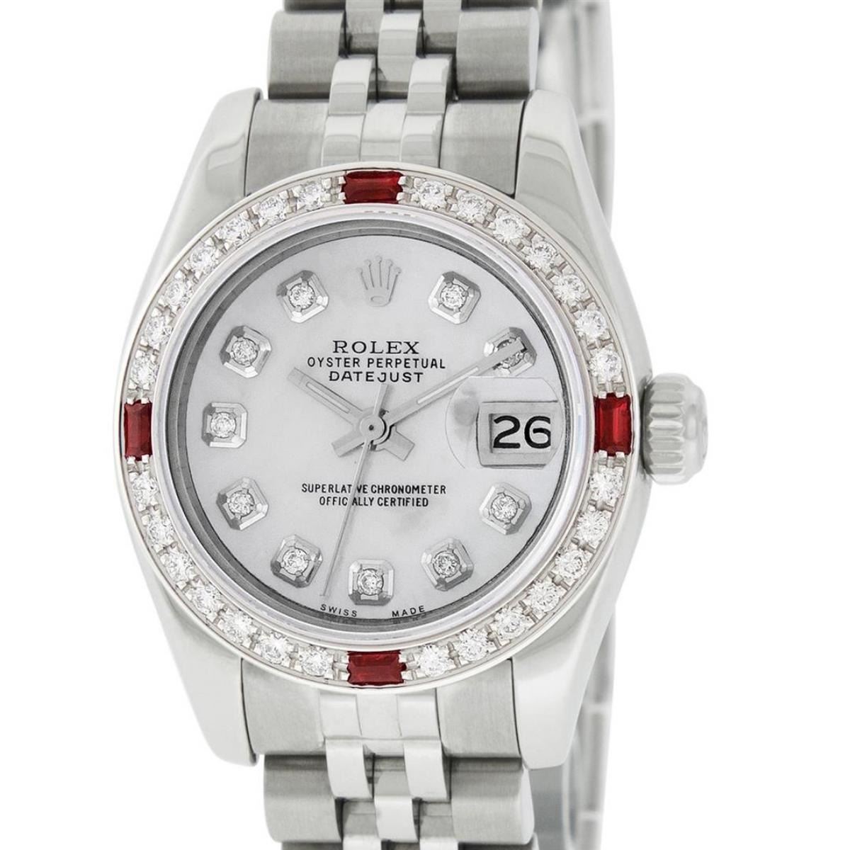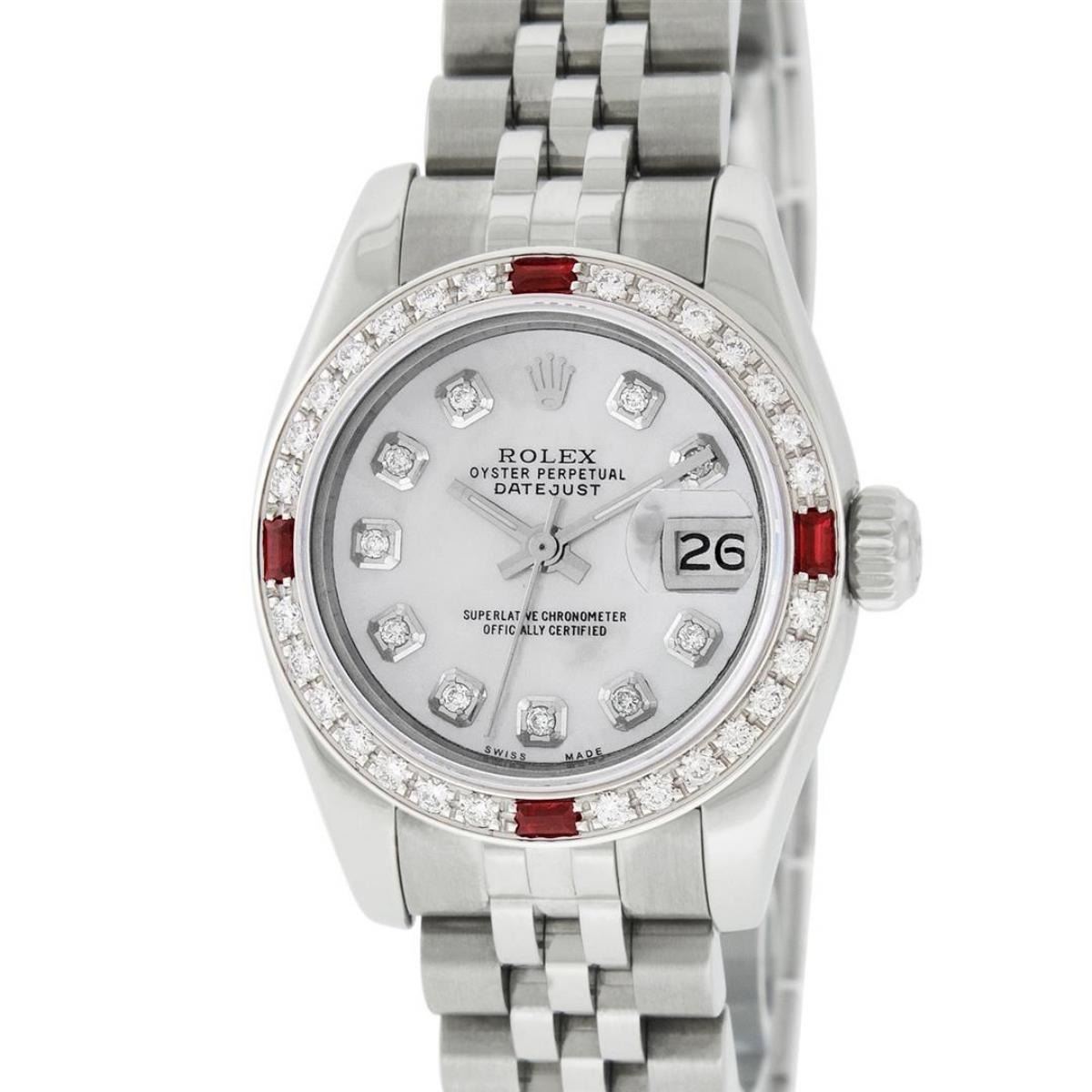 One Quickset Ladies Stainless Steel Rolex Datejust Polished Bright with Satin Finish, Serviced & Electronically Tested, Stainless Steel Case: 26mm, Stainless Steel Crown, Custom Bezel: New 18K White Gold Beadset + Ruby Diamond Bezel, Stone Count: 28 Diamonds + 4 Rubies On Bezel, Total Weight .70 Carat, Clarity: SI-VS, Color: G to H. Custom Crystal: New Scratch Resistant Synthetic Sapphire Cyclops Lens. Custom Hands: New Luminescent Hands. Movement: Automatic Winding Movement. Custom Dial: Refinished Mother Of Pearl Diamond Dial, Stone Count: 10 Diamonds On Dial, G To H In Color, Clarity: VS. Date Window: 3 O'Clock Position Date Display, Model: 179160 Quickjset Datejust. Condition: G-6 Extra Fine. Bracelet: Stainless Steel Jubilee Band. Bright Polish & Satin Finish. 6.0 Inch Length, Adjustable. Standard Clasp, With Rolex Logo. This Watch Has Been Serviced Time Tested And Is In Excellent Condition It Is Free Of All Scratches And Dents.