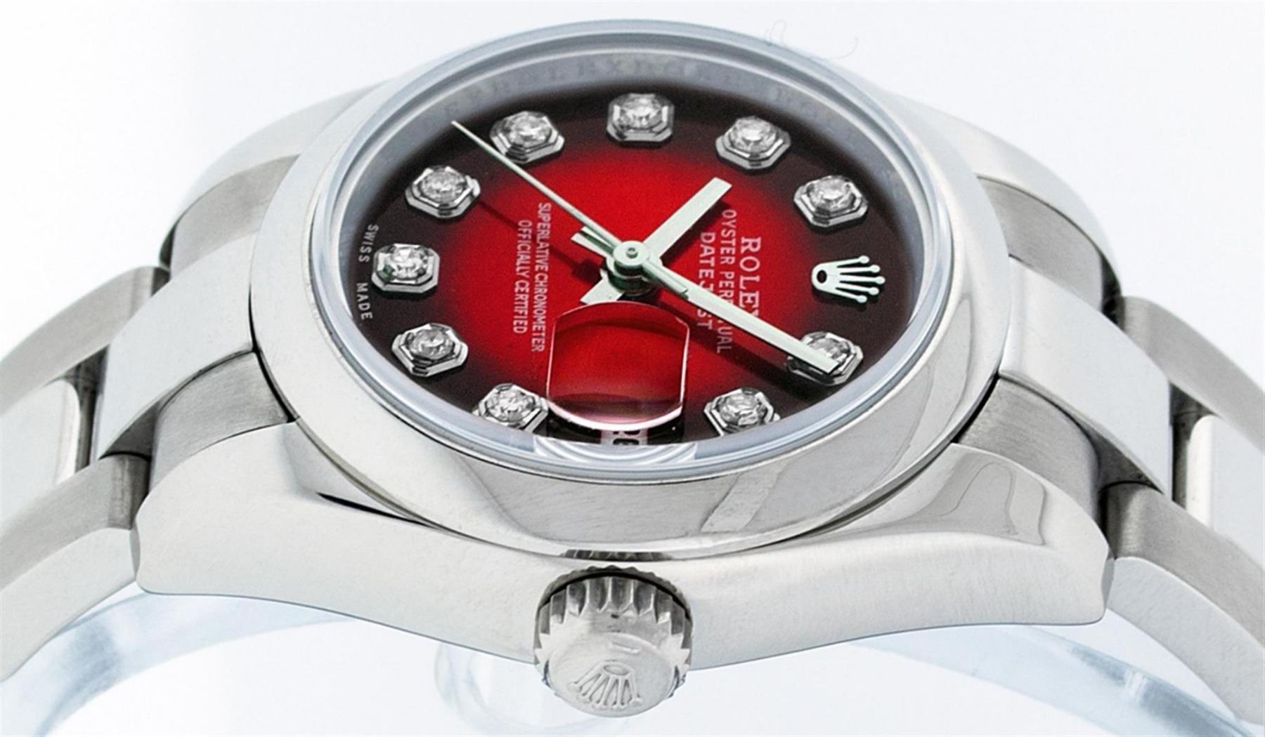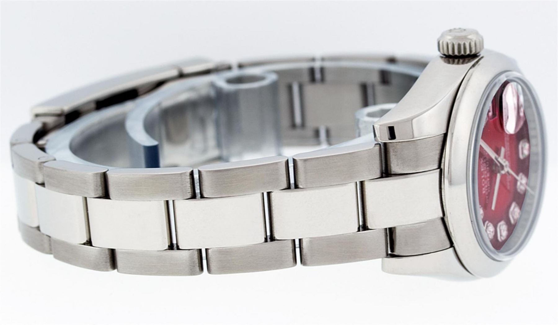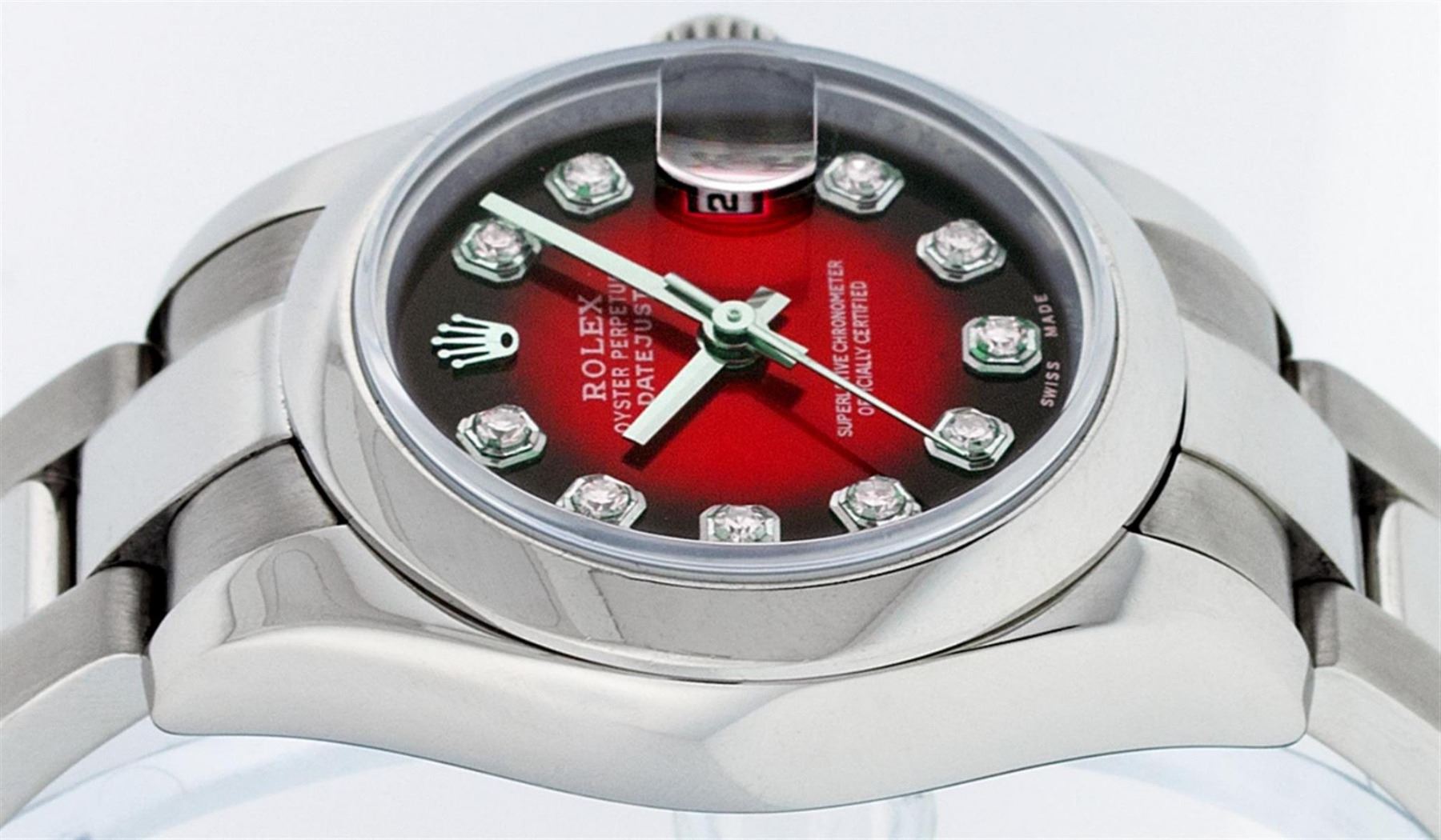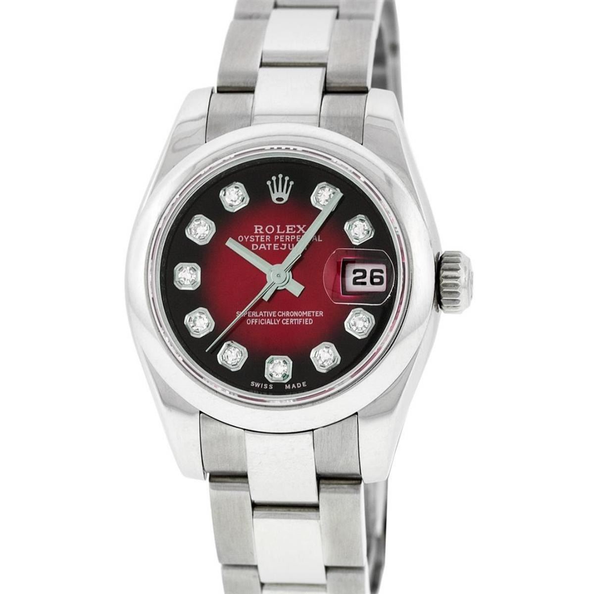 One Ladies Quickset Stainless Steel Rolex Datejust Polished Bright with Satin Finish, Serviced & Electronically Tested, Stainless Steel Case: 26mm, Stainless Steel Crown, Bezel: Stainless Steel Smooth Bezel. Custom Crystal: New Scratch Resistant Sapphire Cyclops Lens. Custom Hands: New Luminescent Hands. Movement: Automatic Winding Movement. Custom Dial: Red Vignette Single Cut VS Diamond Dial, Diamond Count: 10 Single Cut Diamonds In Dial, Color: G to H, Clarity: VS. Date Window: 3 O'Clock Position Date Display, Model: 179160 Quickset Datejust. Condition: G-6 Extra Fine. Bracelet: Stainless Steel Oyster Band. Bright Polish & Satin Finish. 6.0 Inch Length, Adjustable. Standard Clasp, With Rolex Logo. This Watch Has Been Serviced Time Tested And Is In Excellent Condition It Is Free Of All Scratches And Dents. This Watch Comes With A Rolex Box.