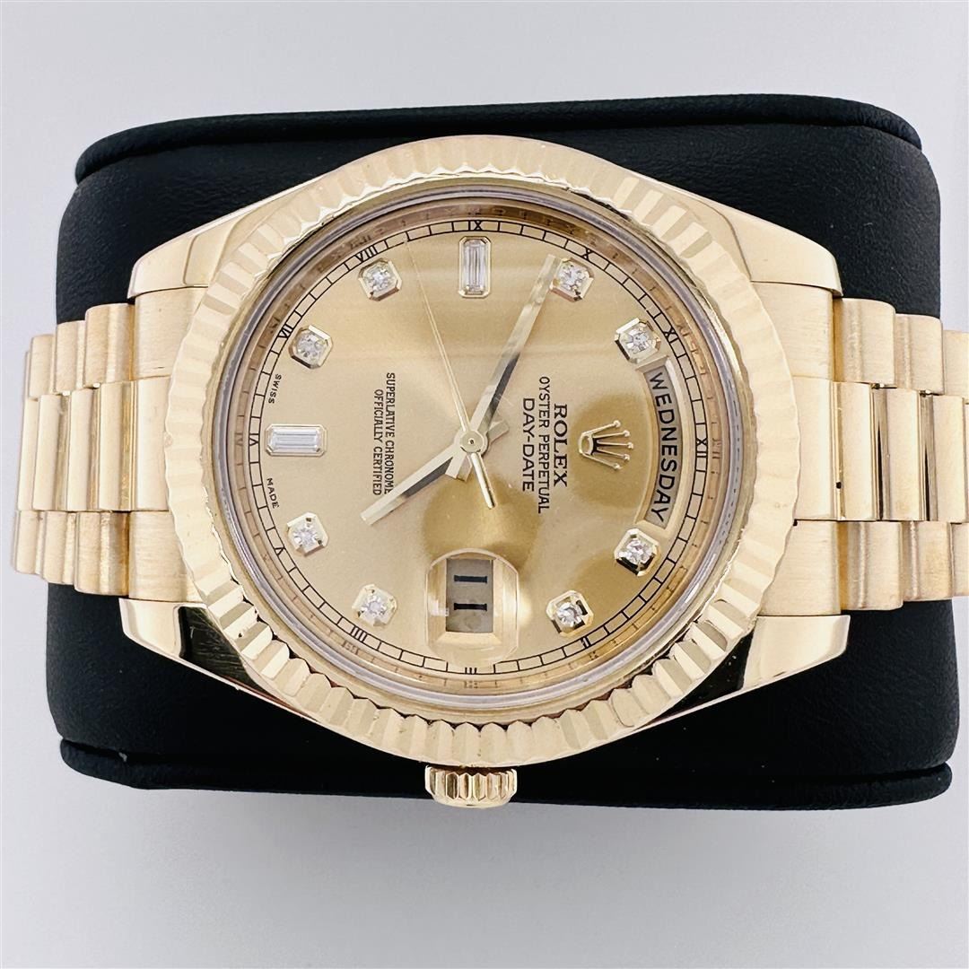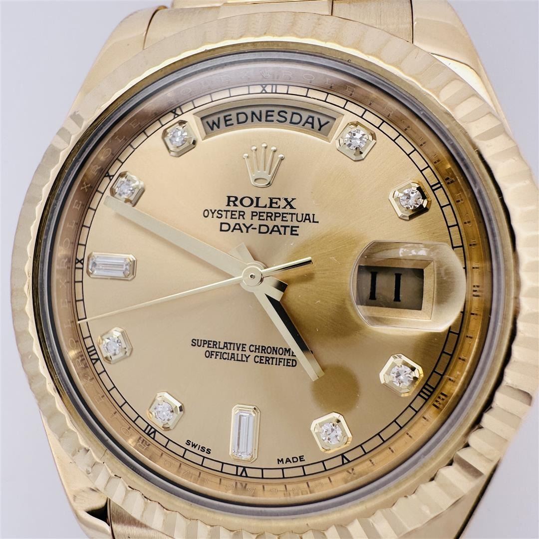 The Rolex Oyster Perpetual Day-Date Wristwatch in Yellow Gold with a Fluted Band epitomizes timeless elegance and precision craftsmanship. Crafted in 18KT Yellow Gold, features a distinctive fluted bezel. The standout feature is the Day-Date complication, showcasing the day spelled out in full below the Cyclops lens magnifying the date at 3 o'clock. The gold dial, adorned with luminescent markers and hands, houses a precise automatic movement. The fluted band offers both style and a comfortable fit. This Rolex Day-Date blends luxurious materials, horological expertise, and classic design, making it a statement piece for all occasions.