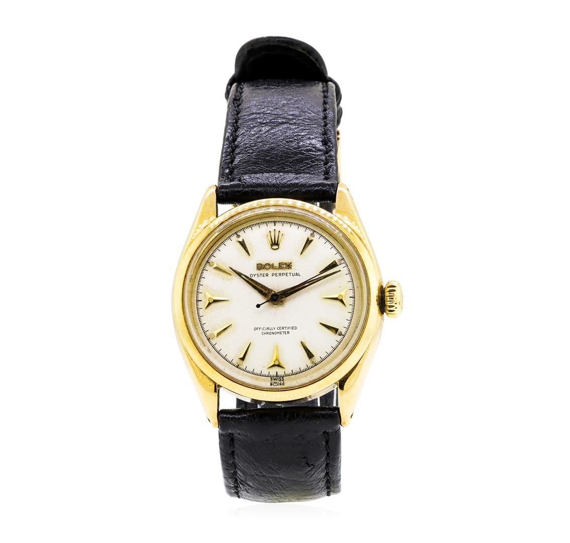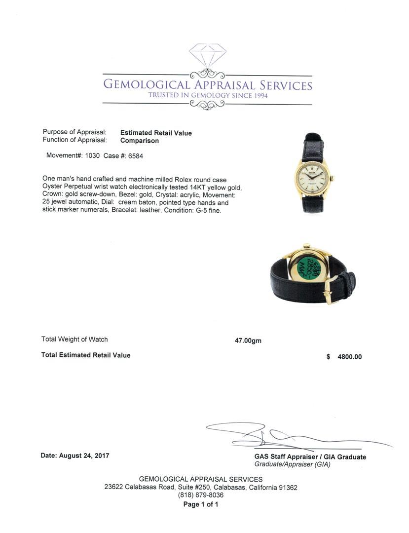 One man's, hand crafted and machine milled Rolex round case Oyster Perpetual wrist watch electronically tested 14KT yellow gold, Crown: gold screw-down, Bezel: gold, Crystal: acrylic, Movement: 25 jewel automatic, Dial: cream baton, pointed type hands and stick marker numerals, Bracelet: leather, Condition: G-5 fine.. Total Weight of Watch 47.00gm GAS Appraised at $4800.00. GAS Appraised.