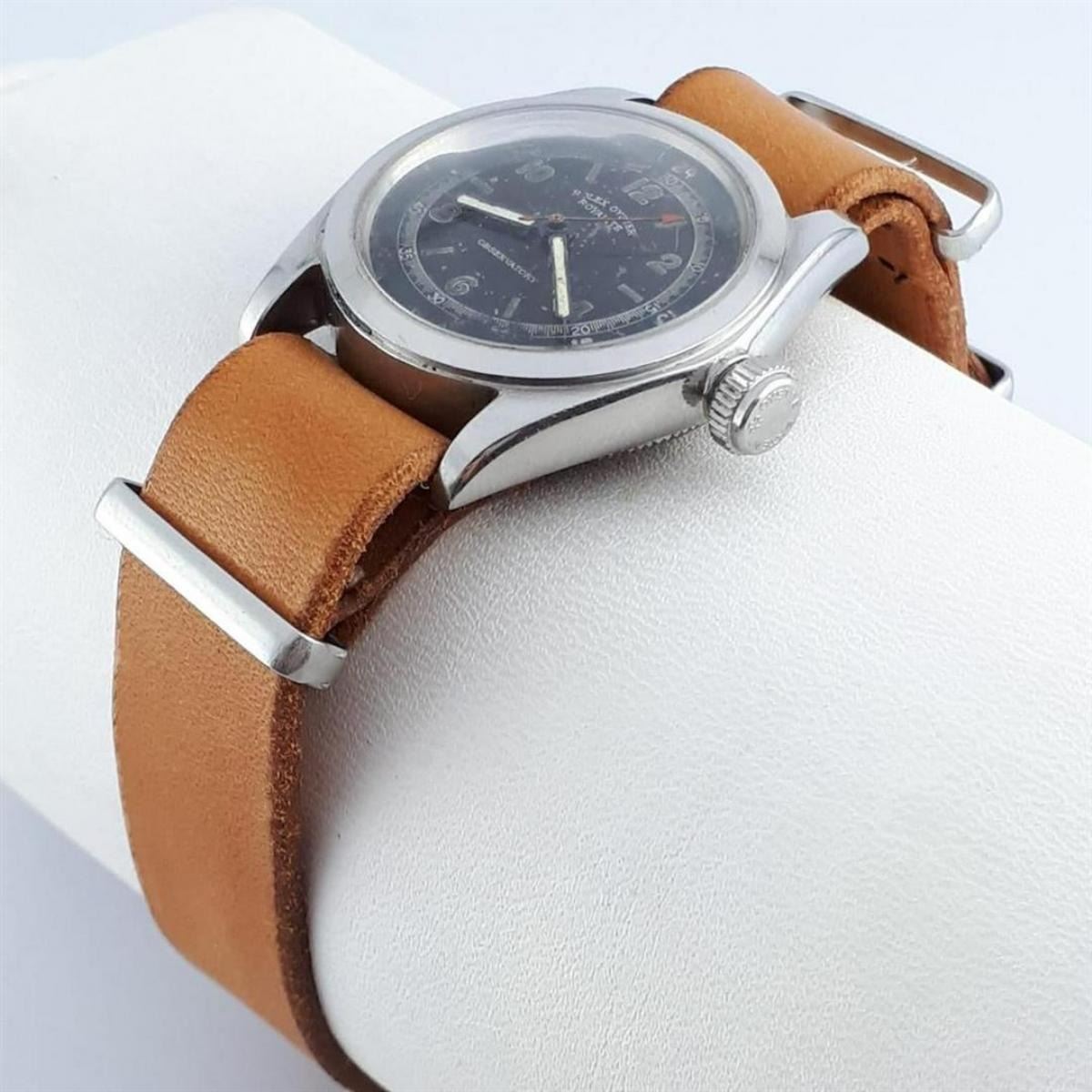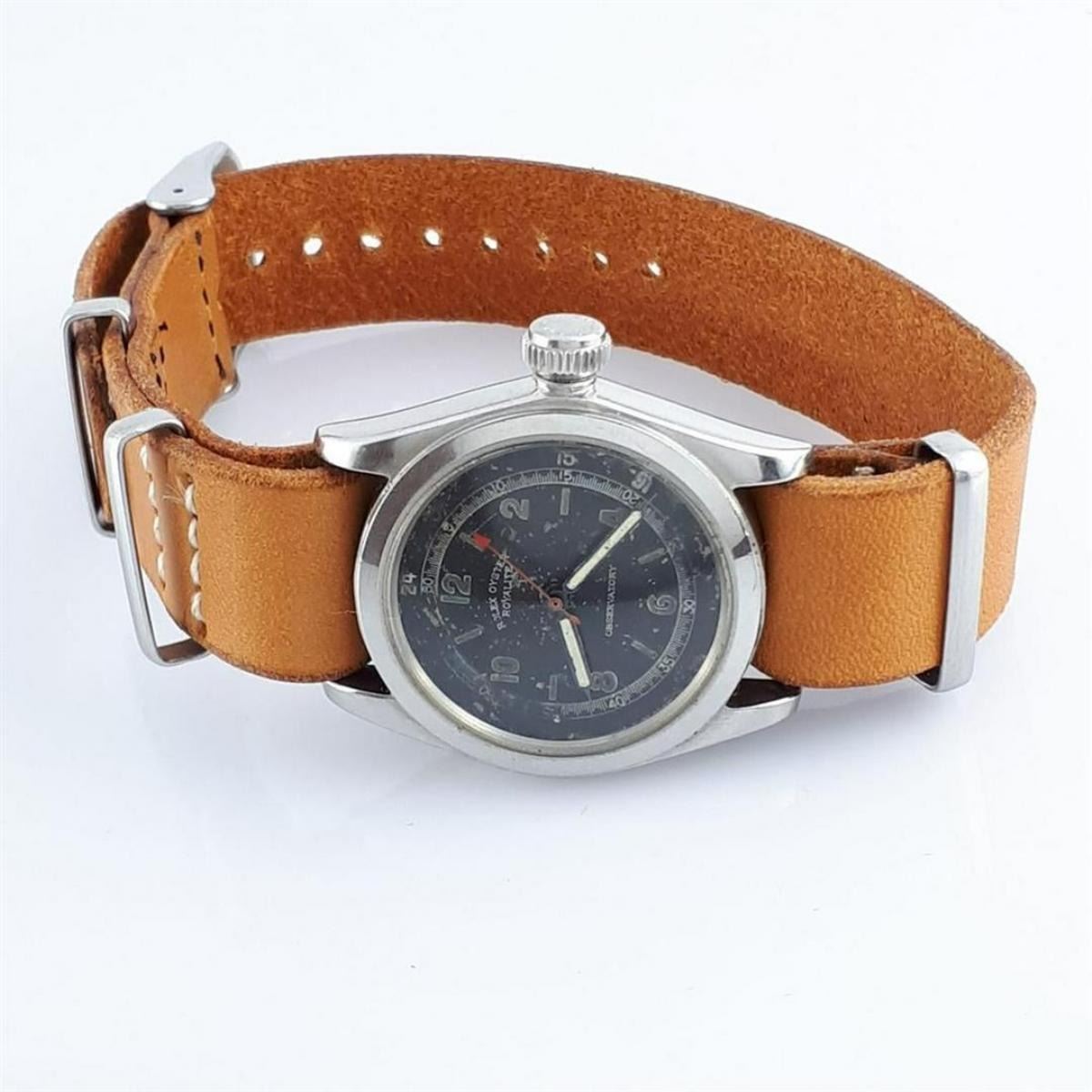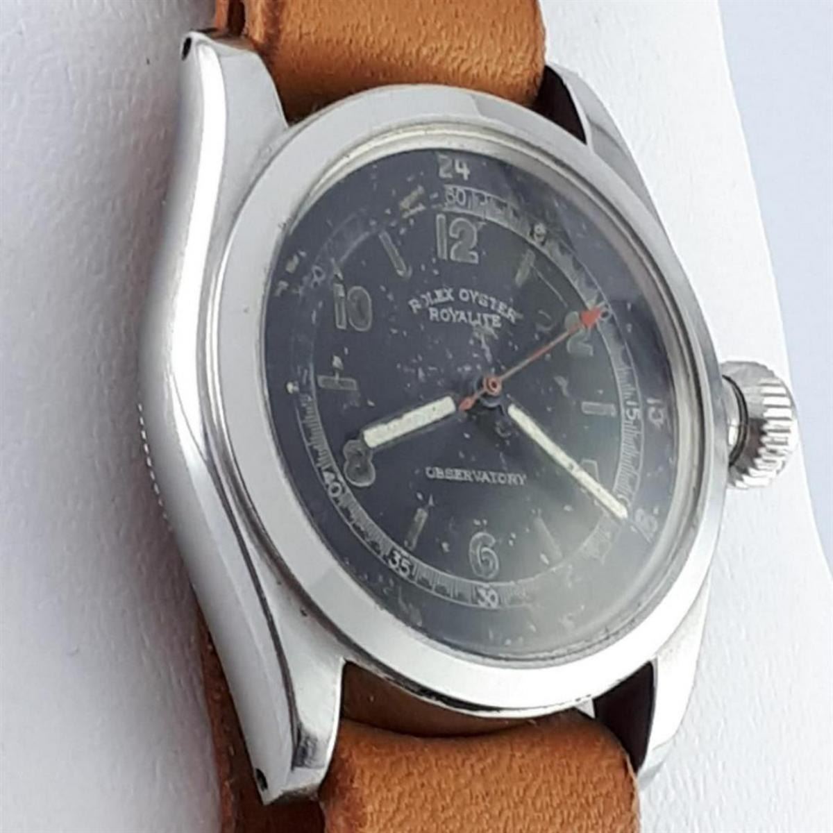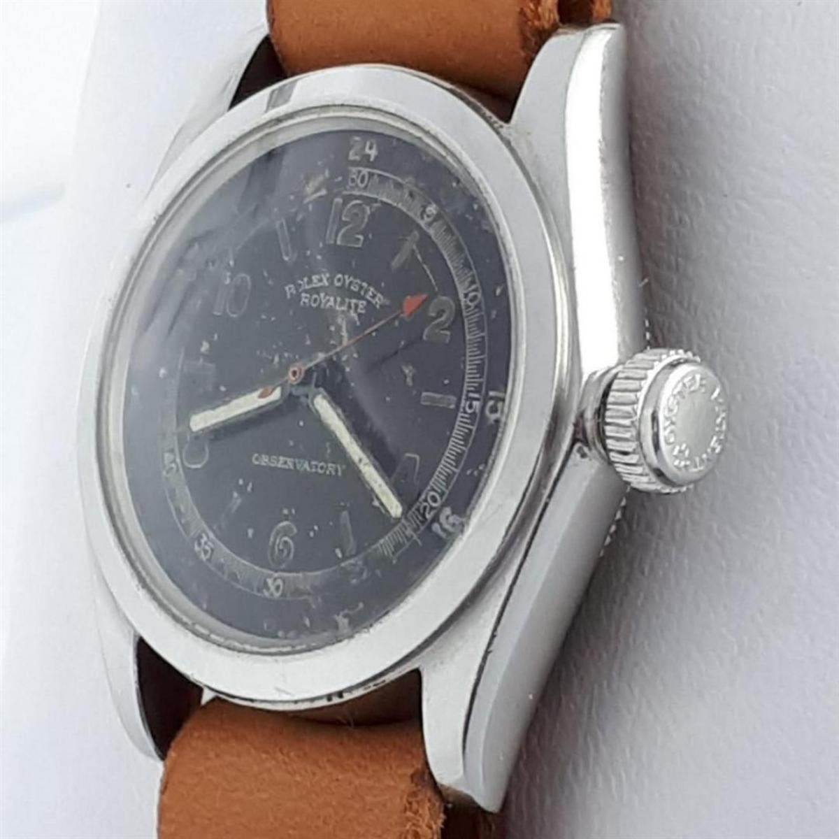 Brand:Rolex, Model:Oyster Royalite Observatory, Gender:Men, Period:1901-1949, Movement:Manual winding, Case material:Steel, Extras:Box, Type:Analogue wristwatch, Shipped Insured:Yes, Condition:In working condition with visible traces of use, Bracelet: Generic Leather Strap, Total Length: 22cm (8.661in), Case Size: 30mm (1.181in) excluding crown