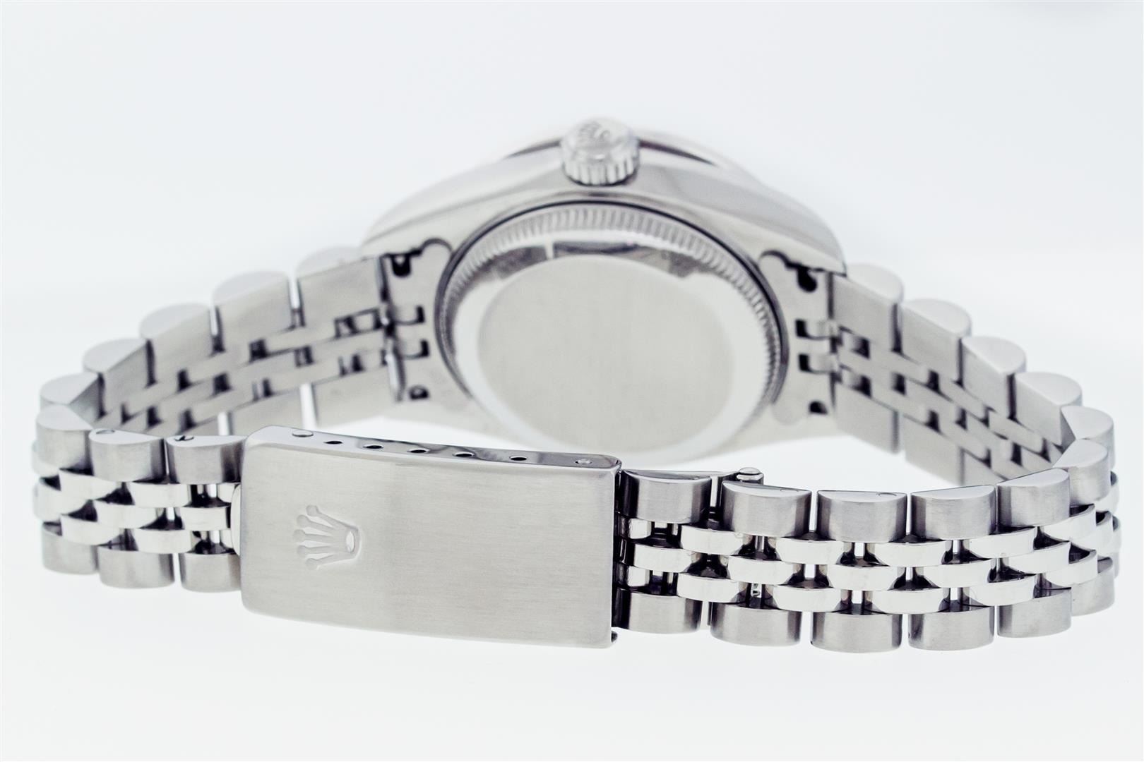 One Ladies Pre Owned Quickset Stainless Steel Rolex Datejust Polished Bright with Satin Finish, Serviced & Electronically Tested, Stainless Steel Case: 26mm, Custom Diamond Lugs: Added Diamonds On Lugs, Diamond Count: 24 Diamonds On Lugs. Rolex Stainless Steel Crown, Custom Bezel: New 18K White Gold Emerald Bead Set Diamond Bezel, Diamond + Gem Count: 28 Diamonds + 4 Emeralds. Custom Crystal: New Sapphire With Magnified Date Window. Custom Hands: New Hands. Rolex Movement: Automatic Winding Movement 2235. Rolex Dial: Blue With Roman Hour Markers & Square Track. Date Window: 3 O'Clock Position Date Display, Model: Quickset Datejust. Condition: G-6 Extra Fine. Rolex Bracelet: Stainless Steel Jubilee Band. Bright Polish & Satin Finish. 6.0 Inch Length, Adjustable. Standard Clasp, With Rolex Logo. This Watch Has Been Serviced Time Tested And Is In Excellent Condition It Is Free Of All Scratches And Dents.