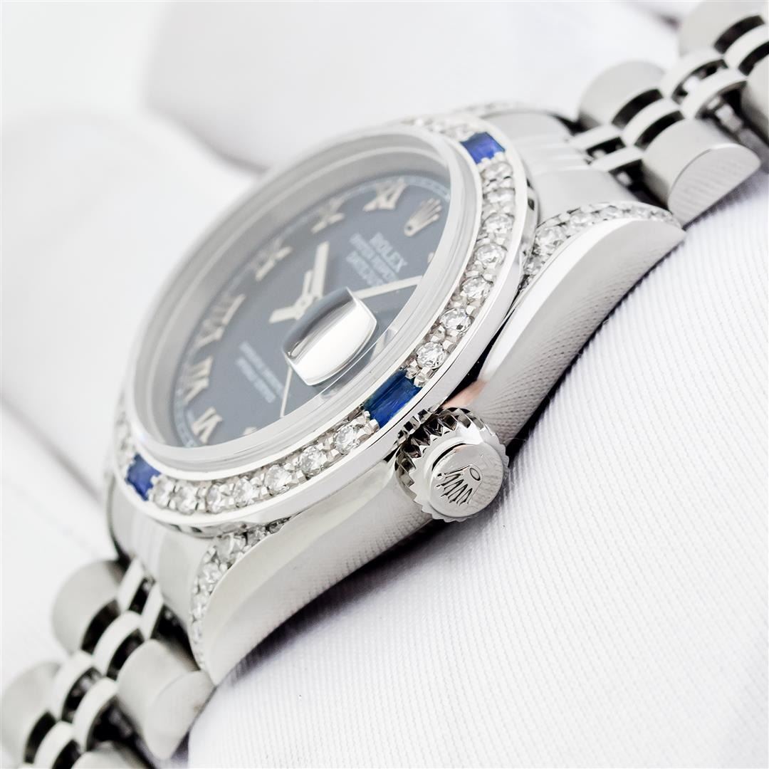 One Ladies Pre Owned Quickset Stainless Steel Rolex Datejust Polished Bright with Satin Finish, Serviced & Electronically Tested, Stainless Steel Case: 26mm, Custom Diamond Lugs: Added Diamonds On Lugs, Diamond Count: 24 Diamonds On Lugs. Rolex Stainless Steel Crown, Custom Bezel: New 18K White Gold Sapphire Bead Set Diamond Bezel, Diamond + Gem Count: 28 Diamonds + 4 Sapphires. Custom Crystal: New Sapphire With Magnified Date Window. Custom Hands: New Hands. Rolex Movement: Automatic Winding Movement 2235. Rolex Dial: Blue With Roman Hour Markers & Square Track. Date Window: 3 O'Clock Position Date Display, Model: Quickset Datejust. Condition: G-6 Extra Fine. Rolex Bracelet: Stainless Steel Jubilee Band. Bright Polish & Satin Finish. 6.0 Inch Length, Adjustable. Standard Clasp, With Rolex Logo. This Watch Has Been Serviced Time Tested And Is In Excellent Condition It Is Free Of All Scratches And Dents.