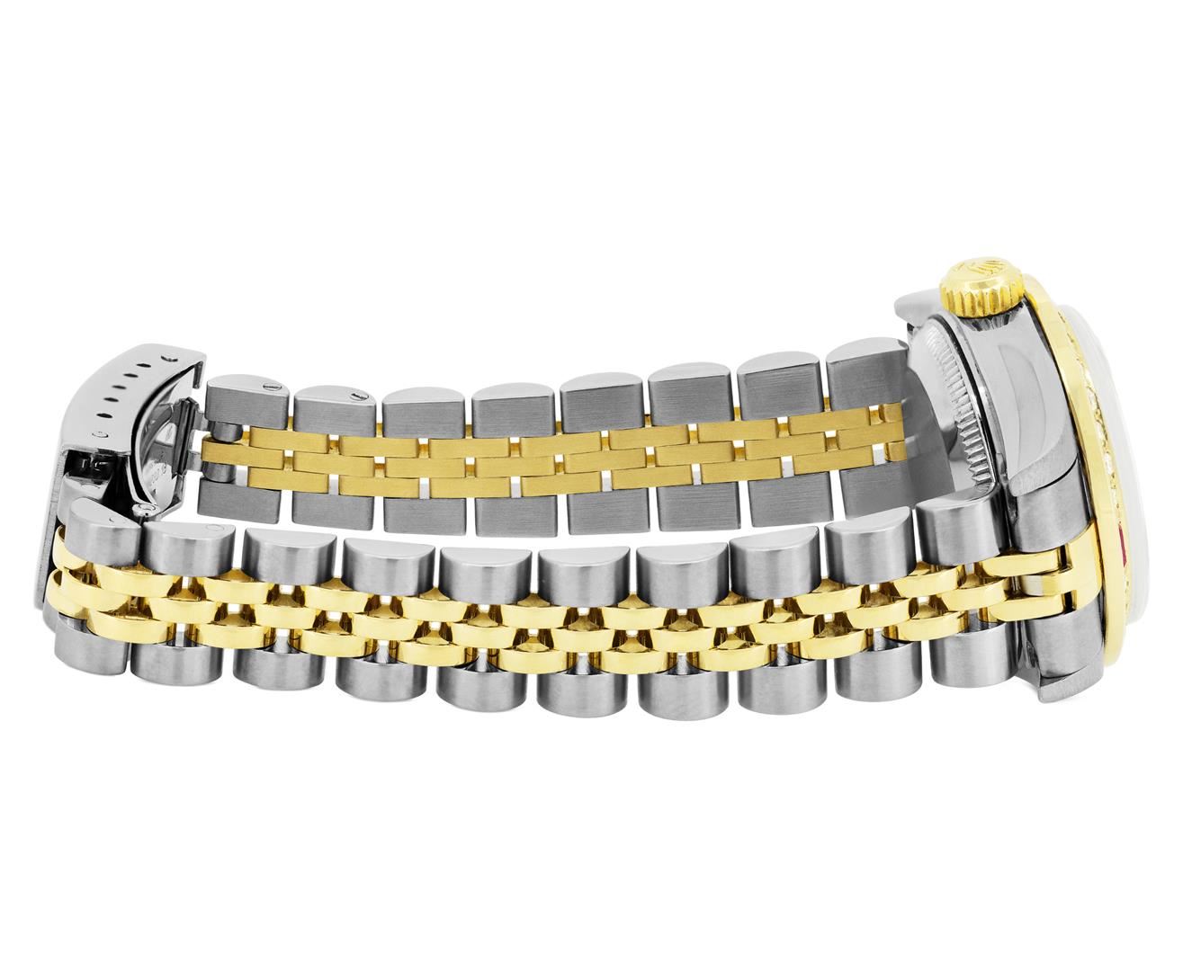 One Rolex Ladies Pre Owned Two Tone 18K Yellow Gold & Stainless Steel Rolex Datejust Polished, Serviced & Electronically Tested, Rolex Yellow Gold & Stainless Steel Case: 26mm, Rolex Yellow Gold Crown, Custom Bezel: New 18K Yellow Gold Ruby Beadset Diamon