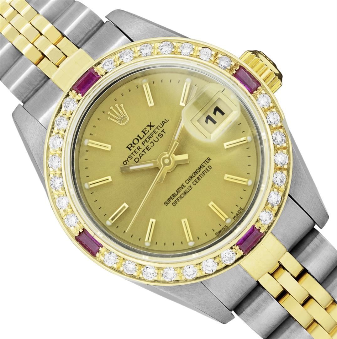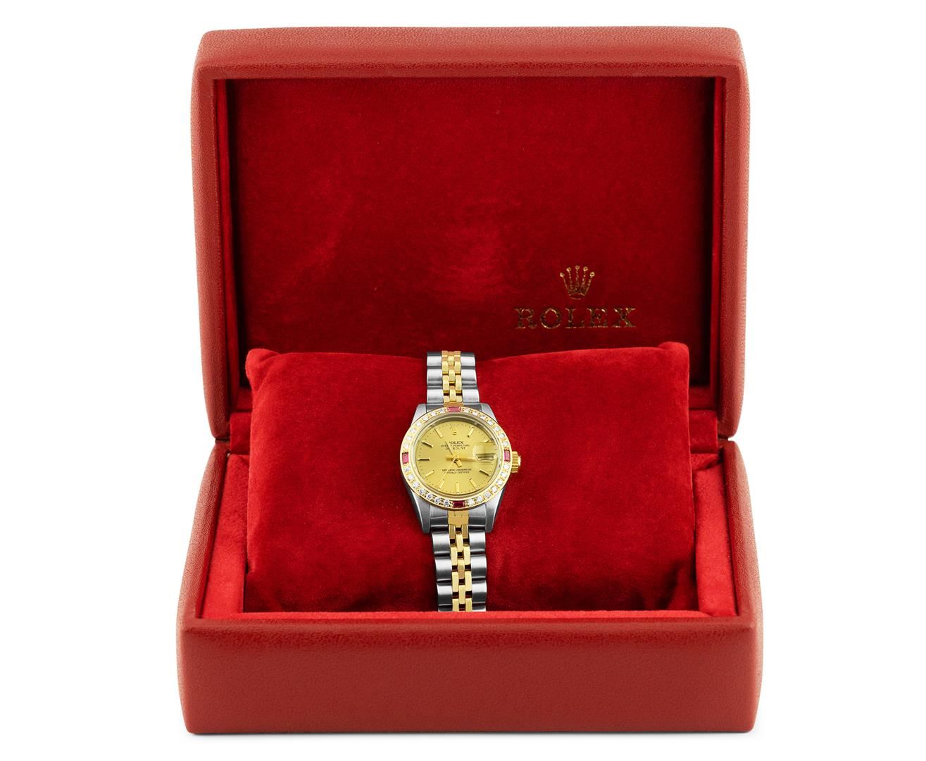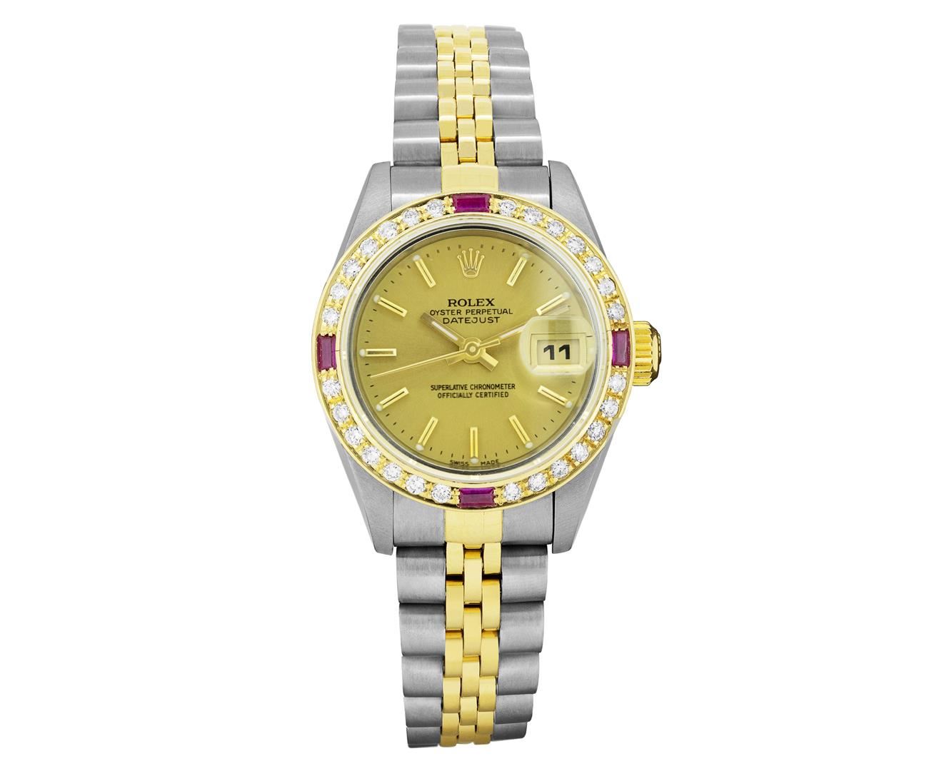One Rolex Ladies Pre Owned Two Tone 18K Yellow Gold & Stainless Steel Rolex Datejust Polished, Serviced & Electronically Tested, Rolex Yellow Gold & Stainless Steel Case: 26mm, Rolex Yellow Gold Crown, Custom Bezel: New 18K Yellow Gold Ruby Beadset Diamond Bezel, Diamond + Gem Count: 36 Diamonds + 4 Rubies, Clarity: SI-VS, Color: G to H. Custom Crystal: New Sapphire With Magnifying Date Window. Hands: Luminescent Hands. Rolex Movement: 2235 Automatic Winding Quickset Movement. Rolex Factory Dial: Champagne Dial With Index Hour Markers, Dash Track, and Lumi Dots. Date Window: 3 O'Clock Position Date Display, Condition: G-6 Extra Fine. Rolex Bracelet: Two Tone 18K Yellow Gold & Stainless Steel Jubilee Band. Bright Polish & Satin Finish. 6.0 Inch Length, Adjustable. Fold Clasp, With Rolex Logo. This Watch Has Been Serviced And Time Tested. It Is In Excellent Condition, Free Of All Scratches And Dents. This Watch Comes With A Rolex Box.