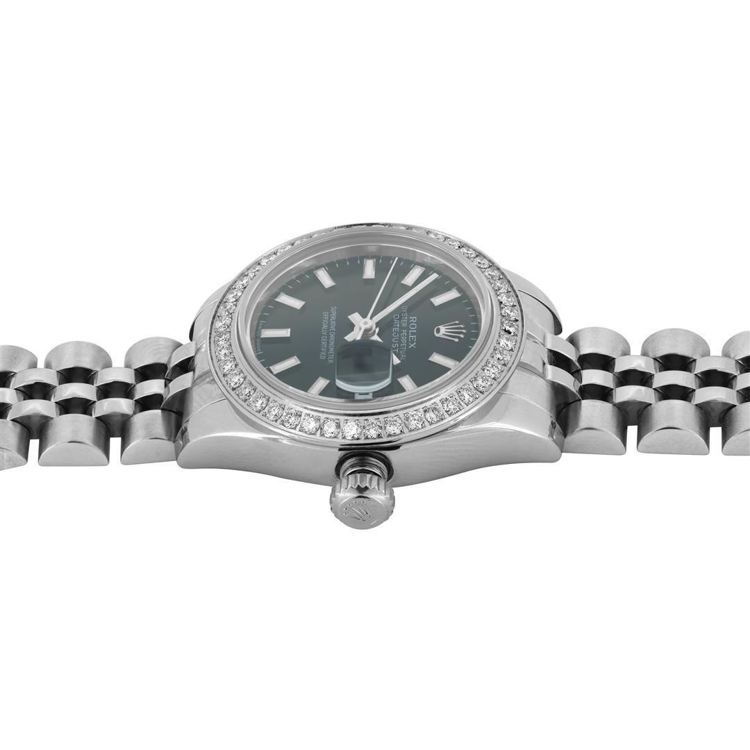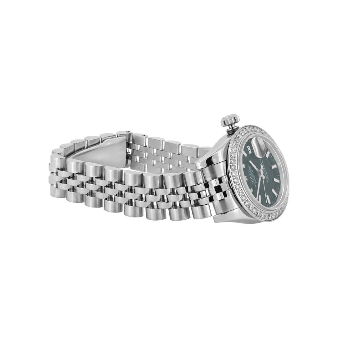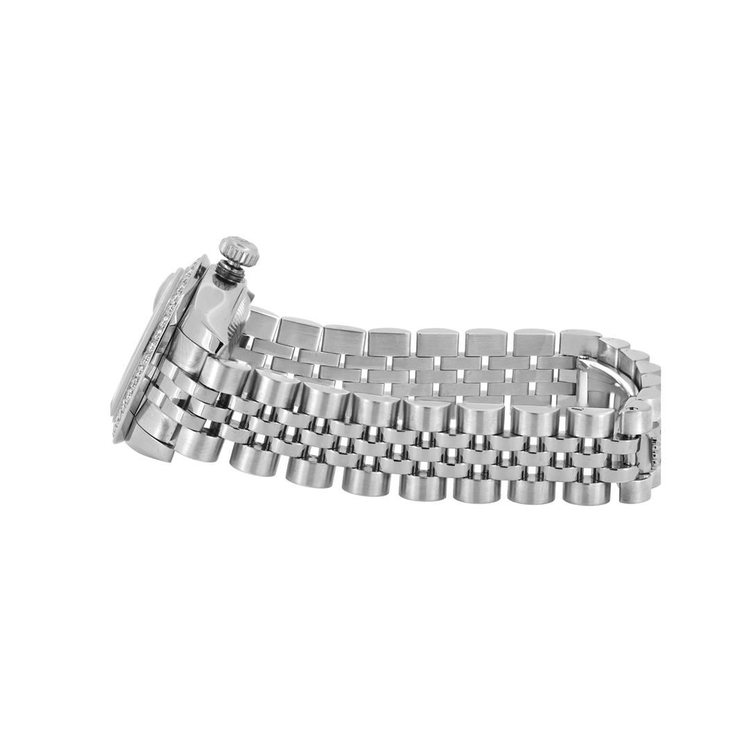 One Rolex Ladies Sapphire Quickset Pre Owned Stainless Steel Datejust Wristwatch Polished Bright with Satin Finish, Serviced & Electronically Tested, Stainless Steel Case: 26mm, Stainless Steel Crown, Custom Bezel: New Stainless Steel Beadset Diamond Bezel, Diamond Count: 40 Diamonds On Bezel. Crystal: Sapphire With Magnified Date Window. Hands: Luminescent Hands. Rolex Movement: 2235 Automatic Winding Movement. Rolex Dial: Factory Black Luminescent Dial With Index Hour Markers. Date Window: 3 O'Clock Position Date Display, Model: Sapphire Quickset Datejust. Condition: G-6 Extra Fine. Rolex Bracelet: Stainless Steel Jubilee Band With Hidden Clasp. Bright Polish & Satin Finish. 6.0 Inch Length, Adjustable. Hidden Clasp, With Rolex Logo. This Watch Has Been Serviced And Time Tested. It Is In Excellent Condition, Free Of All Scratches And Dents.