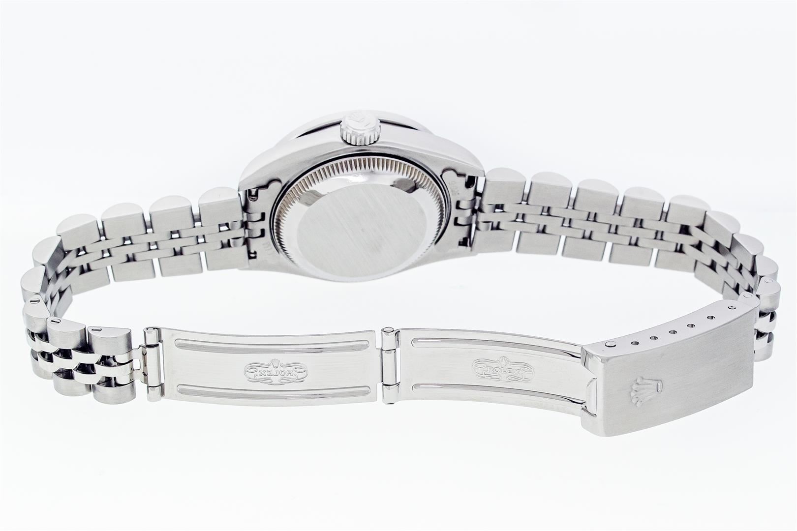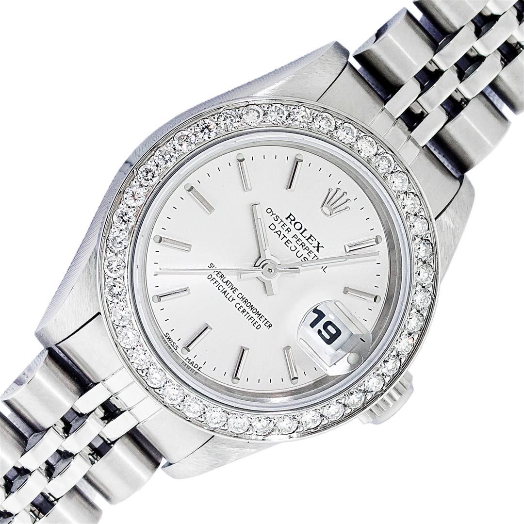 One Ladies Pre Owned Stainless Steel Rolex Datejust Polished Bright with Satin Finish, Serviced & Electronically Tested, Stainless Steel Case: 26mm, Rolex Stainless Steel Crown, Custom Bezel: New Stainless Steel Diamond Bezel, Diamond Count: 40 Diamonds On Bezel. Custom Crystal: New Sapphire With Magnified Date Window. Custom Hands: New Luminescent Hands. Rolex Movement: Automatic Winding Quickset Movement 2235. Rolex Dial: Silver With Index Hour Markers And Lumi Dots. Date Window: 3 O'Clock Position Date Display, Model: Quickset Datejust. Condition: G-6 Extra Fine. Rolex Bracelet: Stainless Steel Jubilee Band. Bright Polish & Satin Finish. 6.0 Inch Length, Adjustable. Standard Clasp, With Rolex Logo. This Watch Has Been Serviced Time Tested And Is In Excellent Condition It Is Free Of All Scratches And Dents.