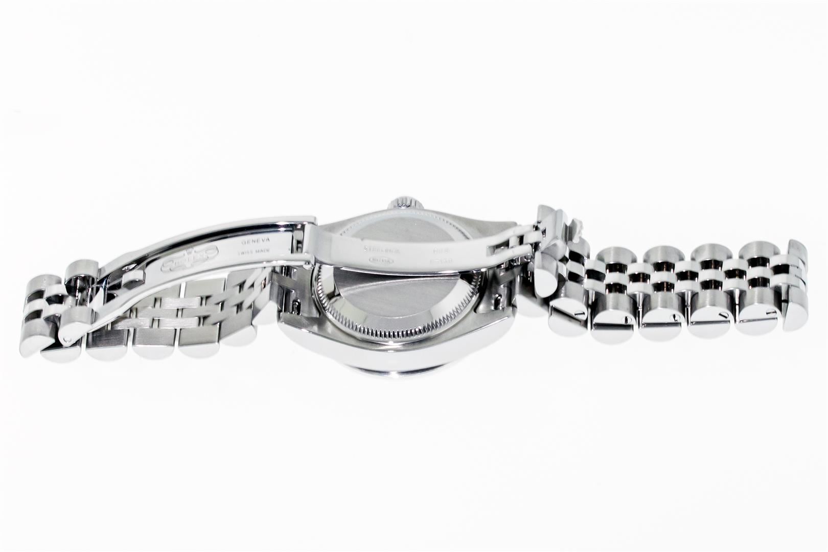 One Ladies Pre Owned Quickset Sapphire Stainless Steel Rolex Datejust Polished Bright with Satin Finish, Serviced & Electronically Tested, Rolex Stainless Steel Case: 26mm, Rolex Stainless Steel Crown, Custom Bezel: New 18K White Gold Diamond & Sapphire Bezel, Stone Count: 28 Diamonds + 4 Sapphires. Crystal: Sapphire With Magnified Date Window. Hands: Luminescent Hands. Rolex Movement: Automatic Winding Movement 2235. Rolex Dial: White Index With Dash Track. Date Window: 3 O'Clock Position Date Display, Model: Quickset Datejust. Condition: G-6 Extra Fine. Rolex Bracelet: Stainless Steel Jubilee Band. Bright Polish & Satin Finish. 6.0 Inch Length, Adjustable. Hidden Clap, With Rolex Logo. This Watch Has Been Serviced Time Tested And Is In Excellent Condition It Is Free Of All Scratches And Dents.